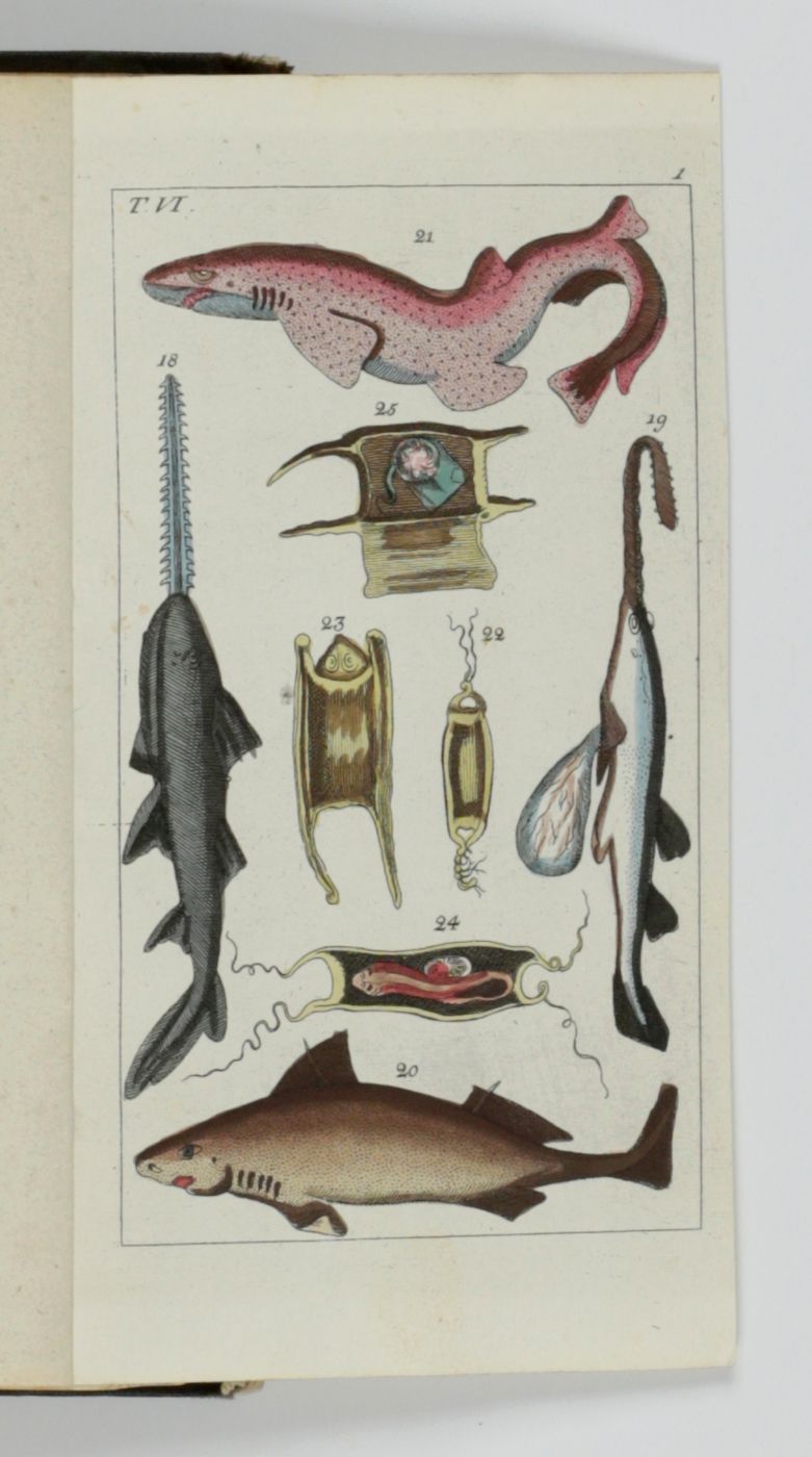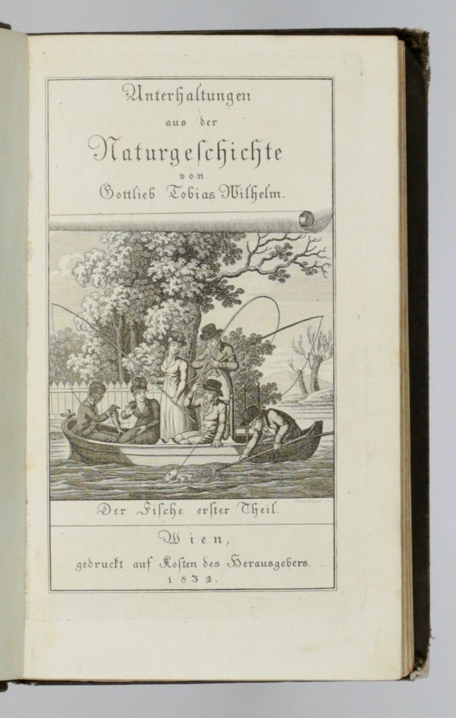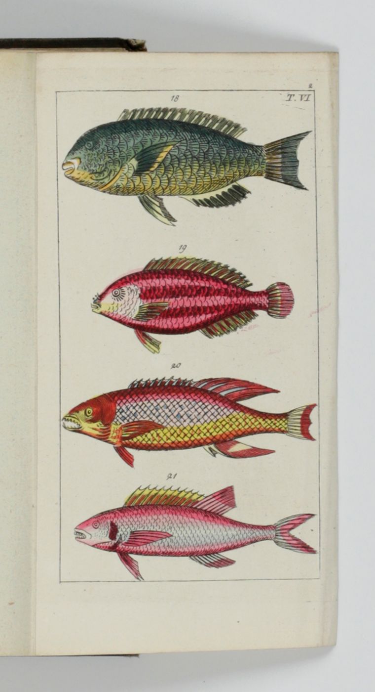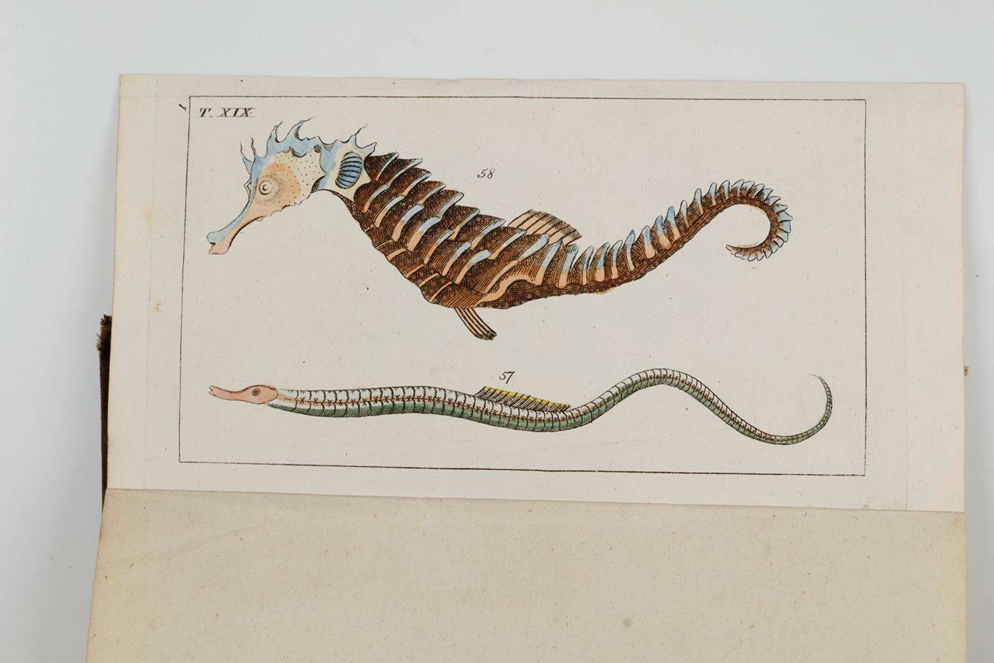 The complete ichthyology, and fishing, of a series of natural history works titled "Natural History stories", renowned for its plates, as much as for its texts, if not more so. Written by the German naturalist Gottlieb Tobias Wilhelm (1758-1811). This is the complete, second, unaltered edition, printed in Vienna. Many plates do not only show fish species, but also fishermen in action, showing different fishing techniques, e.g., trawling. A French edition was published too. Provenance: pictorial bookplate of the Swiss zoologist Christian Sigrist mounted on the front pastedowns. Boards with some light age-wear. Minimal spotting, here and there; the plates clean. The colouring is strong and very bright. Dean II, p. 630; Nissen ZBI 4408.