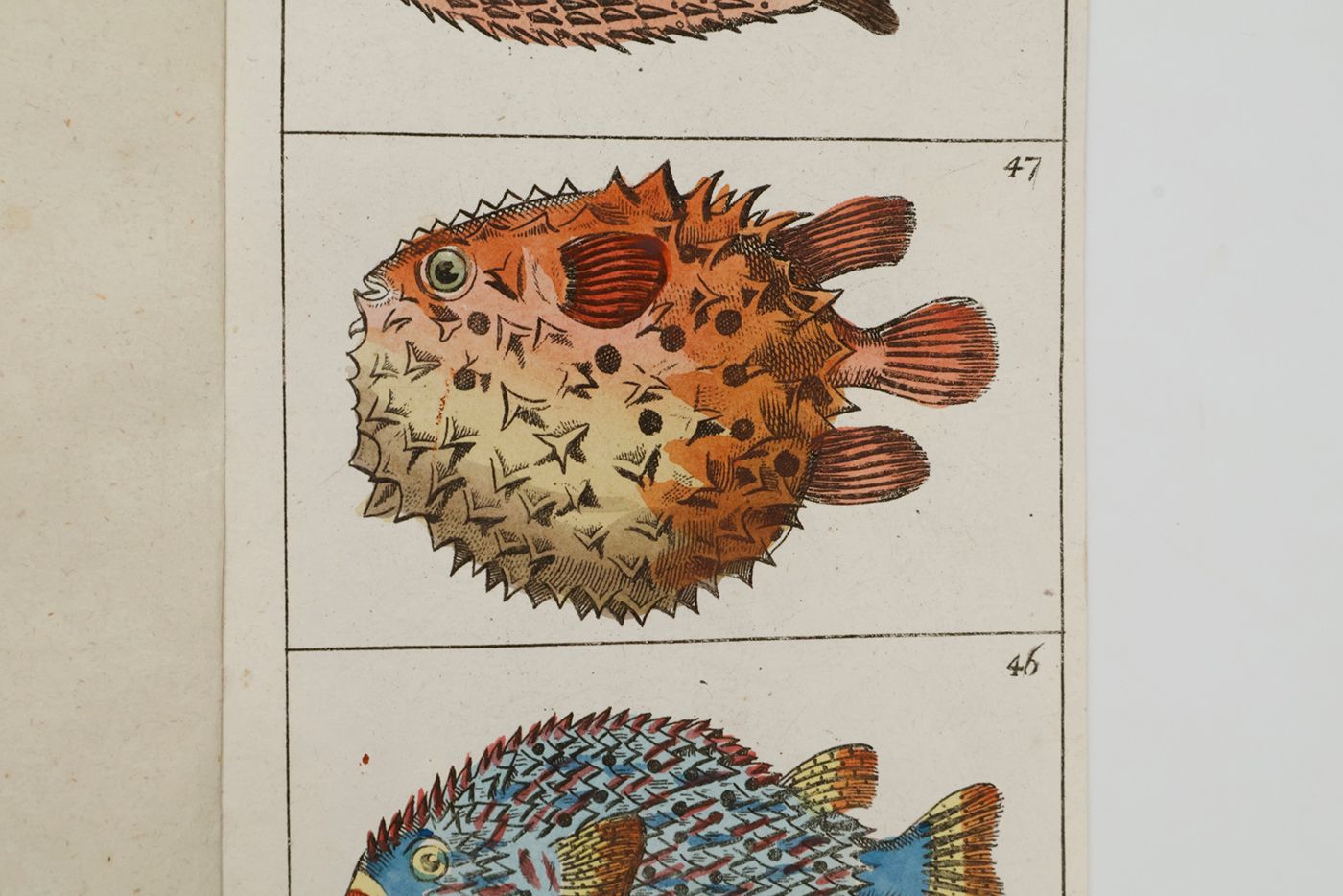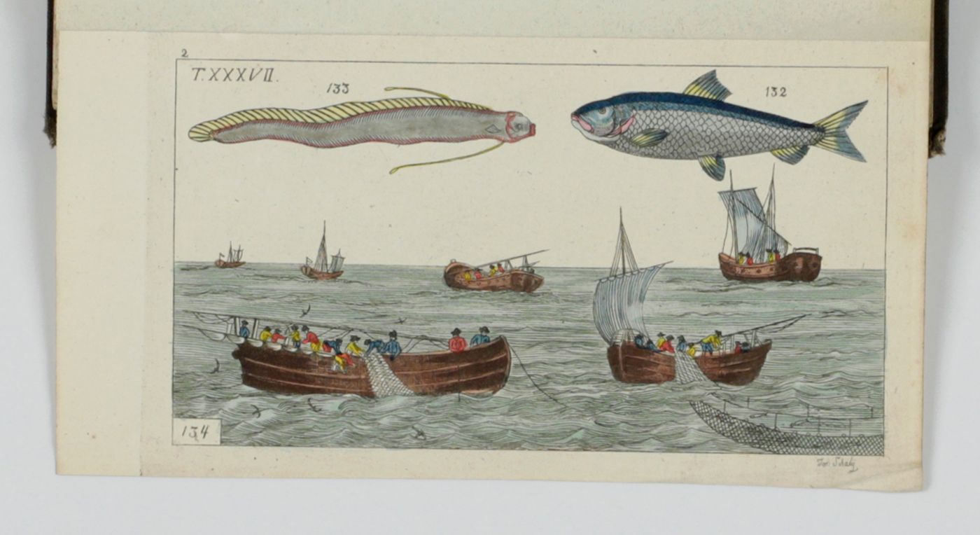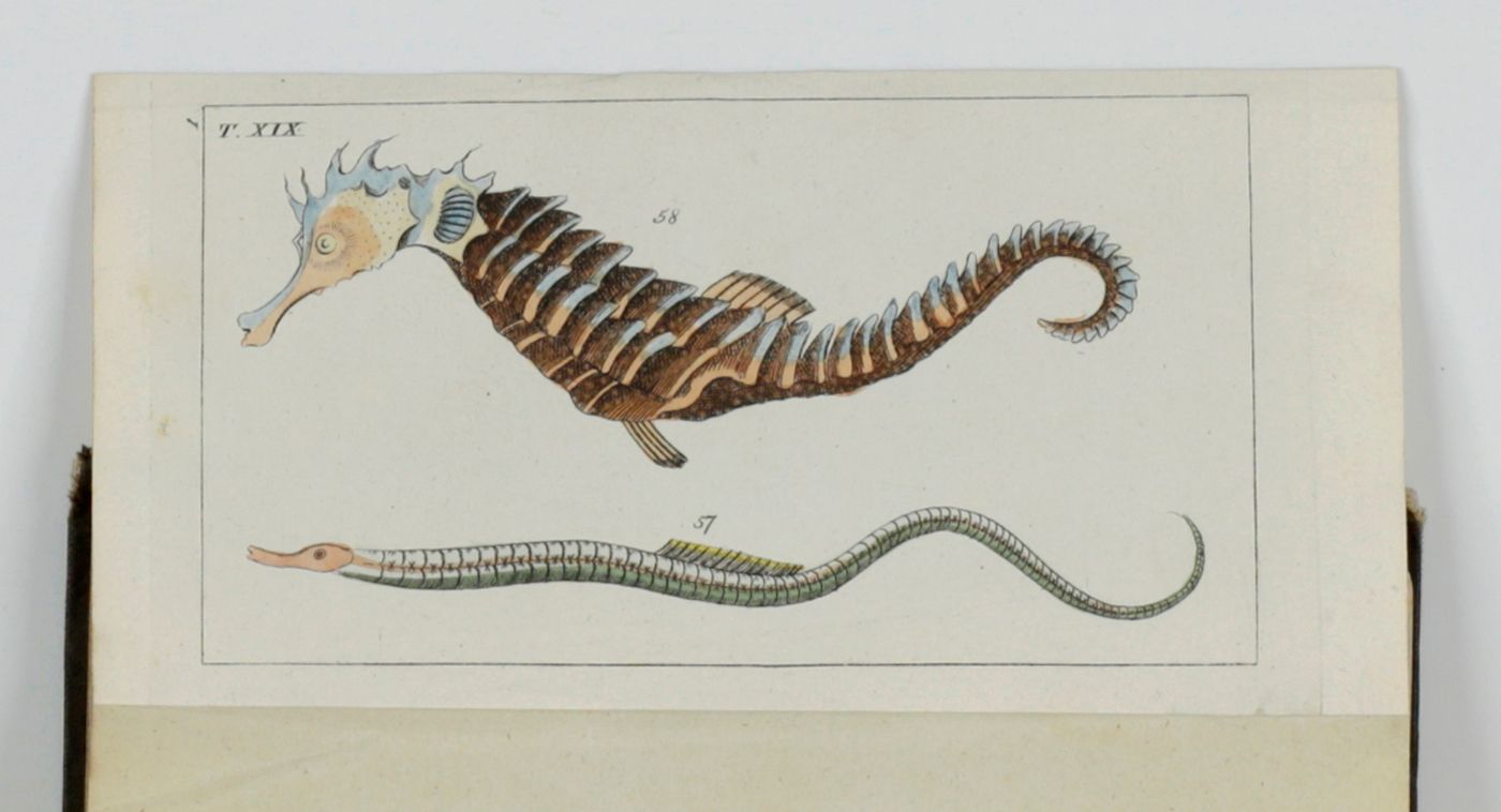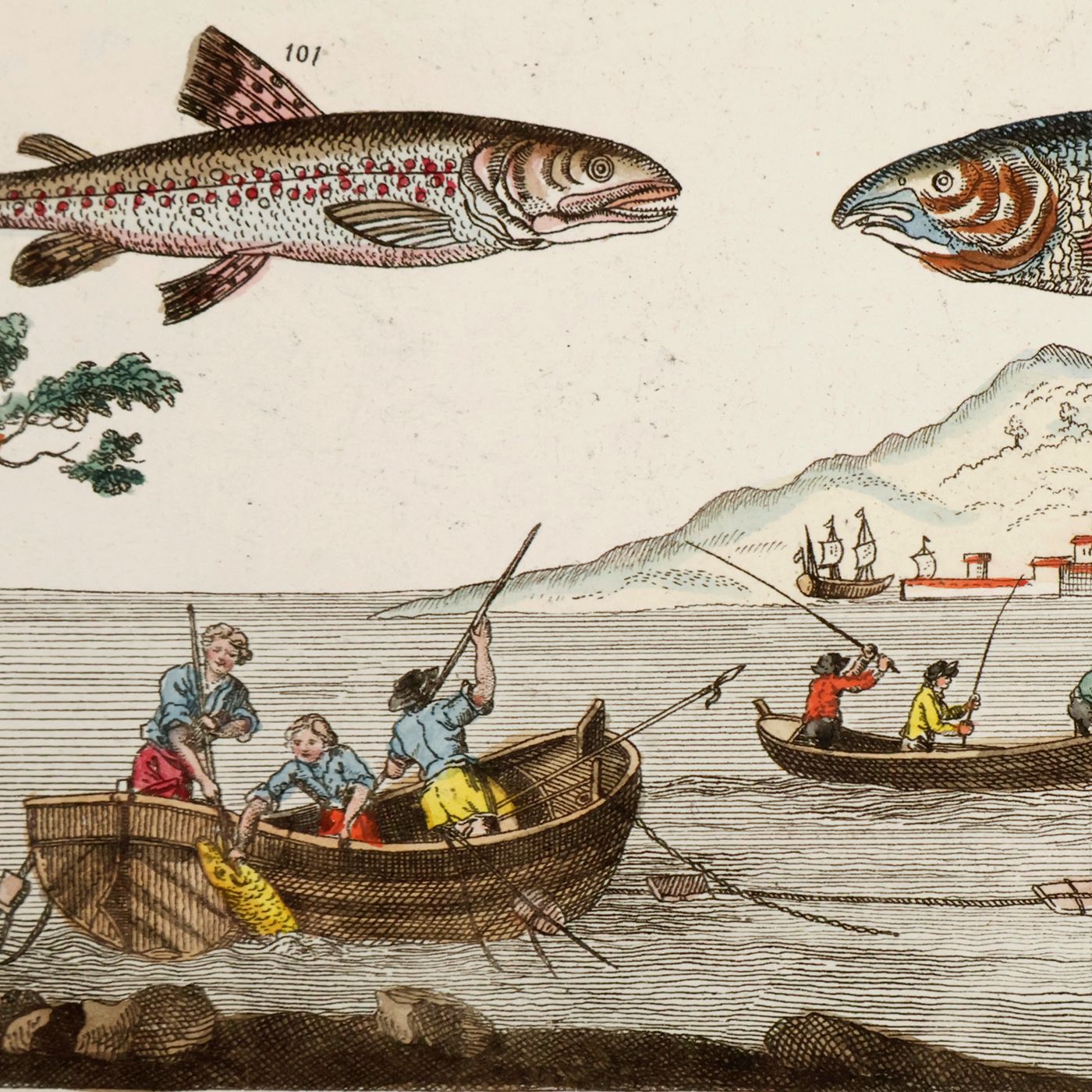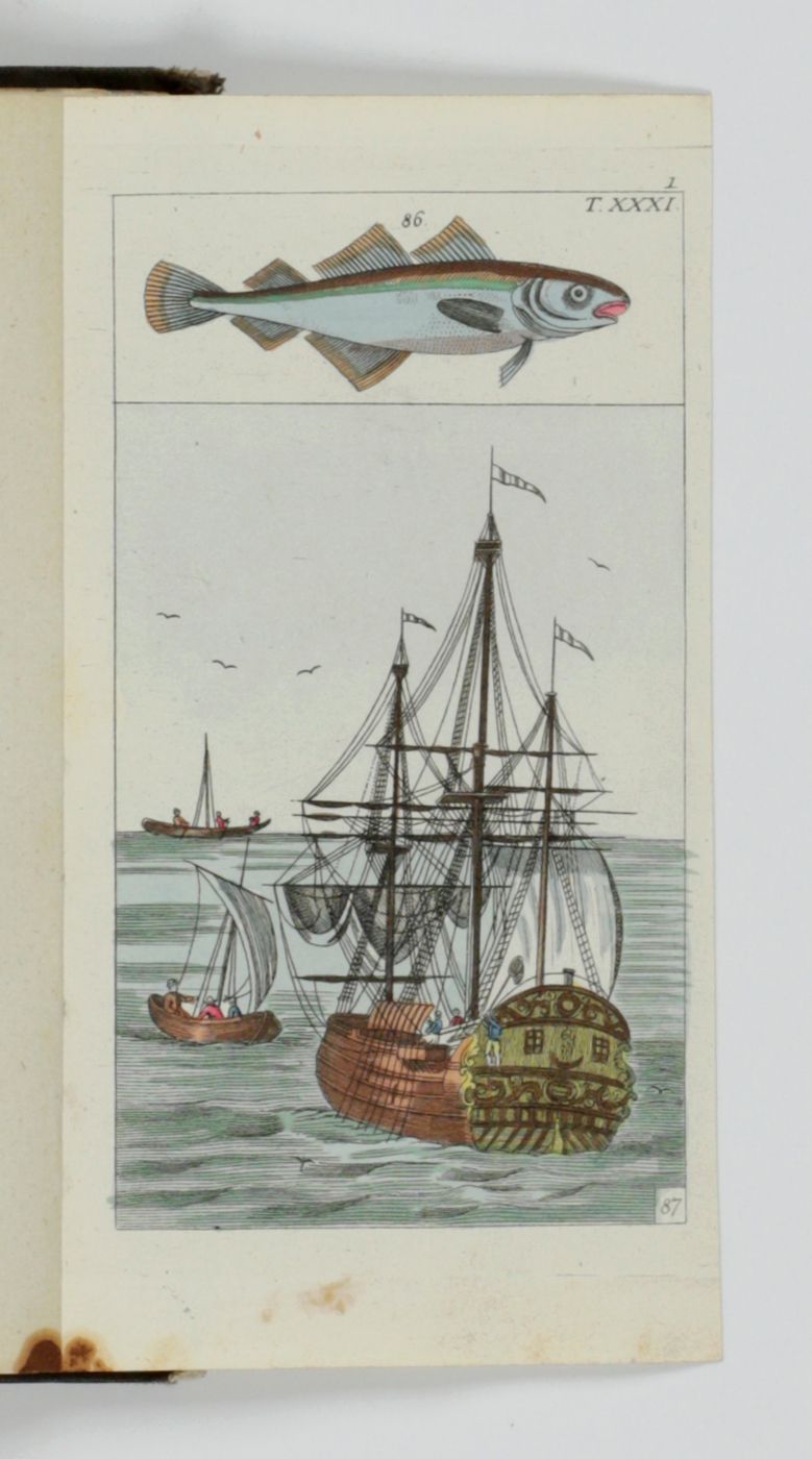 The complete ichthyology, and fishing, of a series of natural history works titled "Natural History stories", renowned for its plates, as much as for its texts, if not more so. Written by the German naturalist Gottlieb Tobias Wilhelm (1758-1811). This is the complete, second, unaltered edition, printed in Vienna. Many plates do not only show fish species, but also fishermen in action, showing different fishing techniques, e.g., trawling. A French edition was published too. Provenance: pictorial bookplate of the Swiss zoologist Christian Sigrist mounted on the front pastedowns. Boards with some light age-wear. Minimal spotting, here and there; the plates clean. The colouring is strong and very bright. Dean II, p. 630; Nissen ZBI 4408.