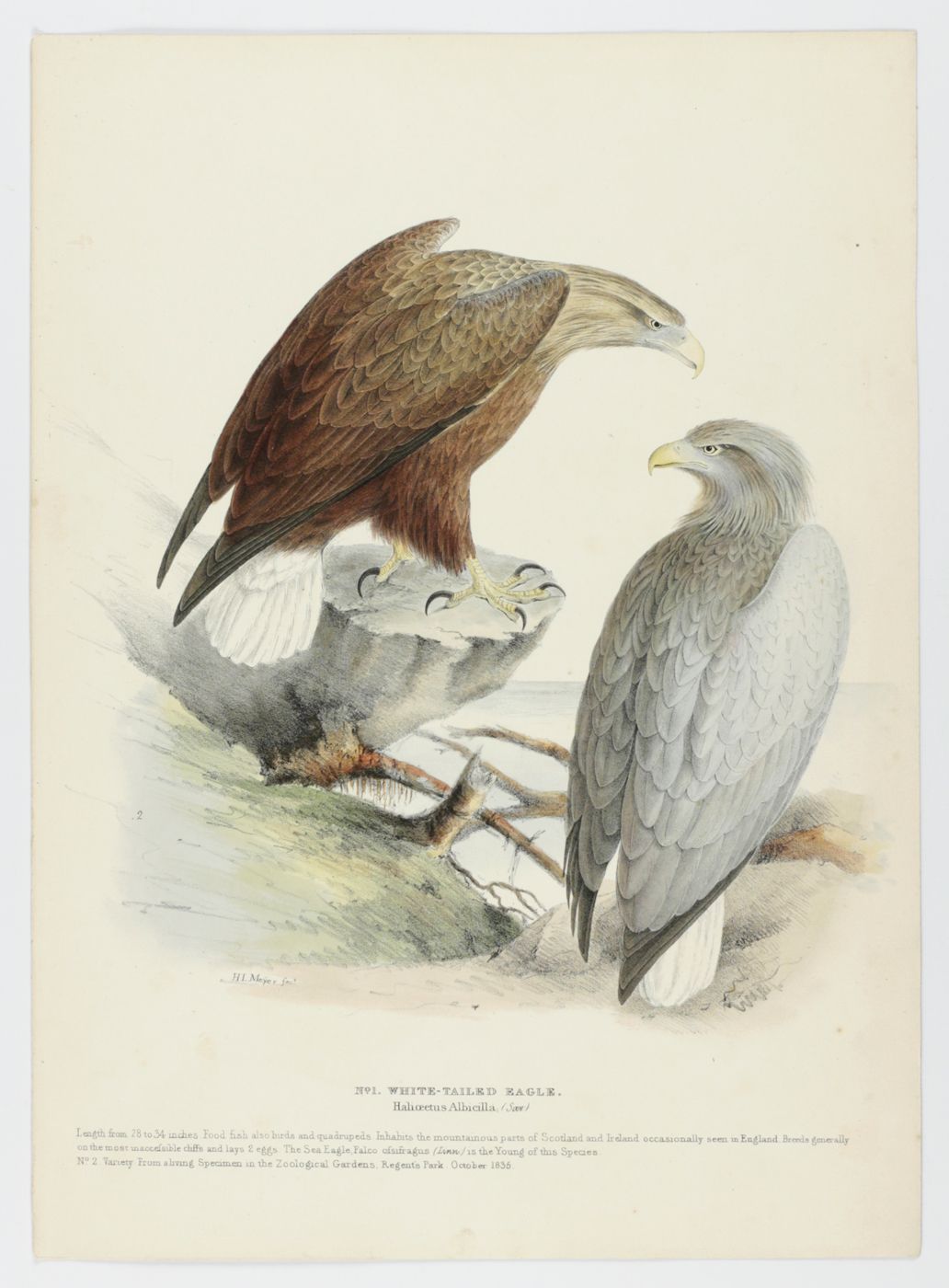The white-tailed eagle is a very large species of sea eagle, occurring across northern Eurasia, Greenland and Japan. Dutch-born British ornithologist Henri Leonhard Meyer (1797-1865), author and illustrator of one of the best books on British birds, Illustrations of British Birds (London, Longman, 1835-1850) (see, e.g., Hale), painted these fierce raptors in their natural habitat. Currently, its scientific name is Haliaeetus albicella (L.). Meyer's "Sav" refers to the French explorer and zoolologist Savigny, who introduced the genus Haliaeethus. This print is in excellent condition. Some light, marginal spotting and toning, away from the images. No creases, dents or tears present. Anker, p. 58; Hale, W. G. (2007) The Meyer's Illustrations of British Birds; Hale, W. G. (2012) The Meyer's Coloured Illustrations of British Birds and their Eggs and the Finishing of the Folio 1842-1847; C. E. Jackson, Bird illustrators, pp. 59-62; Nissen IVB, 628; Casey Wood, p. 462.