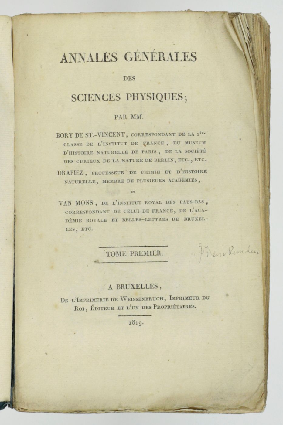 A very rare set of a scientific periodical initiated and edited by the French naturalist Jean-Baptiste Geneviève Marcellin Bory de Saint-Vincent (1778-1846). The first volume, dedicated to Alexander von Humboldt, includes several papers by the polymath, Constantine Samuel Rafinesque-Schmaltz (1783-1840), including his Monographie des coquilles bivalves fluviatiles de la rivière Ohio, contenant douze genres et soixante-huit espèces (actually 69 species, and including three plates), a work that is essential to North American malacology. Well-illustrated, with many hand-coloured plates (e.g. Bory on mining the Sint Pietersberg in Limburg – known for its Cretaceous fossils; Drapiez with a series of many papers, mainly on new beetles, each with one hand-coloured plate; Van Mons, a similar series, on pomology; Schweigger, on fossils in amber; Bory on Ferussac's land snails, etc., etc.). Several papers are on chemistry; a few illustrated papers deal with machine building, but the vast majority are on zoology and botany. Volume VIII was the last published. Uncut, (thus) frayed and creased at fore-edges, one spine split and a few wrappers detached. Frontispiece portraits – seen in some copies – are not present, and it seems that they were never included in this set; all scientific plates, however, are present. Bindings rather weak, a few spots, but generally quite clean, unmarked and completely in original condition. We have never had another set. There are no auction records after 1952. Cat. BM(NH) Serial titles1, p. 106.