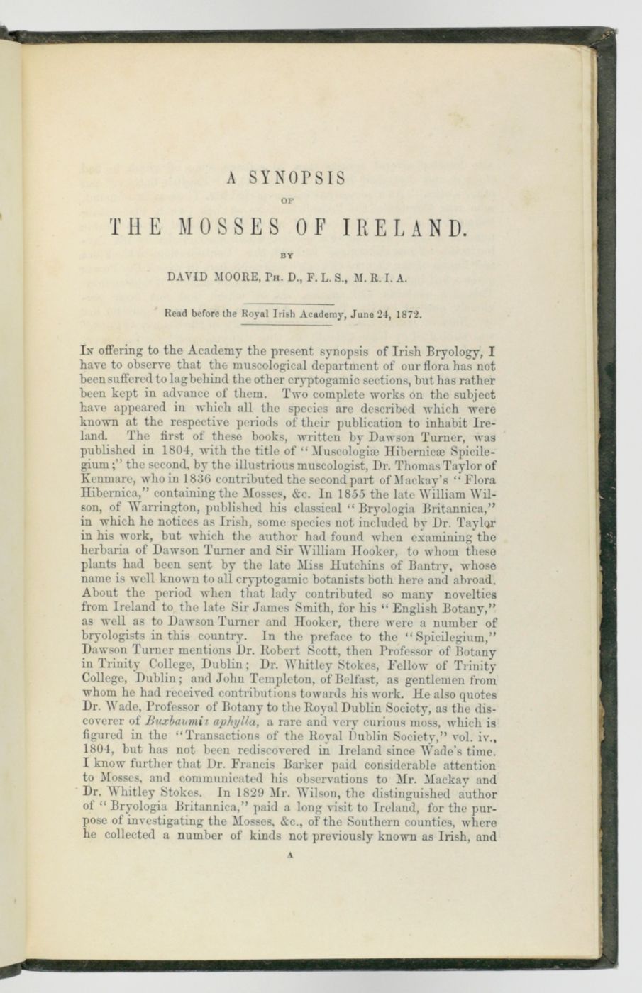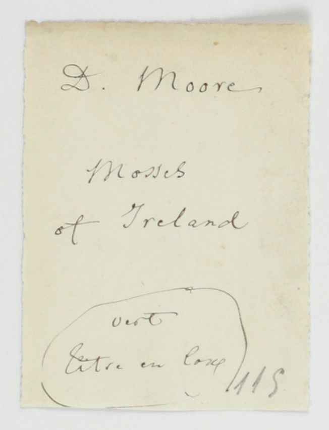 An important work by the Scottish-Irish botanist David Moore (1808-1879). It includes keys to the species and extensive notes on localities and habitats, and references. This is the rare offprint from the Proceedings of the Royal Irish Academy, with new pagination and title, and a handwritten dedication by the author in the top margin of the title page. The decicatee is "Ch. Martins", most probably the professor of natural history and director of the botanical garden in Montpellier, France, Charles Frédéric Martins (1806-1889). Small label of a Parisian bookbinder on the rear pastedown. Plate and title lightly spotted, otherwise an excellent, clean copy. Stafleu and Cowan 6271.