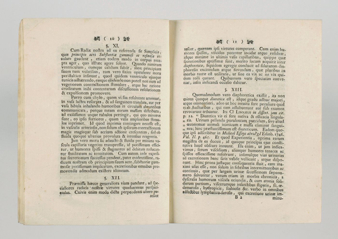 A rare thesis written by the German medical doctor and innkeeper Johann Jacob Burckhart (1667-1723). It deals with the pharmaceutical properties of a North American plant, Senega officinalis Spach, known as Seneca or senega snakeroot, rattlesnake root, or mountain flax. "This plant had many uses among Native Americans. The Cherokee used it as an expectorant and a diuretic, and for inflammation, croup, and common cold. The Chippewa used preparations of the root to treat convulsions and bleeding wounds. The Cree chewed the root for sore throat and toothache. According to Canadian botanist Frère Marie-Victorin, the Seneca may have been inspired to use the root to treat snakebite by its resemblance to the tail of a rattlesnake. The root was exported to Europe in the 1700s and was sold widely by pharmacists into the 1800s. It was marketed as a treatment for pneumonia. It is still in use as an herbal remedy. It is ground and made into patent medicines, mainly remedies for respiratory complaints. It is added to cough syrups, teas, lozenges, and gargles. It is toxic in large amounts, and overdose causes such symptoms as diarrhoea and 'violent vomiting'. The powdered root can be sternutatory (sneeze-inducing)" (Wikipedia). A very good, clean copy.