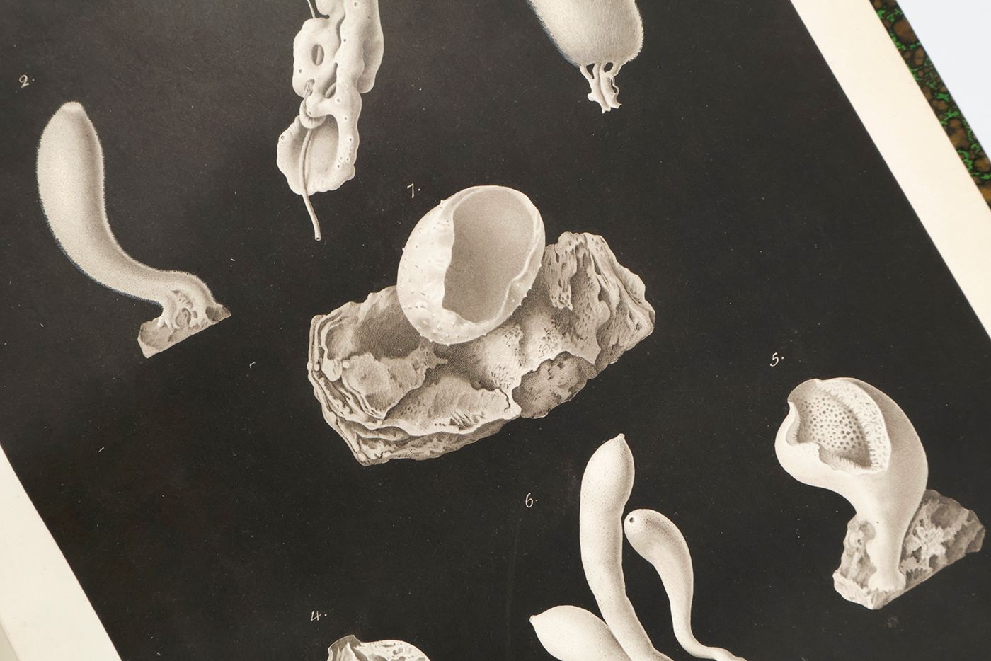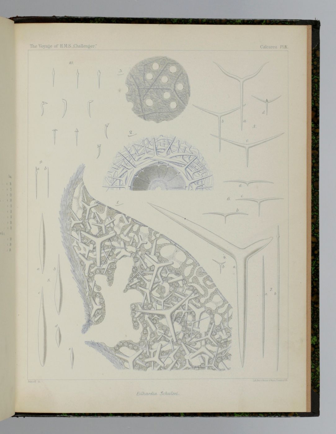 A rare part from the famous Challenger Reports. It deals with the calcareous sponges (or "Calcispongiae") and includes many well-illustrated new species, mainly from deeper water. Written by the Russian spongiologist Nikolai Nikolaevich Poléjaeff (1857-1903). Single parts, such as this one, were not published in "official" green linen bindings, therefore, bindings may differ. Despite some rubbing to the spine and boards, this is a nice one. Text with a few pencil marks; stamp removed from title; otherwise a very good, clean copy. Nissen ZBI, 4754.