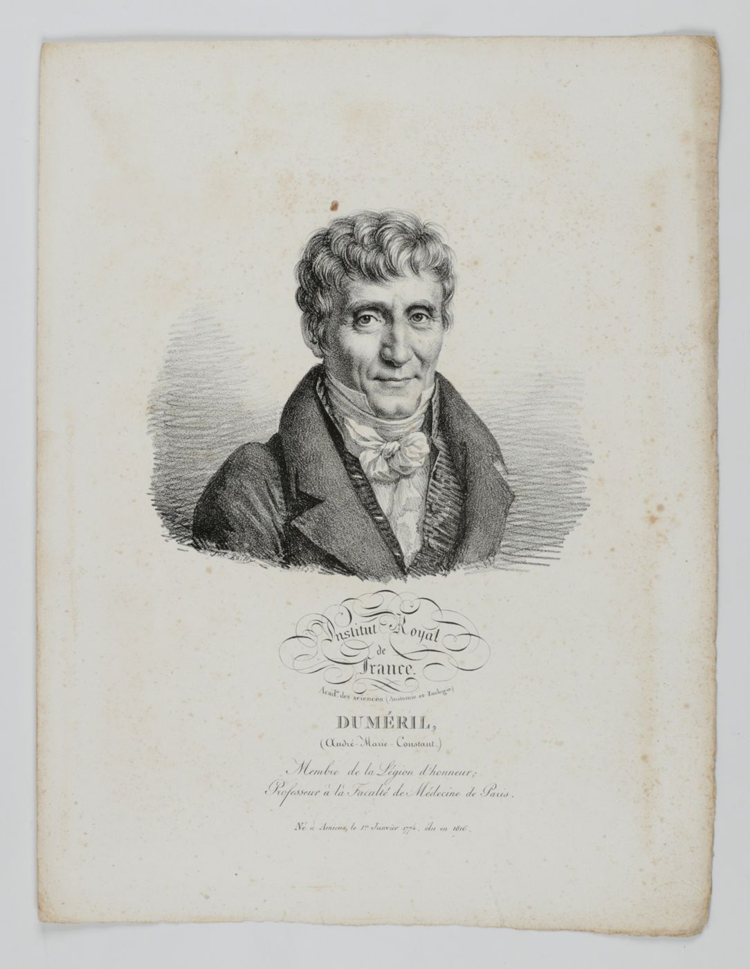 A rarely-seen portrait of the French zoologist (principally herpetologist and ichthyologist) André Marie Constant Duméril (1774-1860). The artist, Julien-Léopold Boilly (1796-1874) was noted for his album of lithographs, Iconographie de l'Institut royal de France ou collection des portraits des Membres composant les quatre académies depuis 1814 jusqu'en 1825 (1820-1825). His portraits are much less stiff and formal than many by his contemporaries. Signed by the artist in the lower left margin of the portrait and dated 1822. The caption states the date of his birth and the year (1816) when Duméril was elected as a member of the Institut. Uncut. With in the lower right corner a small, oval blindstamp, 'Galerie Vivienne Bénard'. Scattered, mostly light foxing, mainly in the margins; weak abrasion in the right margin; otherwise very good.