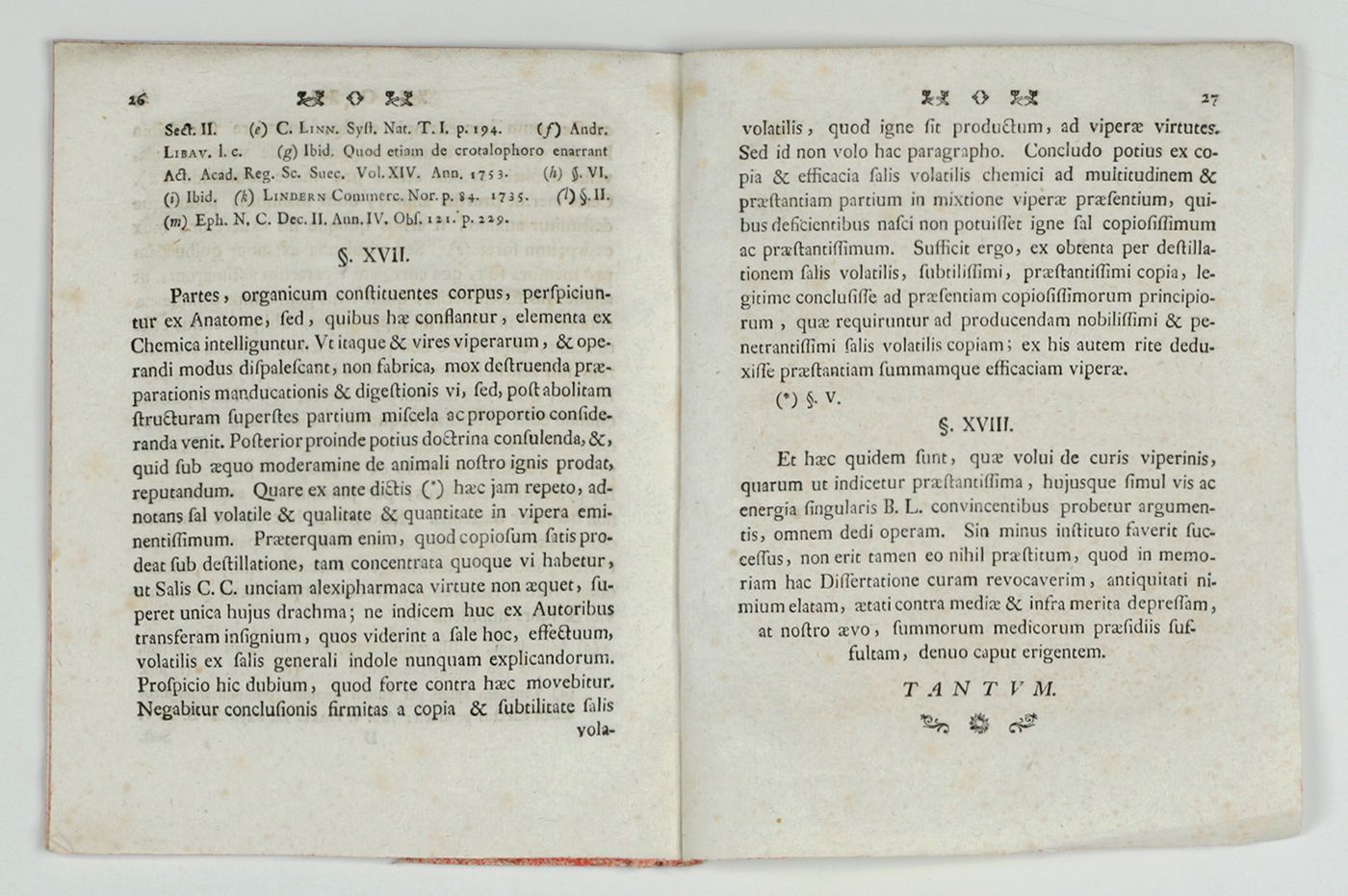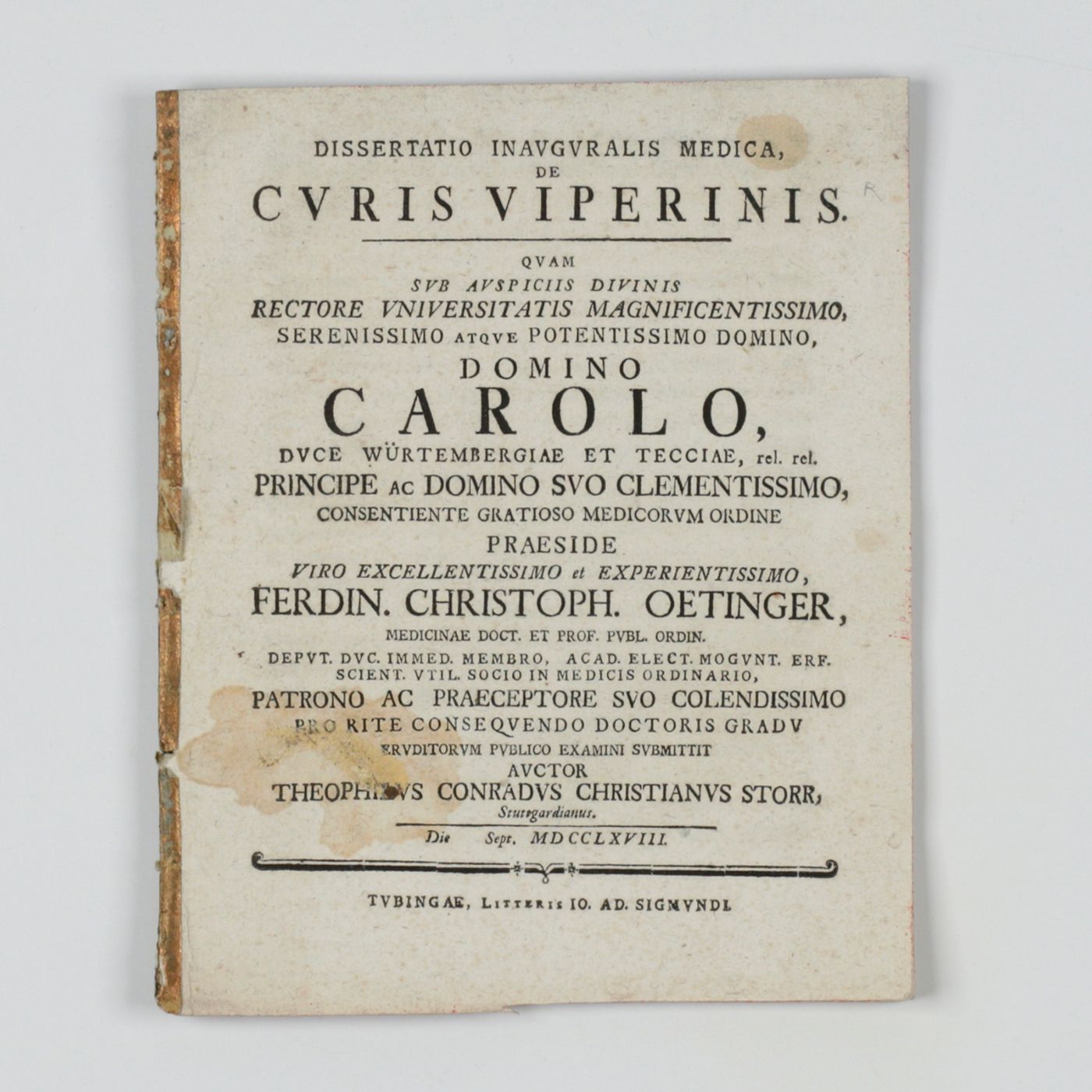 Tubingae [Tübingen], Johann Adolph Sigmund, 1768. Small 4to (19.0 x 15.5 cm). Title page (verso blank), pp. 3-27. Contemporary brokat paper strip covering the spine. Edges marbled red. No wrappers issued.