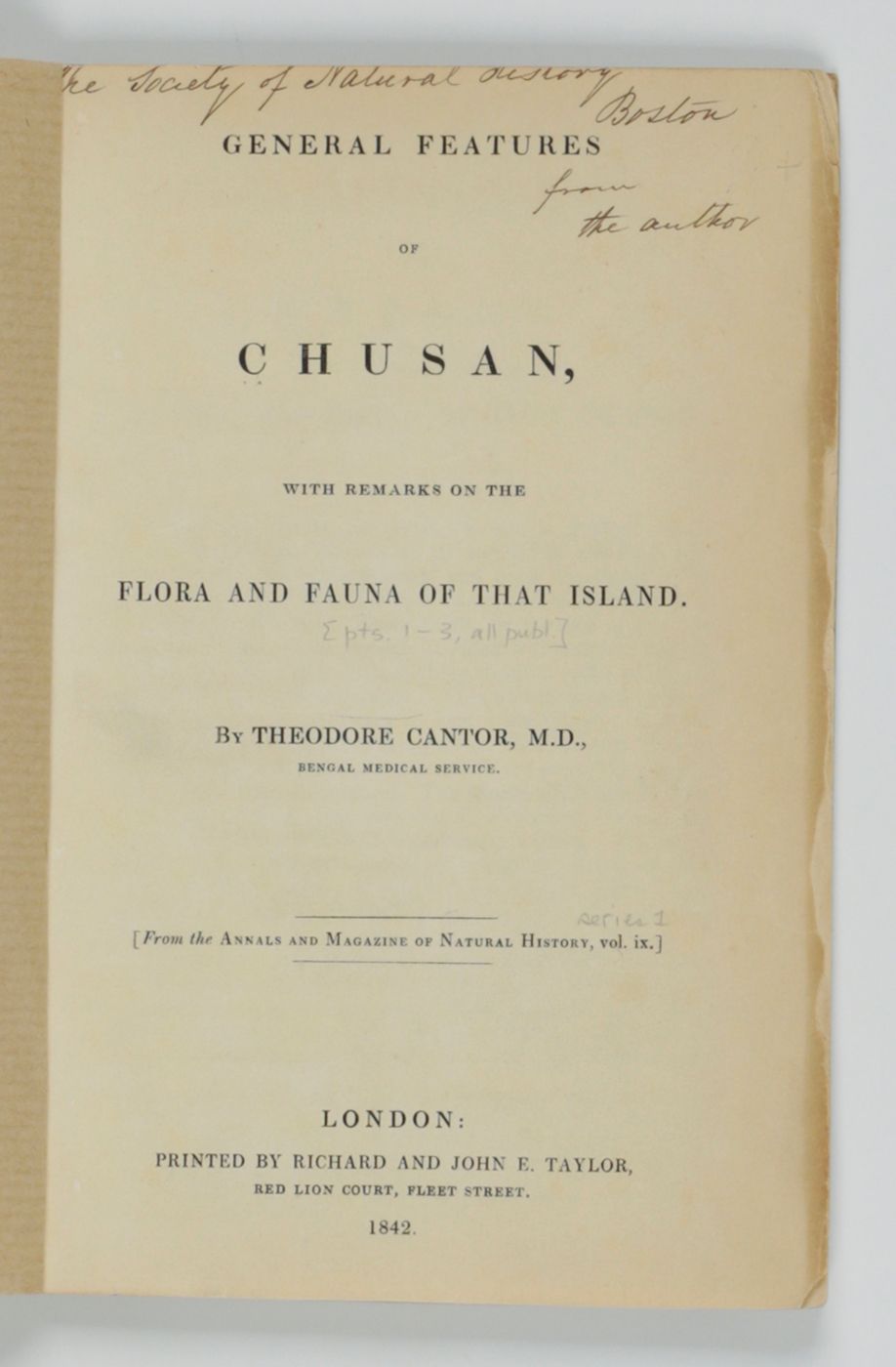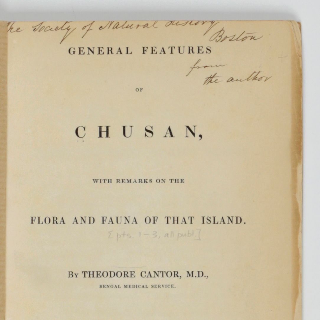 Offprint of a rare paper, largely written by the Danish physician (employed by the British East India Company), botanist and zoologist, Theodore Edvard Cantor (1809-1860), published in the Annals and Magazine of Natural History 1(9). Cantor provides some introductory remarks on the topography, weather and climate, history and inhabitants, a review of the plants, and notes on the mammals, birds, reptiles, and amphibians. He described a new bat, and several new reptiles, including snakes, and new frogs, and fish. Many new molluscs are included. These, however, were described by the British malacologist, and fellow British East India Company employee, William Henry Benson (1803-1870). All (new) mollusc species are terrestrial, or from fresh to brackish water. Finally, Cantor described several new species of spiders, and provided a list of insects and several minor invertebrate groups. Provenance: inscribed by Cantor in the top margin of the title page, viz., a dedication to the Boston Natural History Society. On the front wrapper a small stamp of the American herpetologist Kraig Adler. Fore edges a bit chipped, otherwise very good. Adler 2, pp. 65-66