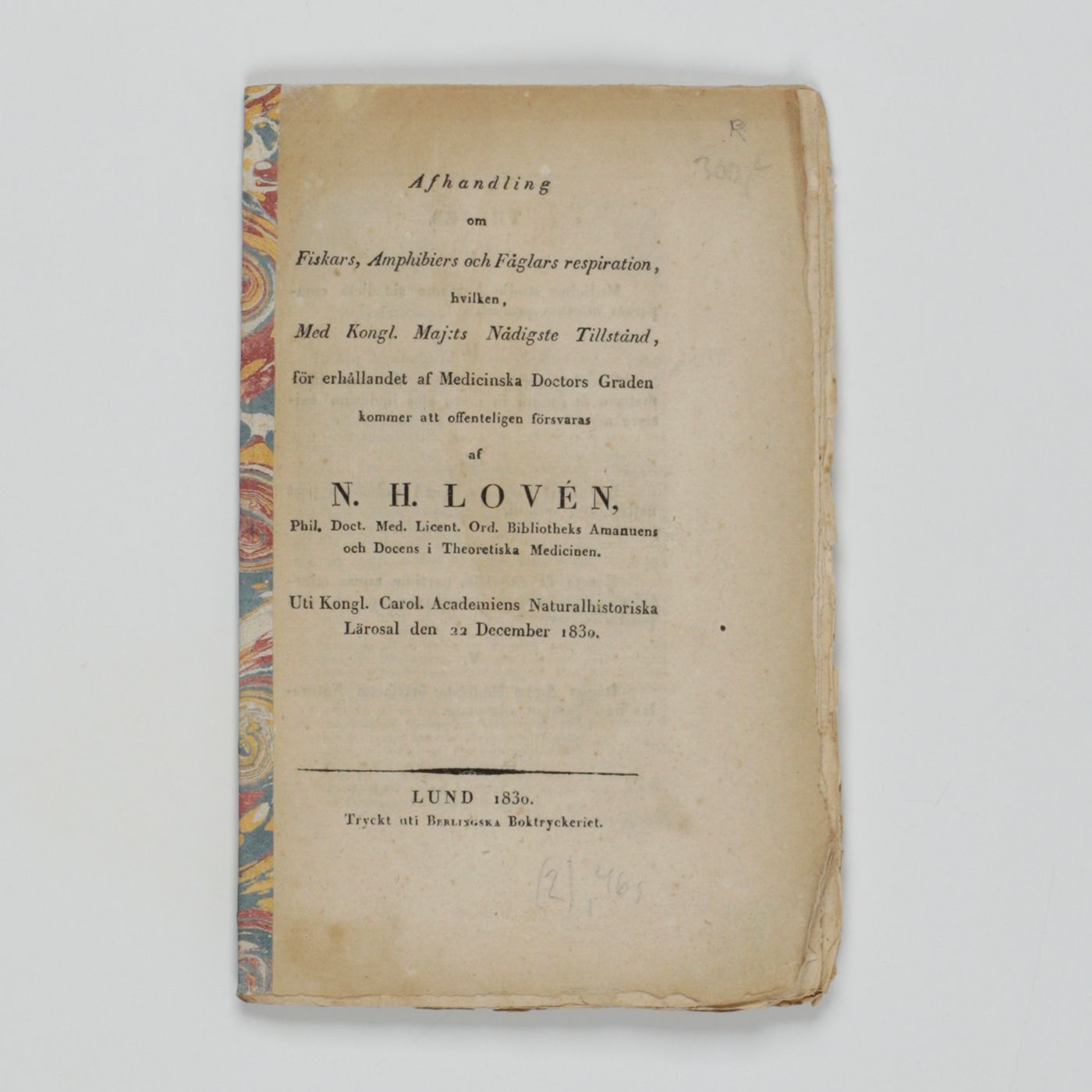 Thesis of the Swedish medical doctor, pathologist and zoologist Nils Henrik Lovén (1801-1877), a cousin of the influential marine zoologist Sven Ludvig Lovén (1809-1895). Lovén compares the respiratory anatomy in fish, reptiles and birds. This copy, although without owner's inscription or stamp, from the library of the renowned Swedish herpetologist Richard Wahlgrén (1946-2019), who had a keen eye for herpetological rarities. Uncut. First and last leaf somewhat toned, otherwise very good, clean and unmarked. Neither Cat. BM(NH), nor in Adler, Contributions to the history of Herpetology.