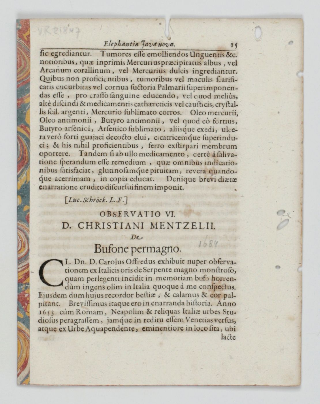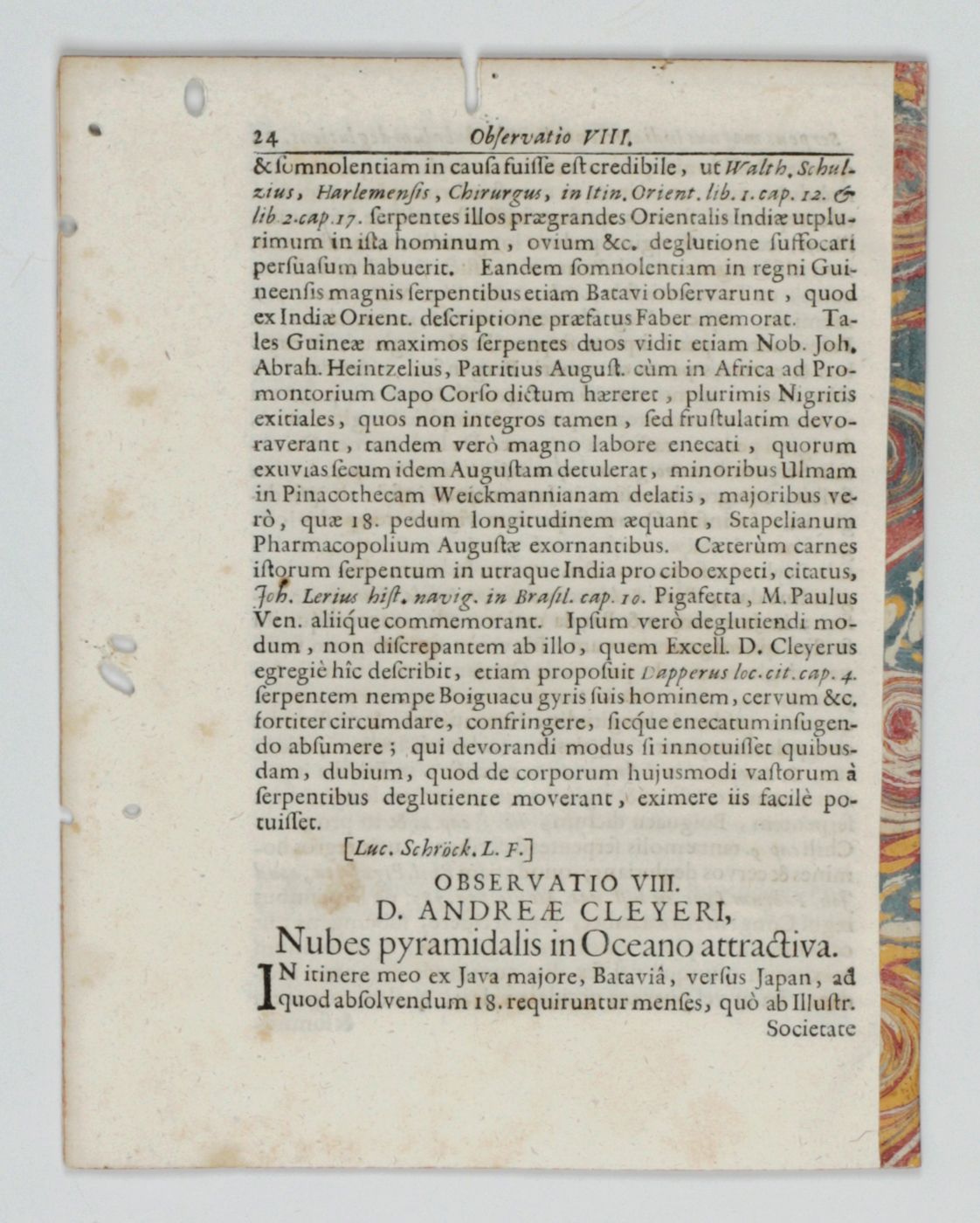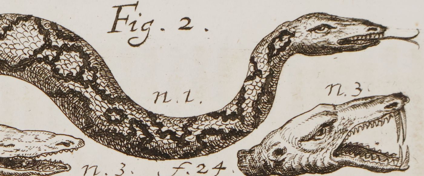 Two papers on a "giant" snake. The first paper suggests dealing with a species of Bufo(frog), but it is not. Published back-to-back in Volume 2 of the Miscellanea Curiosa sive Ephemiridum Medico-Physicarum of the Germanicarum Academiae Naturae Curiosorum. The plate, with four separate illustrations is very good, except that the artist, apparently, did not know what a water buffalo looked like, and, rather, depicted an ordinary bovine. The author of the first paper was the German physician, pharmacist, botanist, trader and Japanologist, Andreas Cleyer (1634-1697 or 1698). "Andreas Cleyer could be called a soldier of fortune.' He began as a modest soldier, and he made his fortune and reputation during the course of a career. He rose in the ranks of the Dutch East India Company (Vereenigde Oostindische Compagnie, VOC), becoming a respected and well-known figure in the VOC's Batavian society. Cleyer, who had studied medicine and had acquired a license to practice medicine, came initially to Southeast Asia as a soldier (adelborst) of the VOC. His medical background led to a better posting as the manager of the VOC's military hospital pharmacy in Batavia and later the city pharmacy too. During this period, he also became rector of the Latin school. Author of the second, illustrated, paper was the German physician, botanist and Chinese scholar, Christian Mentzel (1622-1701). "Mentzel was the personal physician to the Prince Regent Friedrich Wilhelm of Brandenburg. He was also a member of the Leopoldian Academy." (Wikipedia). This copy, although without owner's inscription or stamp, from the library of the renowned Swedish herpetologist Richard Wahlgrén (1946-2019). Several worm holes in the fore and top margin; the text and plate images, however, not affected. Rare. Neither author in Adler, Contributions to the History of Herpetology.