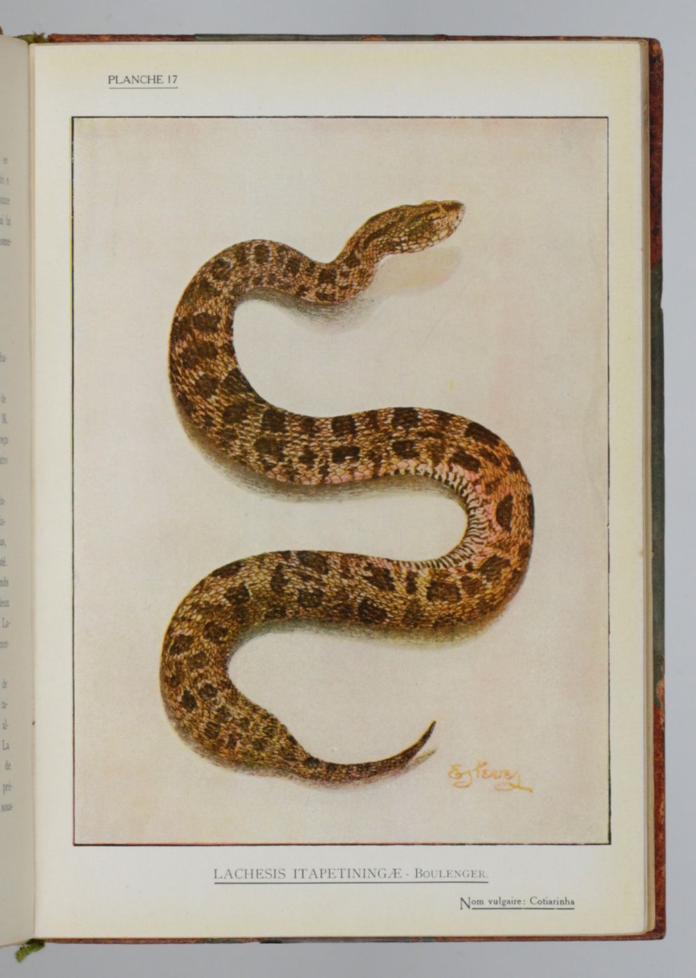 São Paulo, Poica-Weiss, 1914. Large 8vo (23.3 x 16.0 cm). Title in red and black, 319 pp.; two pages with text illustrations (mainly detailed snake heads); 28 plates of which 13 in full colour offset printing. Contemporary half morocco over marbled boards. Spine with five raised bands. Marbled endpapers.