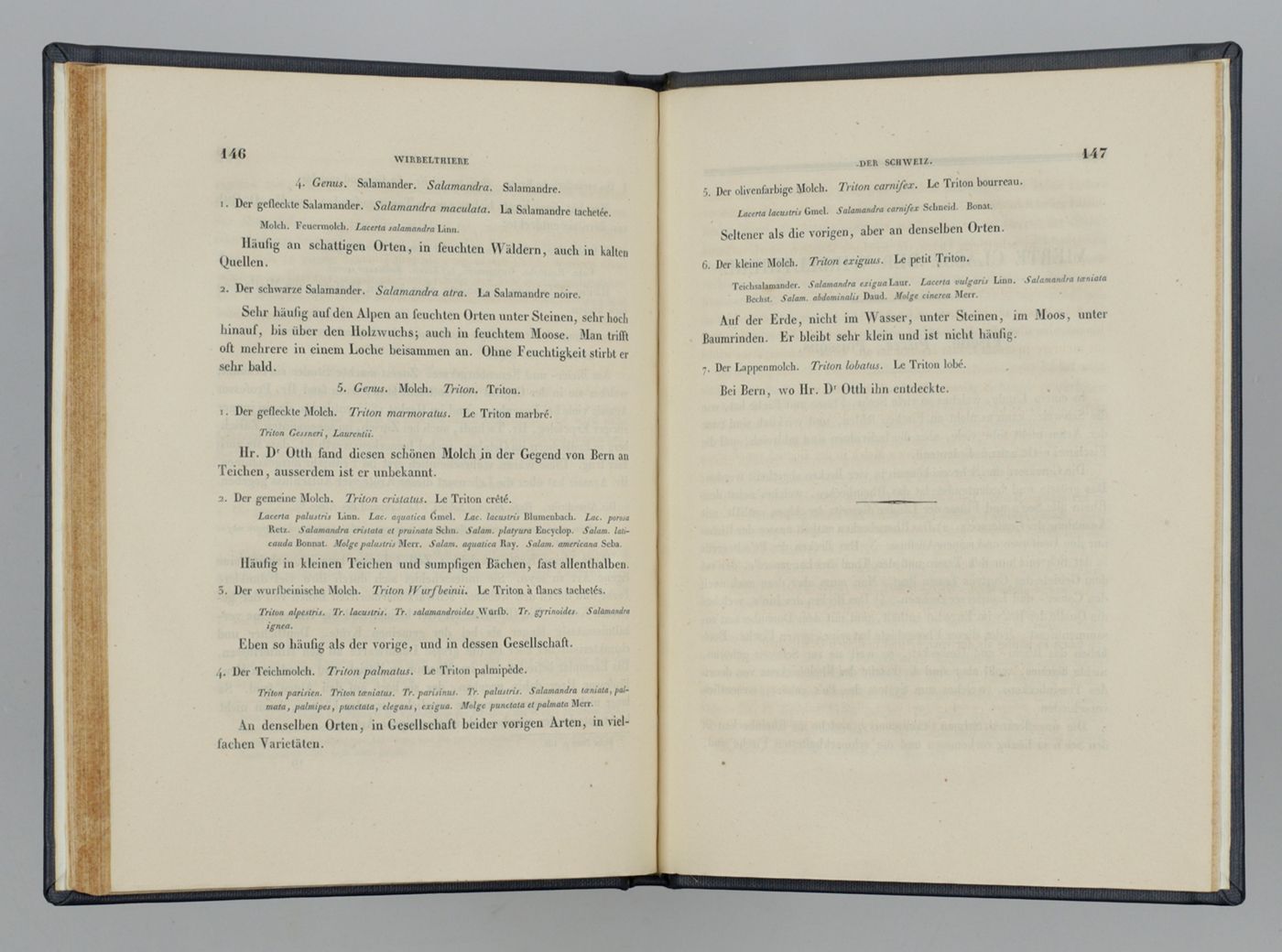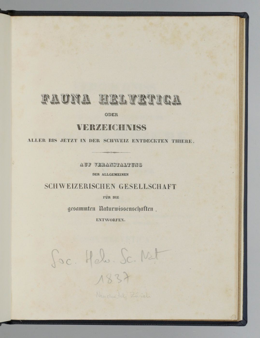 Neuchatel, Allgemeine Schweizerischen Gesellschaft für die gesammten Naturwissenschaften, 1837. 4to (24.6 x 20.4 cm). Title to the Verzeichniss, title to the Wirbelthiere; 168 pp.; one hand-coloured lithographed plate. Mid-20th-century blue cloth. Spine with silver title. Speckled edges.