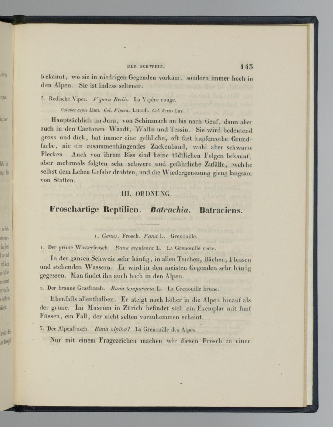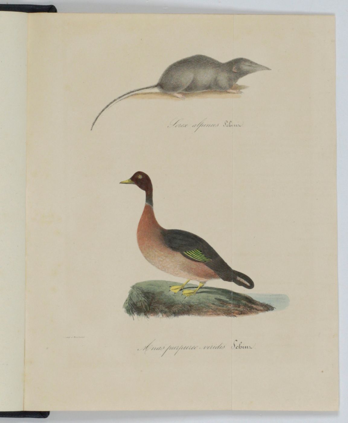Written and editted by the Swiss naturalist Heinrich Rudolf Schinz (1777-1862), but the herpetological section was possibly a contribution by Johann Jakob von Tschudi (1818-1889), a prominent Swiss naturalist. This is the first part of the Fauna Helvetica and all that was published on vertebrates (including the complete herpetology), and all that was published by Schinz. A second part, on molluscs, is not included. The lithograph shows a bird, Anas purpureo-viridis, and a shrew, Sorex alpinus, both described as new by Schinz. Published in the Neue Denkschriften - or Nouveau Mémoires - Band (volume) I. The plate folded, very mildly, evenly toned; otherwise, a very good, clean copy. Rare. Cat. BM(NH) p. 1835. Not in Nissen ZBI.