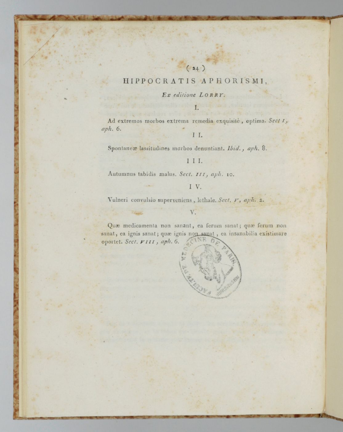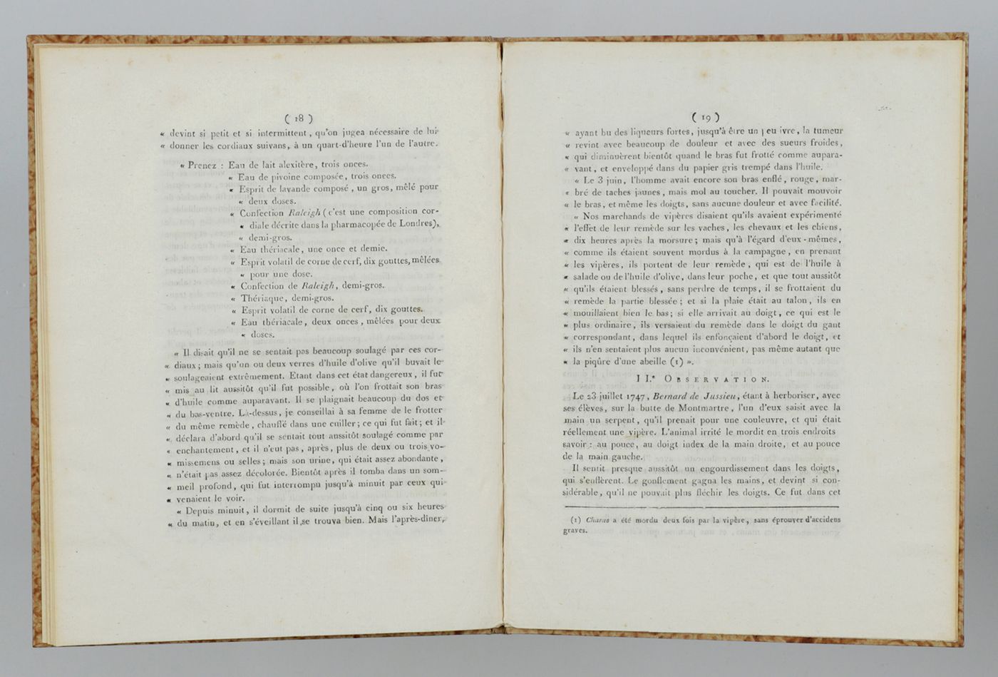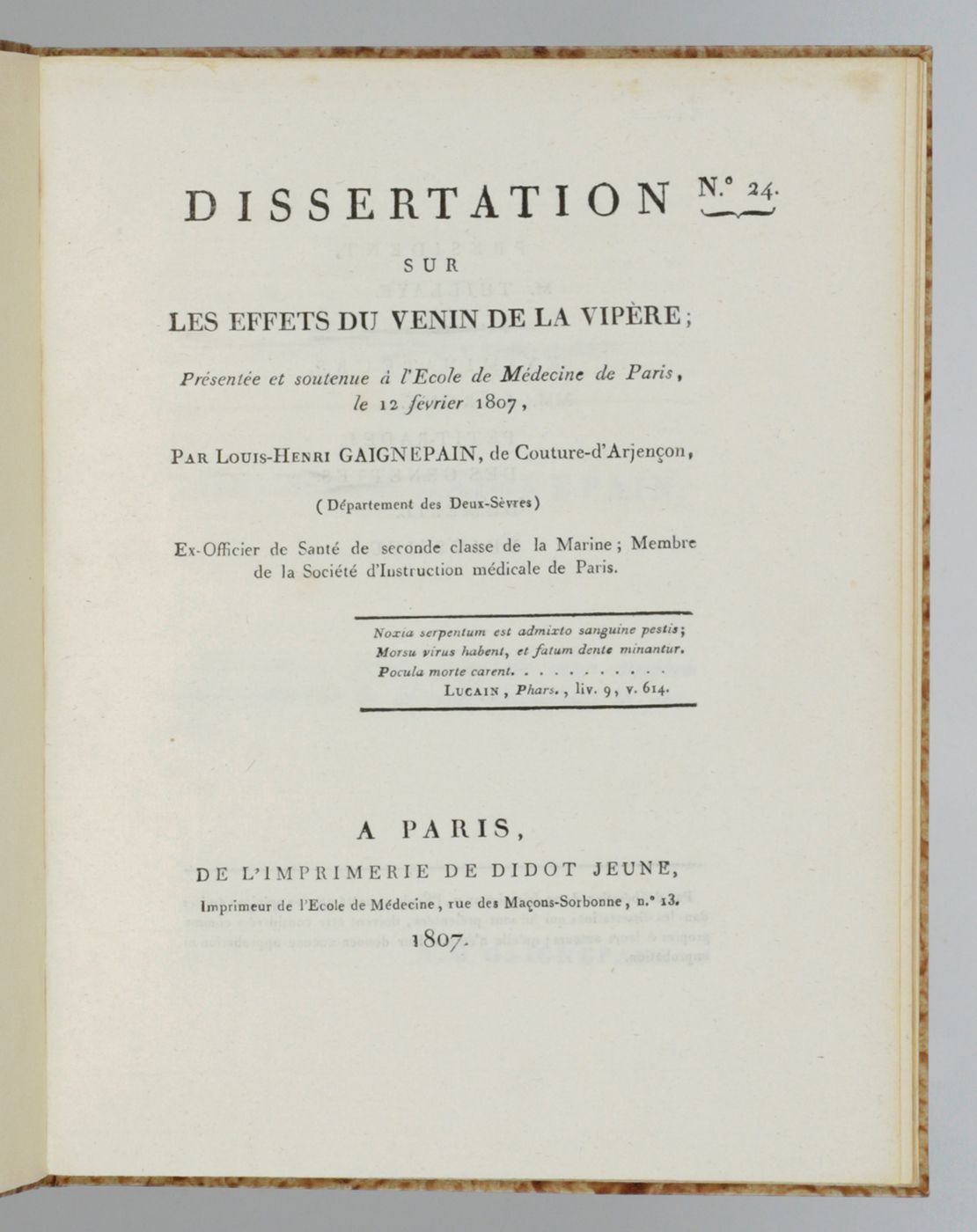 A rarely seen thesis on snake venom, in particular of the adder, written and defended by the French medical doctor and former officer in the French Marine, Louis-Henri Gaignepain de La Chaussée (b. 1776), from Couture-d'Arjençon [Argençon] in the department of Deux-Sèvres. In this thesis, the author advocates several treatments of snake bites, and rejected others. Among the examinators, we find the names of Duméril and Dejussieu, as well as Leroux, Des Genettes, and Petit-Radel. The author dedicated this work to his brother, Jean-Henri Gaignepain de La Chaussée (1760-1837). Approbation (?) stamp of the Faculté de Medecine de Paris on the last page; Ex-libris of former owner pasted to inner front board. A very good, clean and wide-margined copy, in an attractive binding. Not in any major bibliography.