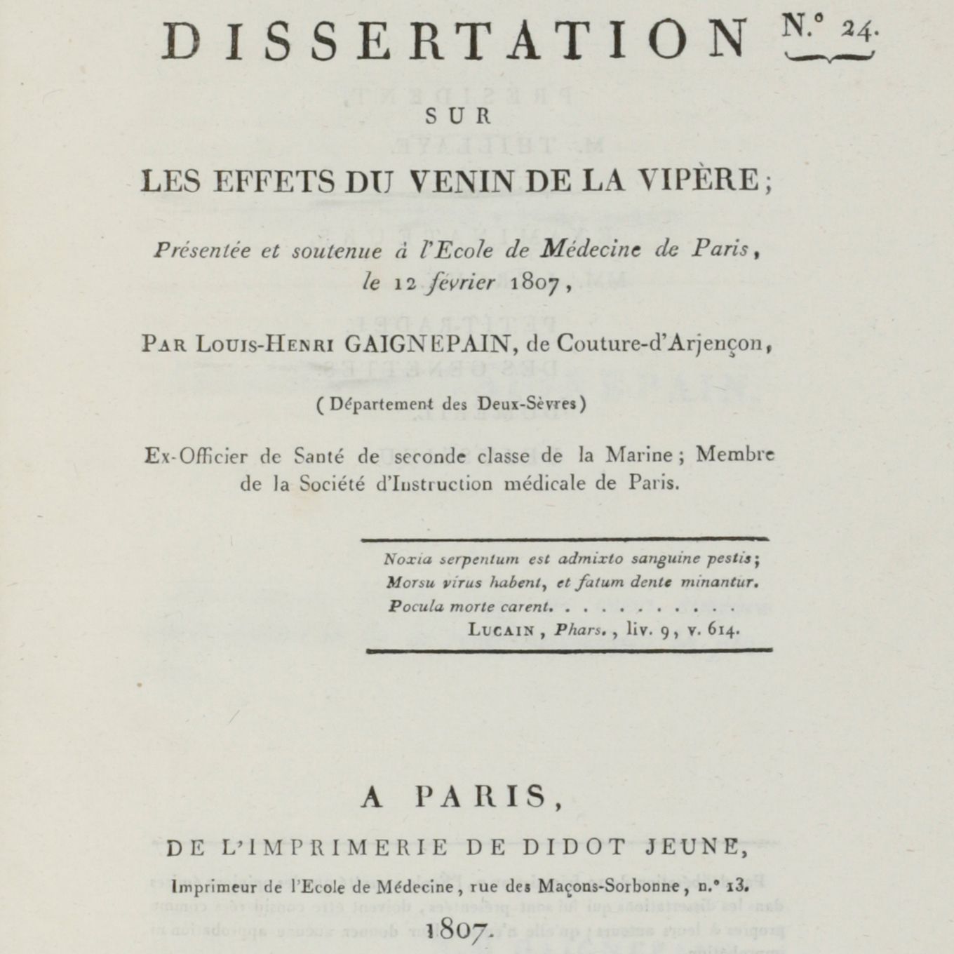 Dissertation sur les effets du venin de la vipère; présentée et soutenue à l'Ecole de Médecine de Paris, le 12 fevrier 1807.