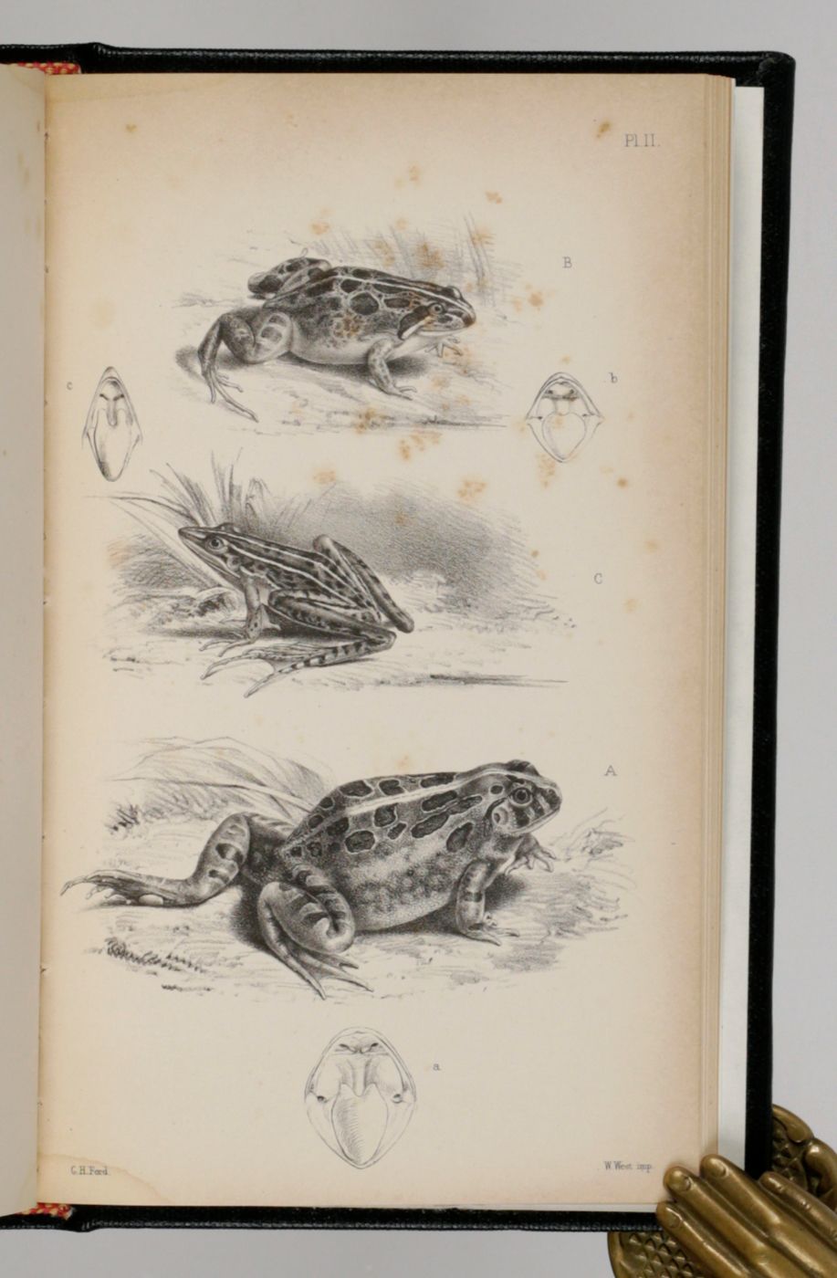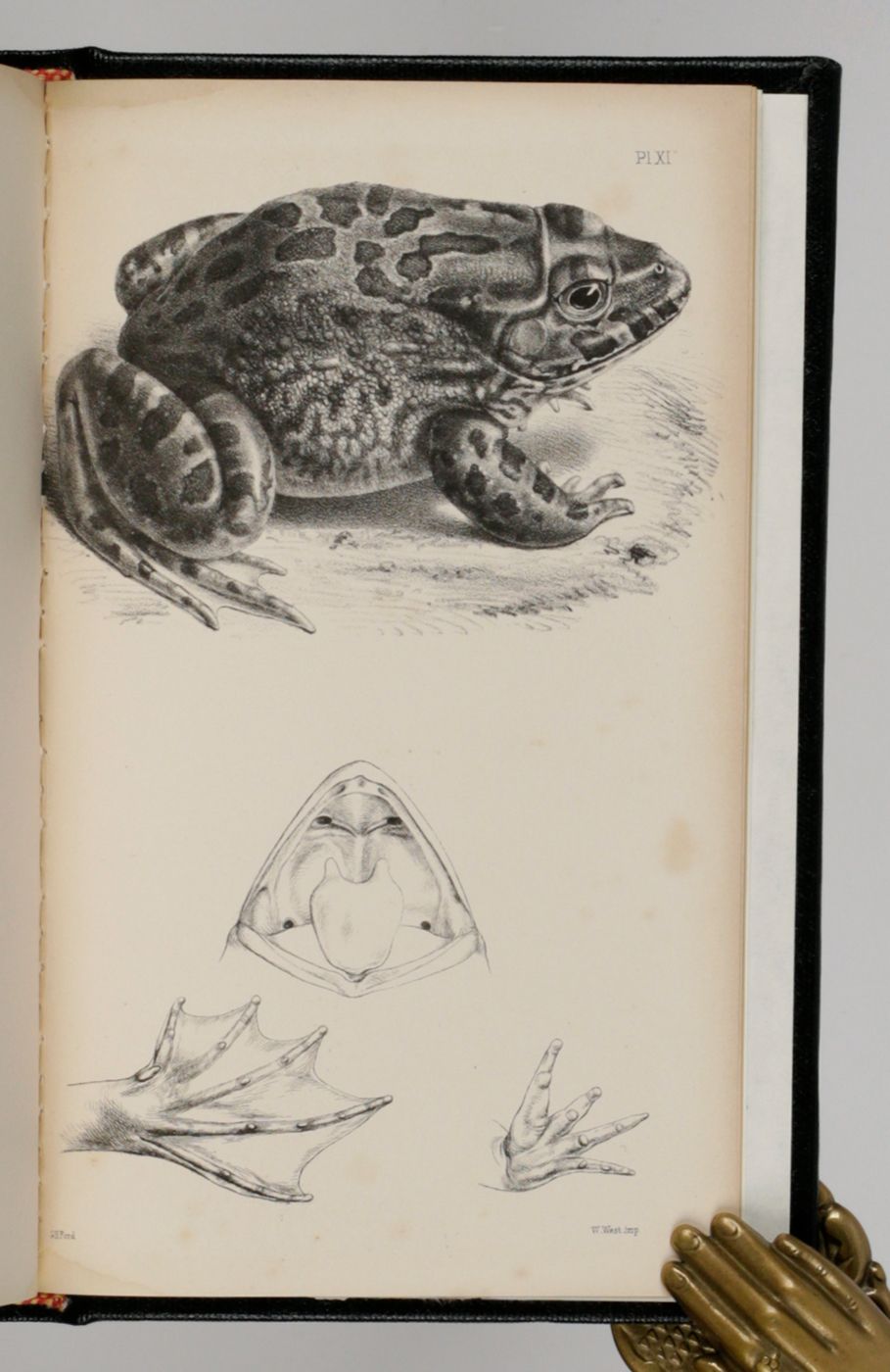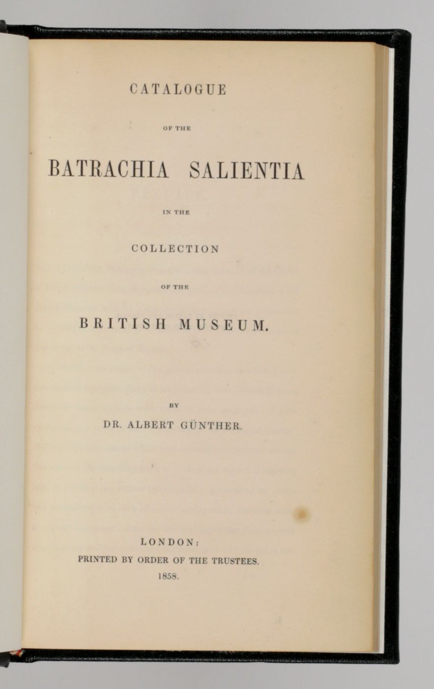 An important catalogue, describing the extremely rich amphibian collection of the British Museum of Natural History in London. Written by the German-British herpetologist Albert Carl Ludwig Gotthilf Günther (1830-1914). Included are descriptions and illustrations of new species of frogs and toads. It also contains many data on variability, distribution, distinctive characters, a chronology of the number of species known to science, a geographical index, etc. In the rear is an 8 pp. advertisement describing and pricing all catalogues of the zoological collections in BM(NH) published up to May, 1857. Provenance: mounted on the front cover verso, a pictorial bookplate. Very small, hardly noticeable damp-stain to the lower margin, near the gutter; an occassional spot; some more foxing to the last plate and the first advertisement leaf. Otherwise, a very good, clean, bound copy.