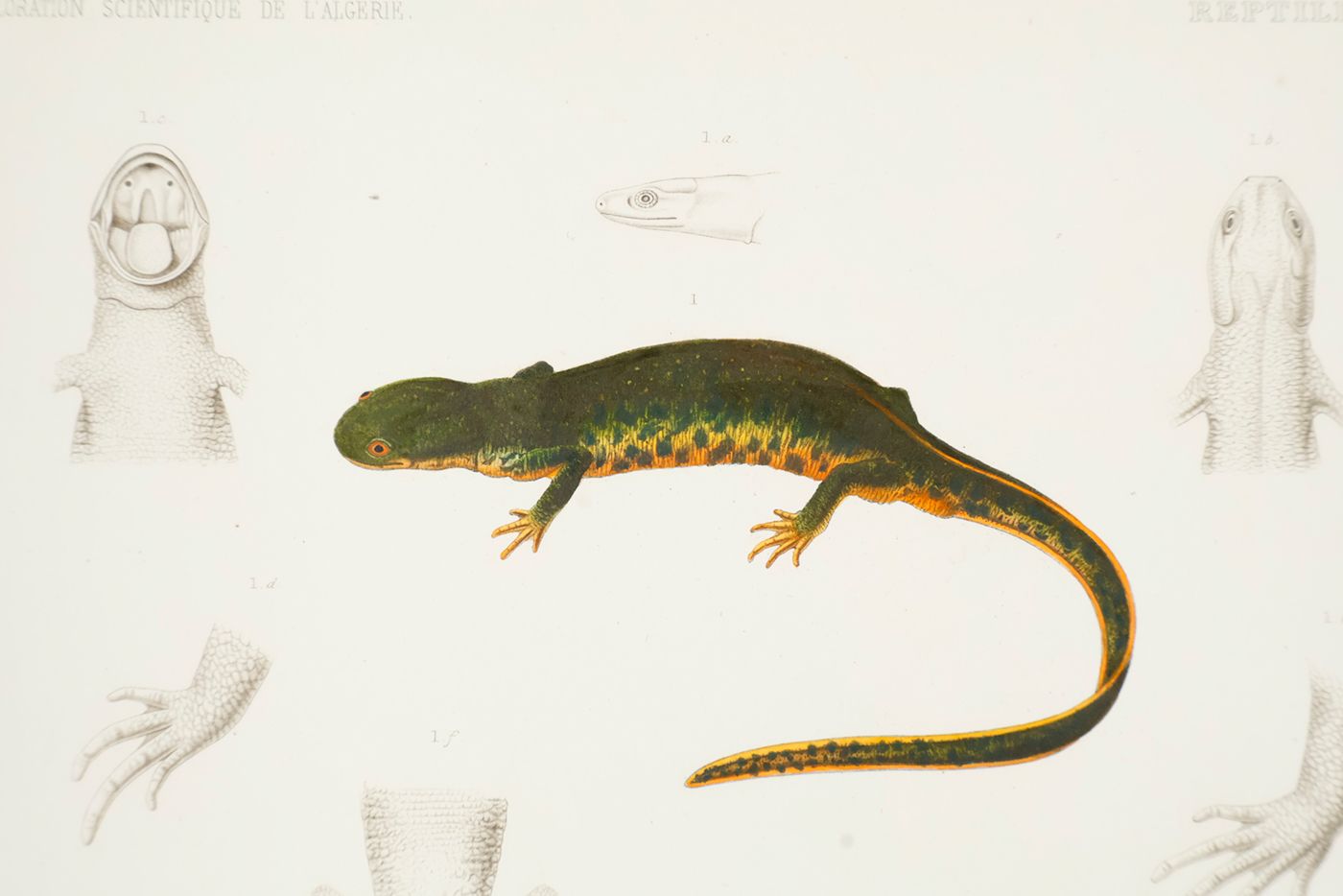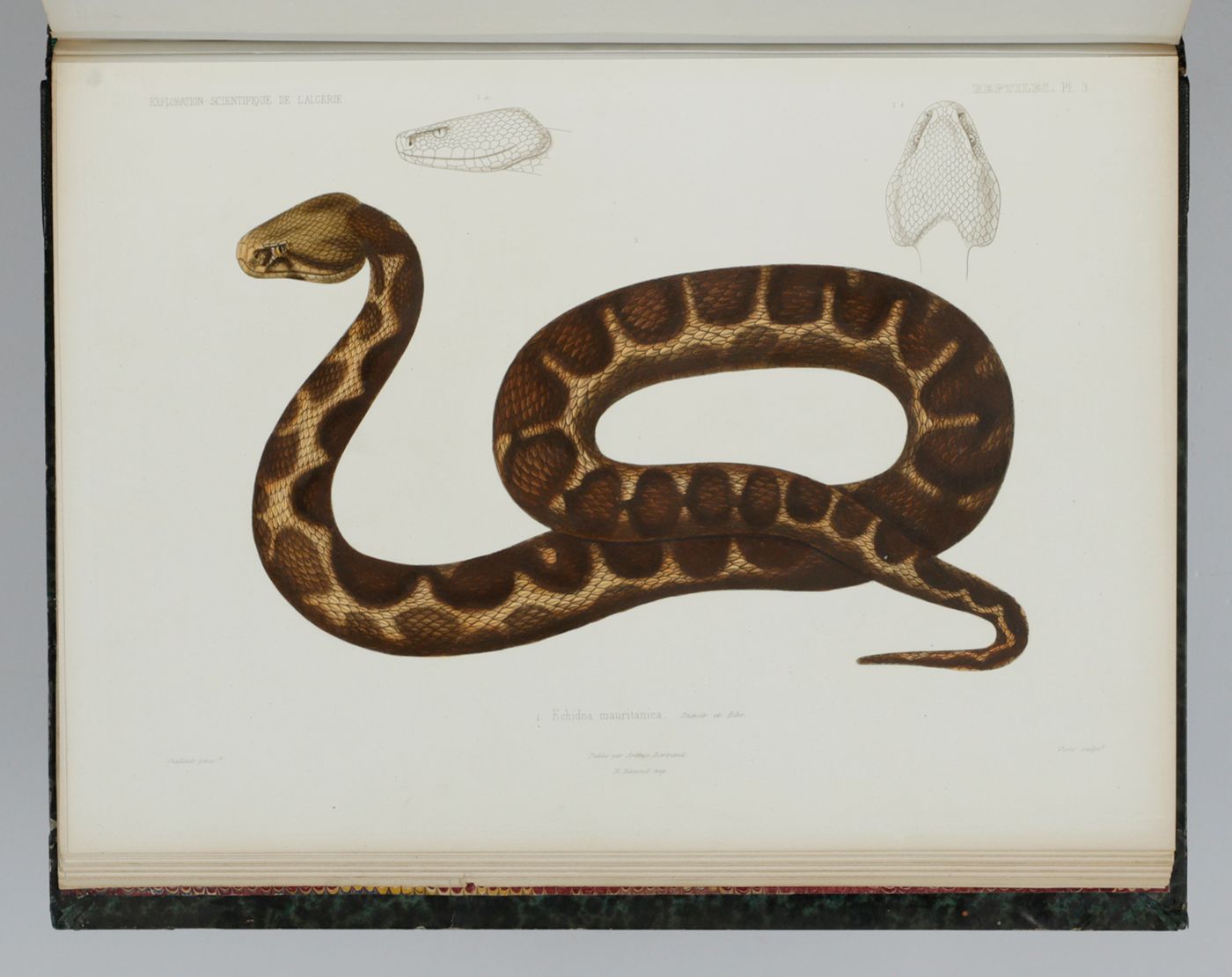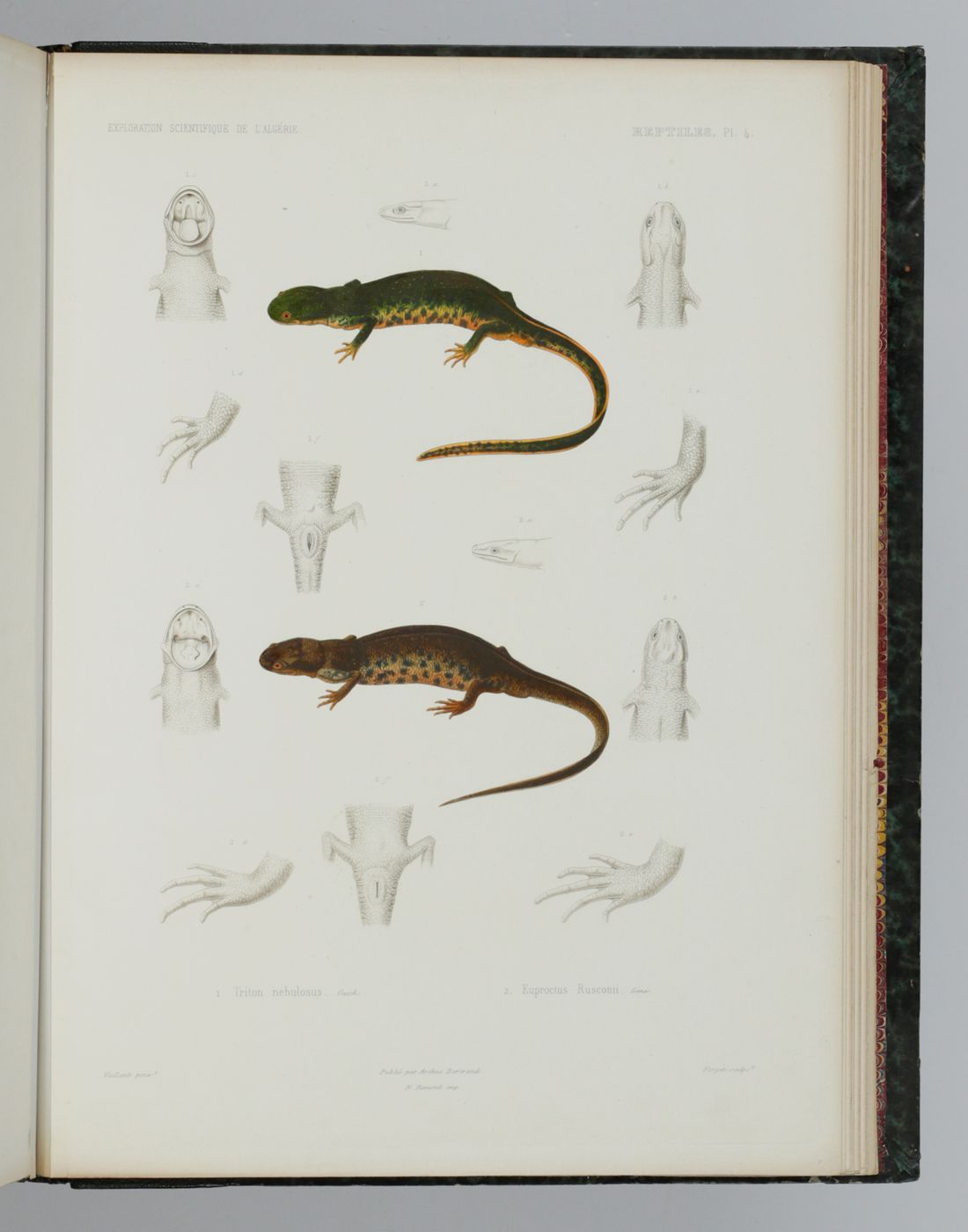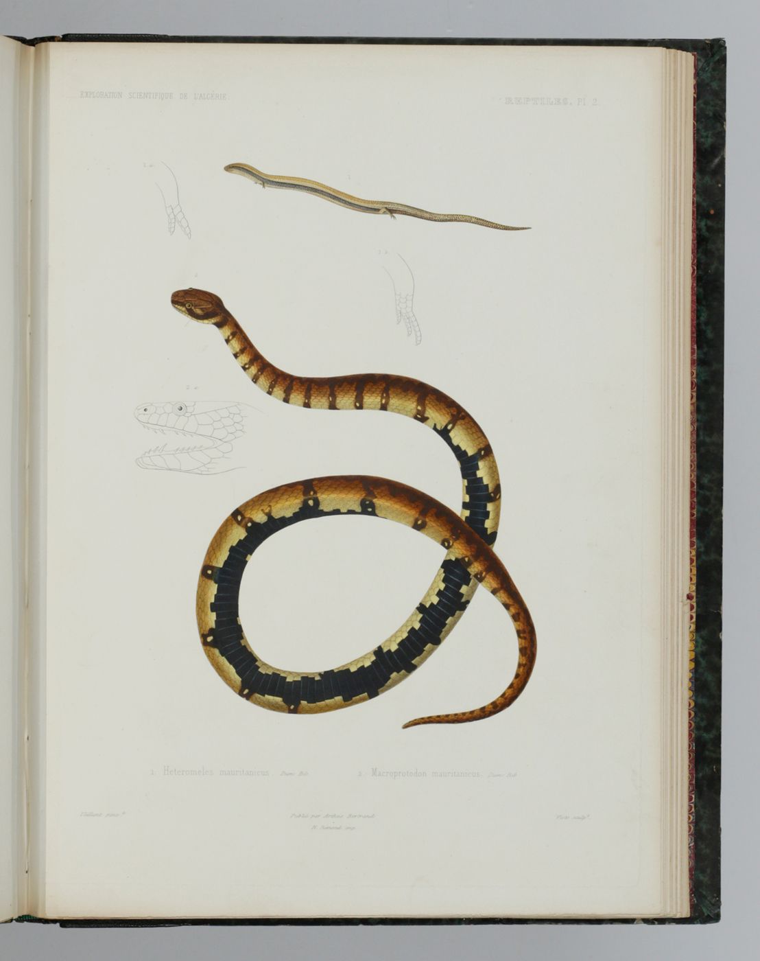 The very rare complete text and atlas of the reptiles, amphibians, and fish of this famous expedition, including several new taxa. Written by the French herpetologist and assistant to Constant Duméril, Antoine Alphonse Théodore Guichenot (1809-1876). The excellent plates were made after drawings by Vaillant and by the anatomist and renowned zoology-illustrator Jean-Charles Werner (1798-1856), and coloured with exceptional detail. The printing technique, à la poupée, is a method of printing in colour in which two or more inks of different colours are selectively applied to different parts of a single copperplate. The inked plate is then printed in a single pass through the press. The method takes its name from the poupe (meaning ‘doll’ in French), the small ball-shaped wad of fabric that is used to ink the plate. Usually the plate would be finished by hand afterwards. These plates of the Exploration scientifique can easily be classified among the highest ranks of zoological illustrations. The zoological results of the expedition to Algeria were published over several years, and an atlas like this one has become very difficult to find. An unmarked copy. Inner hinges strengthened, front board corners skilfully repaired. The condition of the plates is exceptionally good, entirely clean. We found only one auction record - in 1956. Adler II, pp. 72-73; Nissen ZBI, 4630; Casey Wood, p. 439. Not in the Crane library.