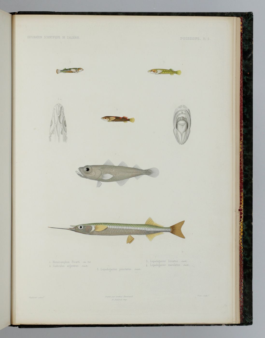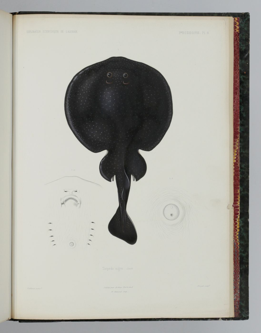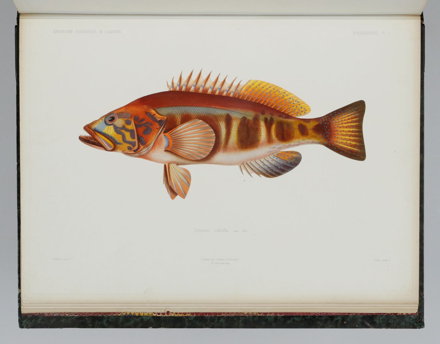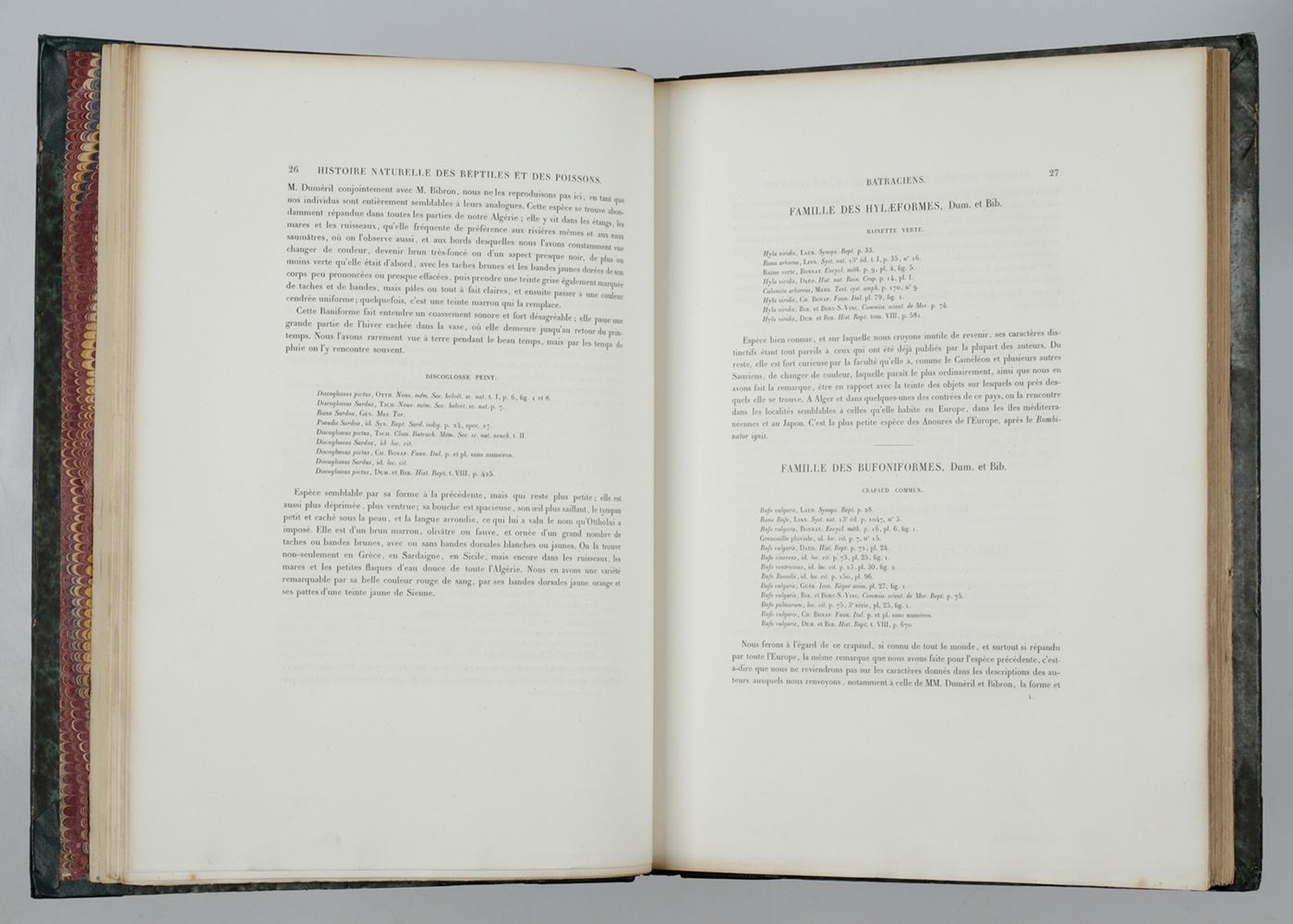 Paris, Arthus Bertrand, 1850. Folio (37.0 x 28.1 cm). Half-title, title page Sciences physiques Zoologie V, with engraved vignette, half-title (to the reptiles and fish); iv, 144, [iv] pp., half-title (to the atlas); 12 plates (four of reptiles and amphibians, eight of fish). The plates are colour-printed engravings à la poupée and then finished by hand. Contemporary half morocco over marbled boards. Spine with five raised bands and gilt title. Marbled endpapers. Speckled edges.
