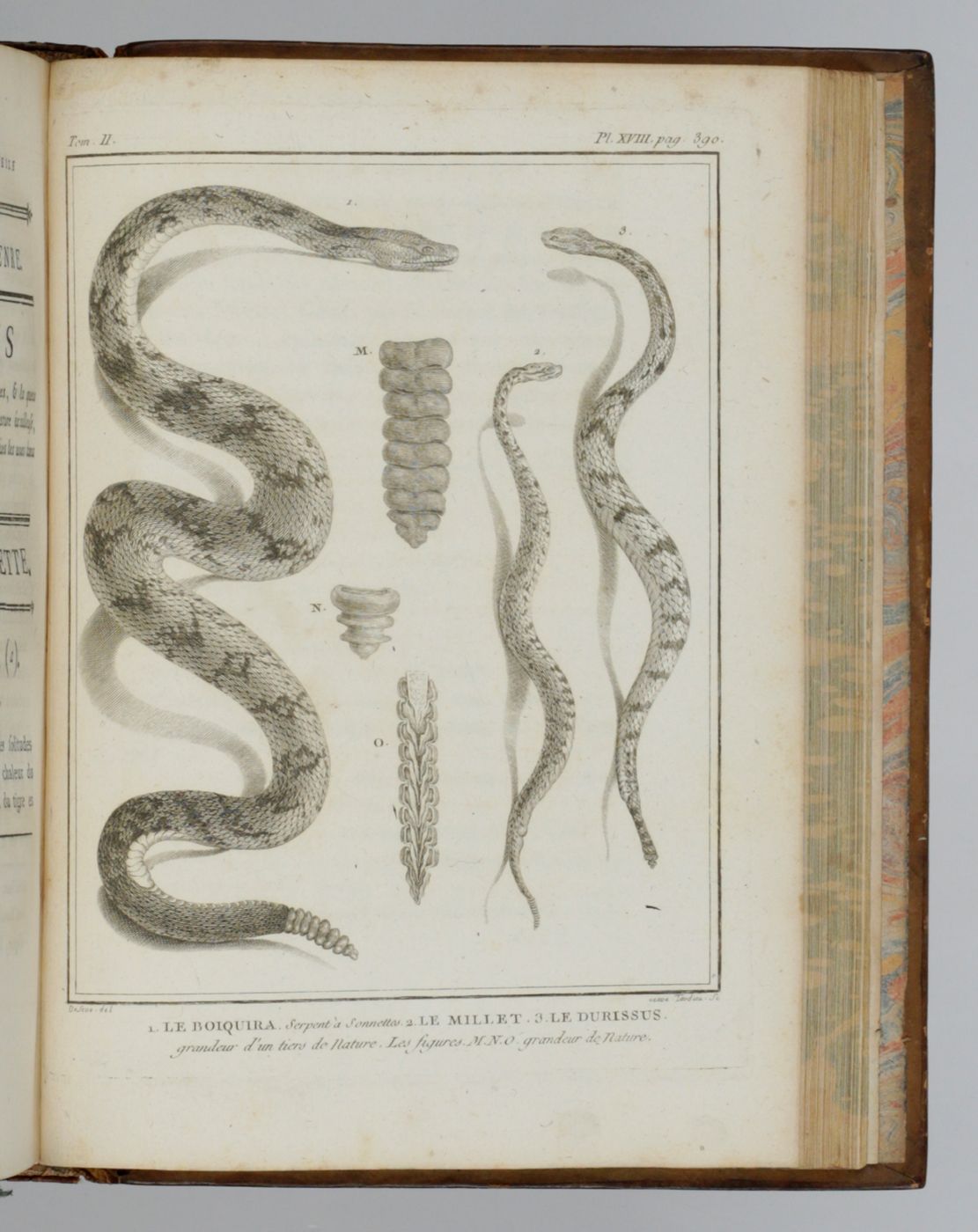 A beautiful copy of the complete, rare, herpetogical part of the first, 4to edition ("PMM edition") of a large and important series on natural history started by Georges-Louis Leclerc, Comte de Buffon (1707-1788), and continued (with these two volumes) by his successor, the naturalist Bernard Germain Étienne de la Ville-sur-Illon, Comte de Lacepède (1756-18250. Together they form a coherent segment of the whole work, which, according to Adler "was the first comprehensive world summary of amphibians and reptiles". The second volume deals exclusively with snakes, and the title is shortened to Histoire naturelle des serpents. Three plates (in the first volume) misnumbered (XV as XI; XXXV as XXXI, and XL as XV). Provenance: On the front pastedowns a bookplate, Bibliothèque du C.en [= Citoyen] Capon; small stamp of Gleizes Notre. JMP on titles. Some rubbing to the boards edges and spine ends; several plates toned, but generally clean. An attractive, uniformly bound set. Do not confuse with the duodecimo edition, published in four volumes, by the the same publisher, in the same years. Adler I, p. 14; Nissen ZBI, 672; PMM 198 (in part); Casey Wood, p. 267.