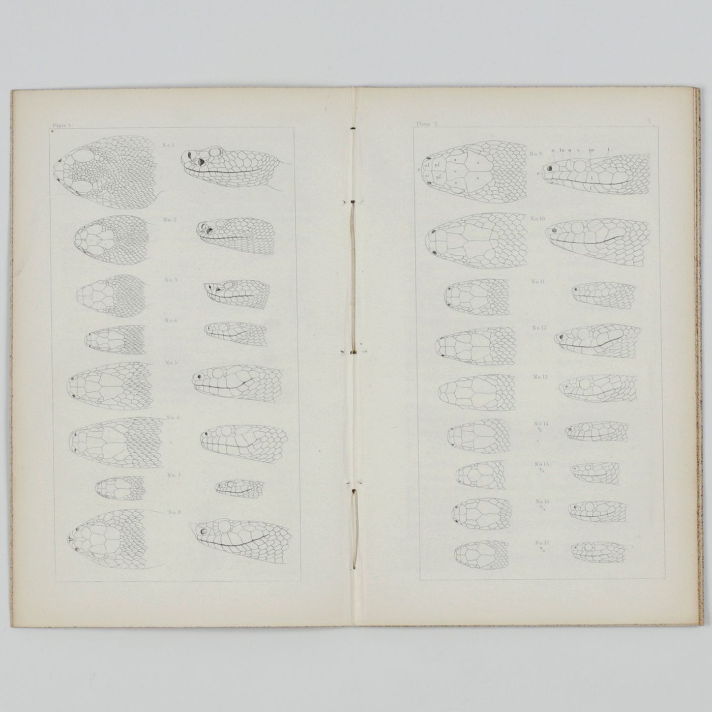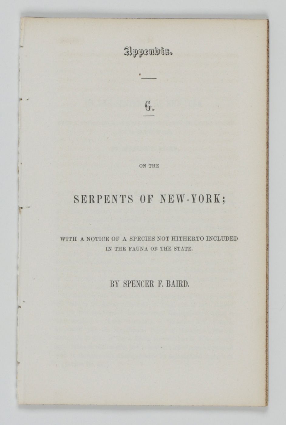 A rare early work on the herpetology, and in particular ophiology, of New York State, written by the American zoologist Spencer Fullerton Baird (1823-1887). Published as an appendix to the Annual Report of the Regents of the University, on the Condition of the State Cabinet of Natural History. A repaginated offprint, which may have been published somewhat later, is rare too. The peculiar numbering ("49½") in Goode's list of Baird's papers is because this work was initially overlooked and then added in an appendix. Stamp of the Elmira College Library in the top margin of one text page, otherwise fine. Adler I, pp. 40-42; Goode, B. G. (1883) The published writings of Spencer Fullerton Baird, 1843-1882, 49½ (p. 229). Although illustrated not in Nissen ZBI.
