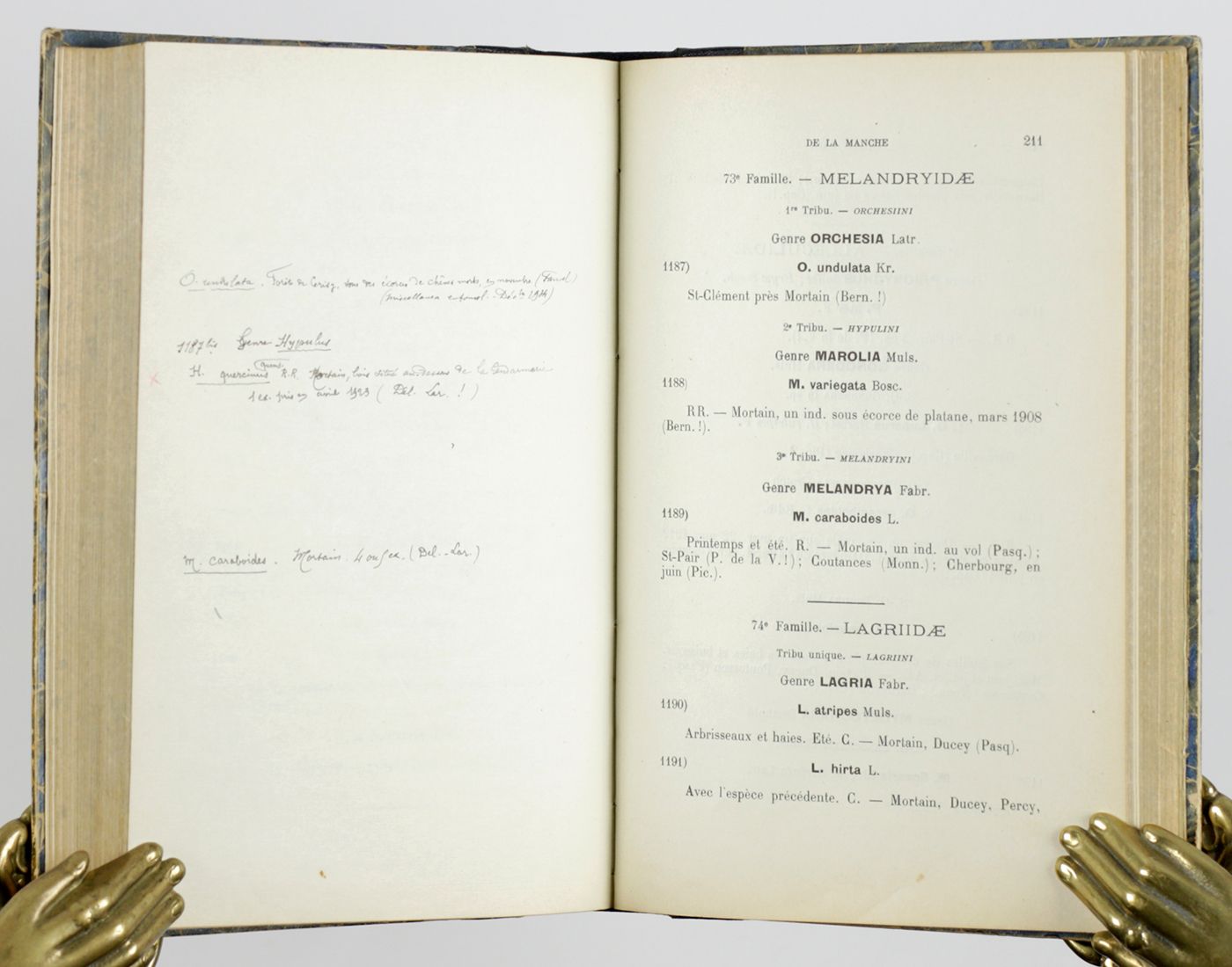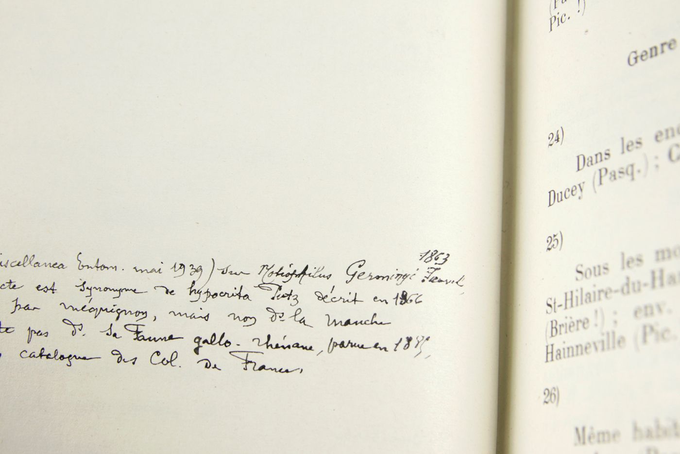 Written by the French entomologist and Roman Catholic canon, Octave Pasquet (1869-1961). It deals with the beetles occurring in north-western France, in an area bordering the English Channel. Offprint, with new title and pagination, from the society's Mémoires, Volume 34, and apparently the author's copy, viz., an interleaved copy, with numerous handwritten annotations in ink (and some in pencil) - perhaps in preparation of an updated, corrected and expanded new edition. The handwritten additions include new localities, names of collectors, literature references, etc. Many annotations, in particular those referring to field observations, are dated, from 1924 up to 1943, the majority in the 1930s. Loosely inserted are four mimeographed papers: 1. A list of new localities (3 pp.); 2. A list of corrigenda (1 p.); 3. A list headed Coléoptères de la Manche ( 2ème liste supplémentare) (6 pp., hand-dated 1950). Also included is 4. A leaf with keys, headed Tableau desCicindela de France pour la determination des especes seulement par le docteur H. Pater, and 5. Two handwritten leaves with a list of beetles received from Ciudad Réal, Spain, in 1918, sent by José Maria de la Fuente (i.e., the Spanish entomologist and fellow clergyman José María Hugo de la Fuente Morales [1855-1932]), and 6. An offprint of a paper by F. Guignot, Sur la capture en France de l'Haliplus lineolatus Mann. [Col. Haliplidae], a species and paper commented upon (handwritten note) by Pasquet. Slight wear to boards and edges; otherwise a very good, clean, unique copy.