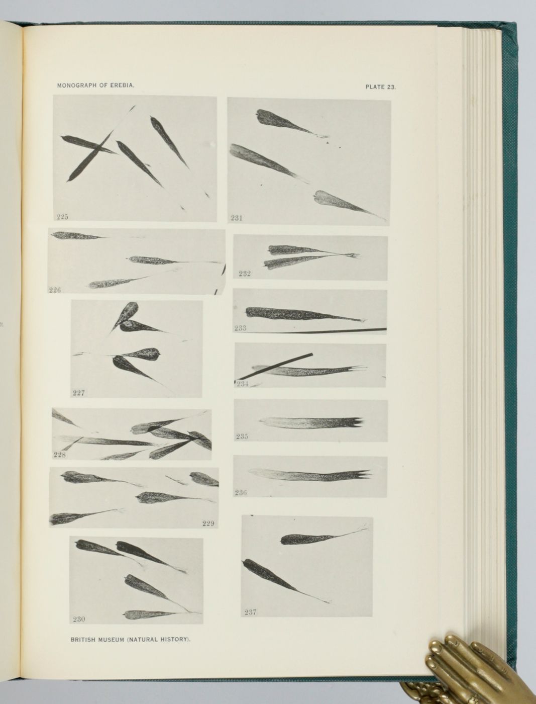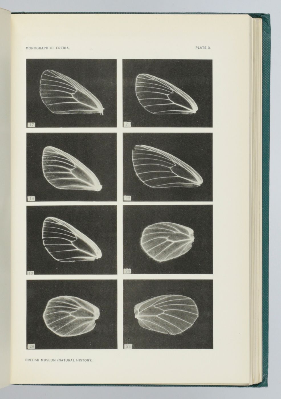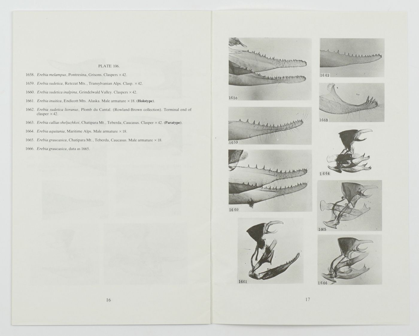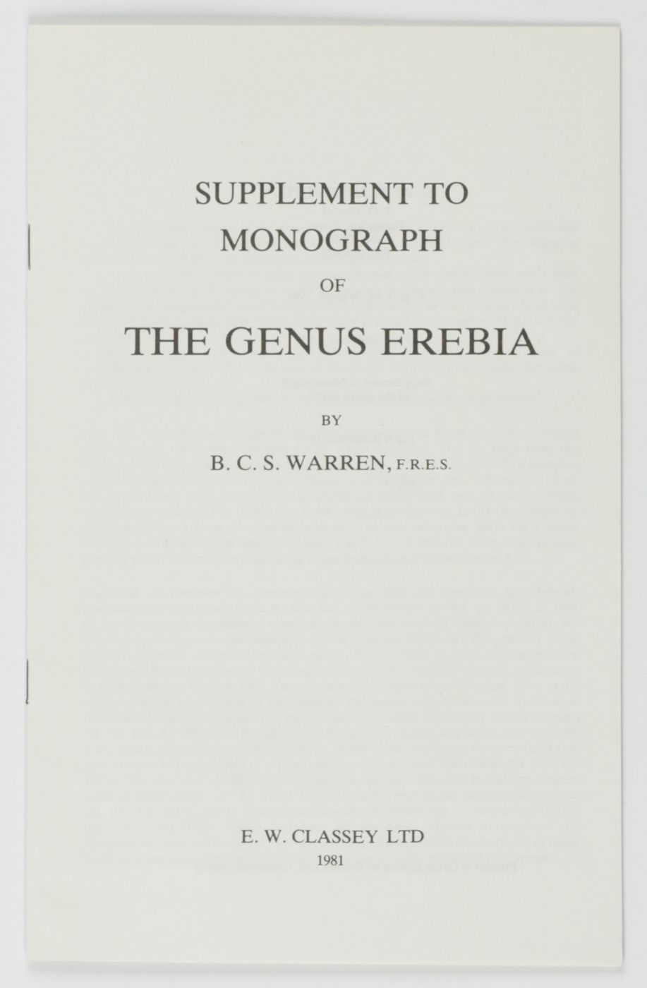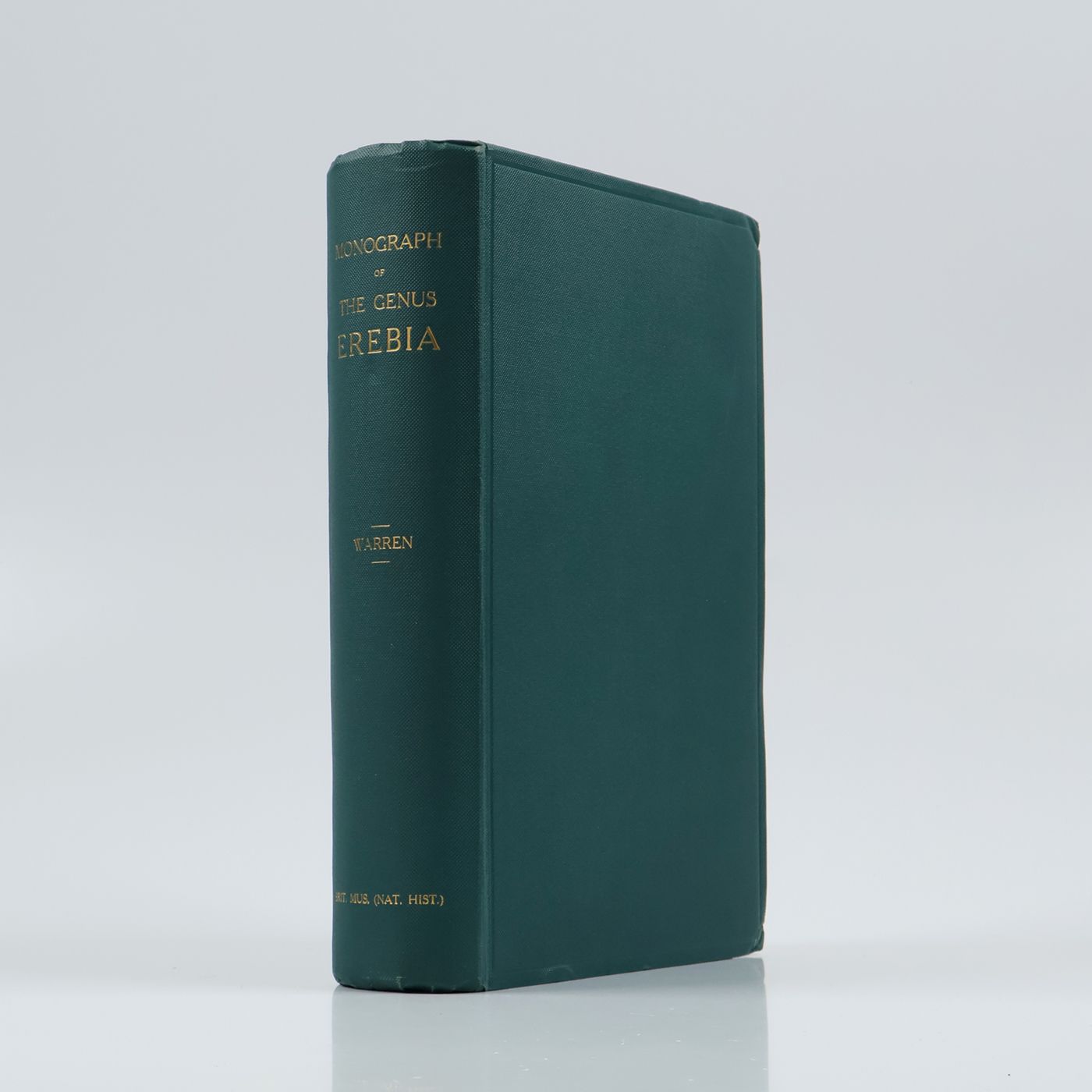 An excellent copy of a magnificent monograph on the brown ringlet butterflies of the family Satyridae, which occurs in the Alpine and Subalpine zones of the Holarctic region. Written and illustrated by the Irish entomologist Brisbane Charles Somerville Warren (1887-1979). Between 1902 and 1960 Warren amassed an extensive collection of nearly 21,000 specimens of Palaearctic Lepidoptera, including 6,200 specimens of Erebia, which are now housed in the Natural History Museum, London. He published 112 scientific papers in all, but this is his magnum opus. De Worms describes his photos as "superb". The plates contain 1,648 individually numbered illustrations. This copy includes the much later (1981!) Supplement, written by Warren, and edited by his daughter and fellow lepidopterologist, Elizabeth J. M. Warren. Provenance: with on the front pastedown a pictorial, lepidopterological bookplate of the French medical biologist and entomologist Paul Thiaucourt (1928-2022), whose collection is now in the Muséum national d'Histoire naturelle in Paris. Corners slightly bumped, otherwise a meticulous copy, as new. It is rare to see this work, in particular with the supplement included. Worms, C. G. M. de (1981) " Obituary. Brisbane Charles Somerville Warren ( 1887-1979)". Entomologist's Record and Journal of Variation 91: 111-112; Vane-Wright & Ackery (1981). " The B.C.S. Warren Collection and its type material". Entomologist's Record and Journal of Variation 93: 1-3, 112-115, 172-175.