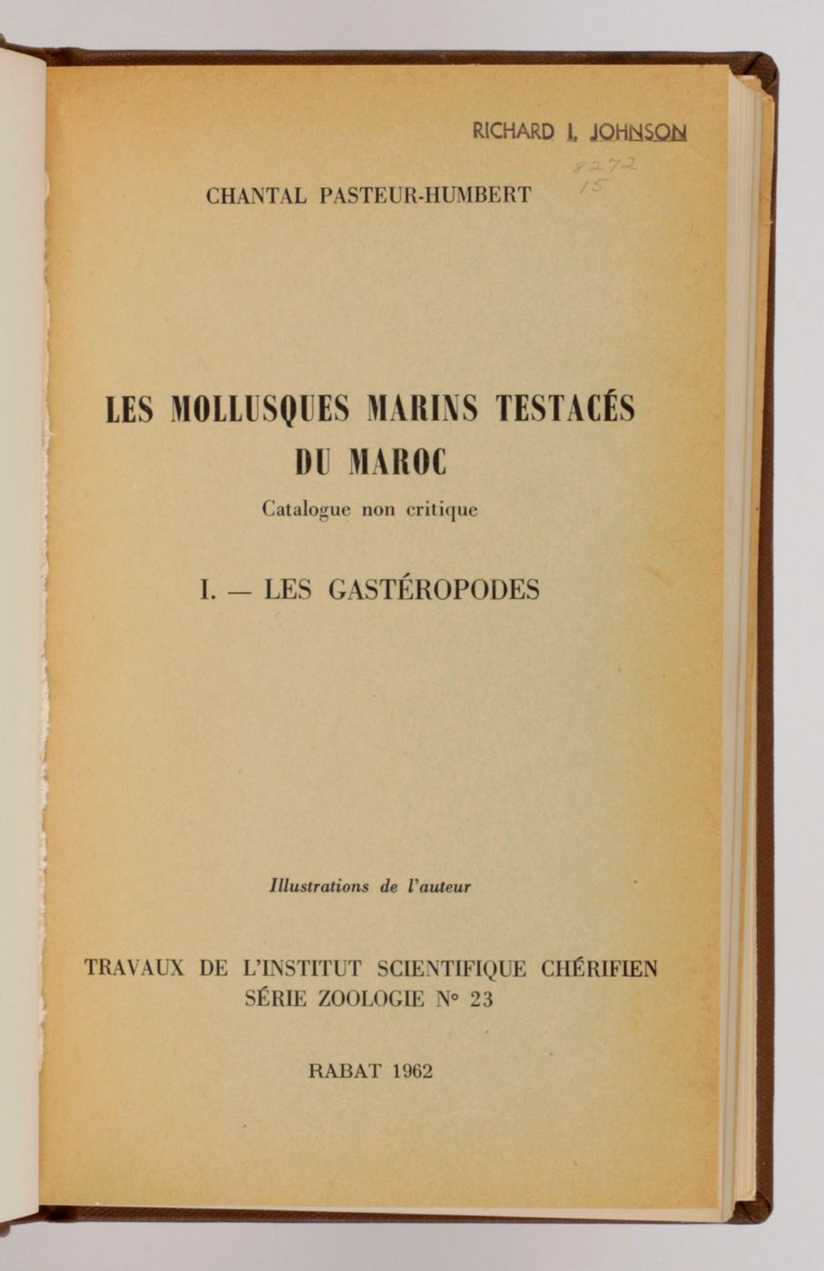 Covering the fauna of Morocco and adjacent seas (Northeast Atlantic, Strait of Gibraltar, and Mediterranean). Includes the smaller and rarer species. With good illustrations by the author, the French-Moroccan malacologist Chantal Pasteur-Humbert (later: Bellon-Humbert) (b. 1929). The supplement, especially (published 11 years after the first two parts) is seldom-seen. A well-bound copy. Small stamp of the American malacologist Richard Irwin Johnson (1925-2020) in the top margin of the front free endpaper recto and first two front wrappers. A very good, complete copy. Bound, complete, copies, such as this one, are rare.