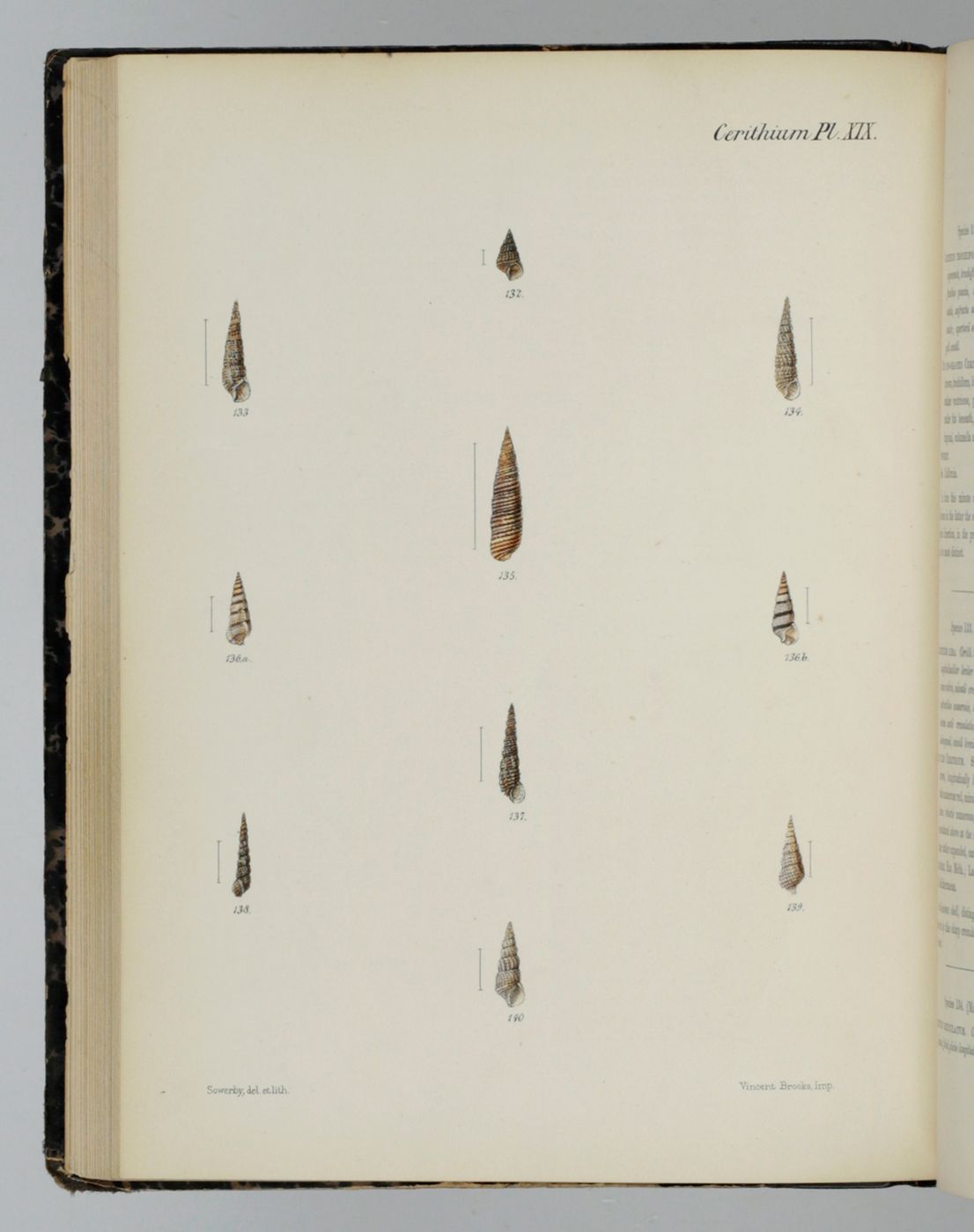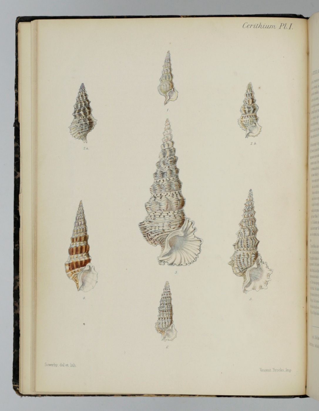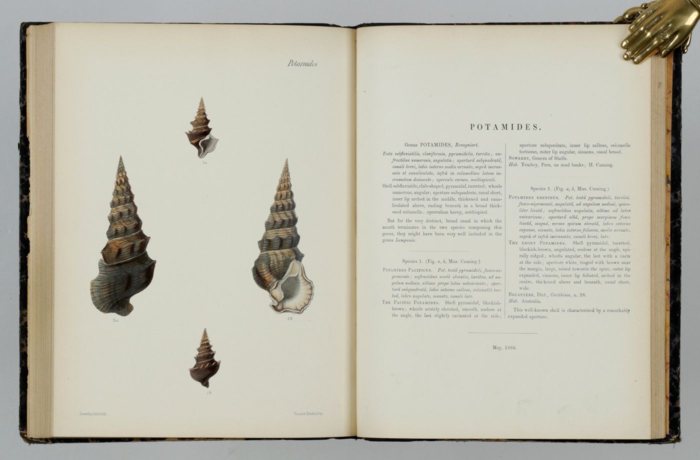 London, Lovell A. Reeve, 1865-1866. Folio (25.9 x 20.3 cm). Titles and indices to all parts, and 36 beautifully hand-coloured plates [ Cerithidea (1866) 4; Cerithium (1865) 20; Lampania 1866) 2; Potamides (1866) 1; Pyrazus (1865) 1; Telescopium (1865) 1; Tympanotonos (1866) 2; Vertagus (1865-1866) 5]; all with explanatory text leaves. Contemporary half calf over marbled boards. Spine with gilt lines and title. Marbled endpapers.