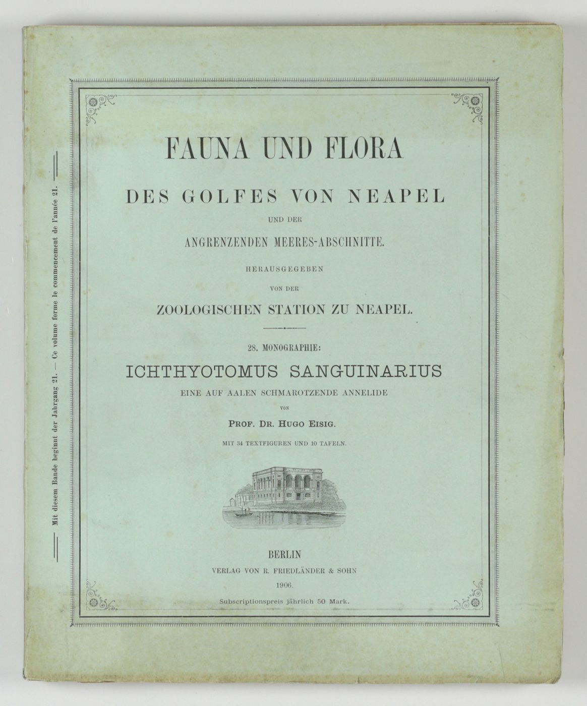 Berlin, R. Friedländer & Sohn, 1906. Large 4to (33.3 x 27.2 cm). 300 pp.; 34 text engravings, ten lithographed plates, of which one (showing an eel as host species and living animals in situ) in full colour, and some others tinted. Original wrappers with printed text and wood engraving of the Institute' s building in Naples.
