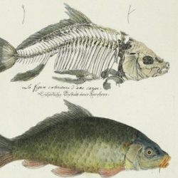 Vorstellungen allerley Thiere mit ihren Gerippe. Plate VII, Das Scelet eines Karpfens [AND] Aüsserliche Gestalt eines Karpfens [AND] Scelet eines an seinem Rückgrad curiös verwachsenen Karpfen, an dessen Kopf hinterwarts die mit Zähnen besezte Kiefer, nebst dem Karpfenstein vorstellig gemacht worden.