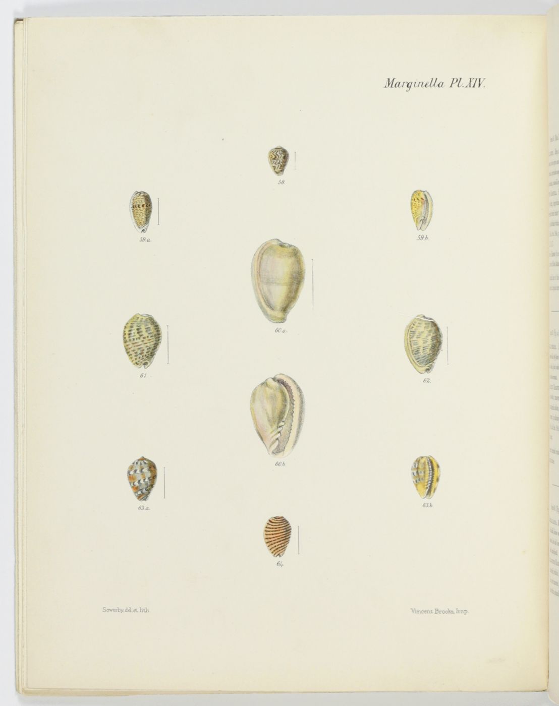 Rare copy of the gastropod genus Marginella (Marginellidae and Cystiscidae). Part of the Conchologia Iconica, started by Lovell Reeve in 1843 and finished (rather than completed) long after Reeve's death in 1865 by G. B. Sowerby, comprising 20 volumes in all. This monograph includes the description and illustration of species described by Reeve himself, and others but not figured before. Most of the descriptions in the Conchologia Iconica (of species and specimens) are based on material collected by the most famous shell collector of the 19th century, Hugh Cuming (1791-1865). "...Reeve had become acquainted with Cuming, and Reeve’s life was changed forever. ... Their association was such as to encourage Reeve to begin the Conchologia Iconica in 1843 primarily for description of Cuming material. Many of the Part covers for the Iconica carry the wording 'Illustrated chiefly from the Cumingian Collection'" (Petit). The wrappers - with L. Reeve & Co.'s Kent address - indicate that the hand colouring might have been done at a later time, following original examples. Paper spine cover a bit chipped; vague bump to upper outer corner, hardly visible. A clean copy with beautifully, accurately hand-coloured plates. Caprotti, p. 213; Nissen ZBI, 3331; R. E. Petit Zootaxa 1648, p. 30.