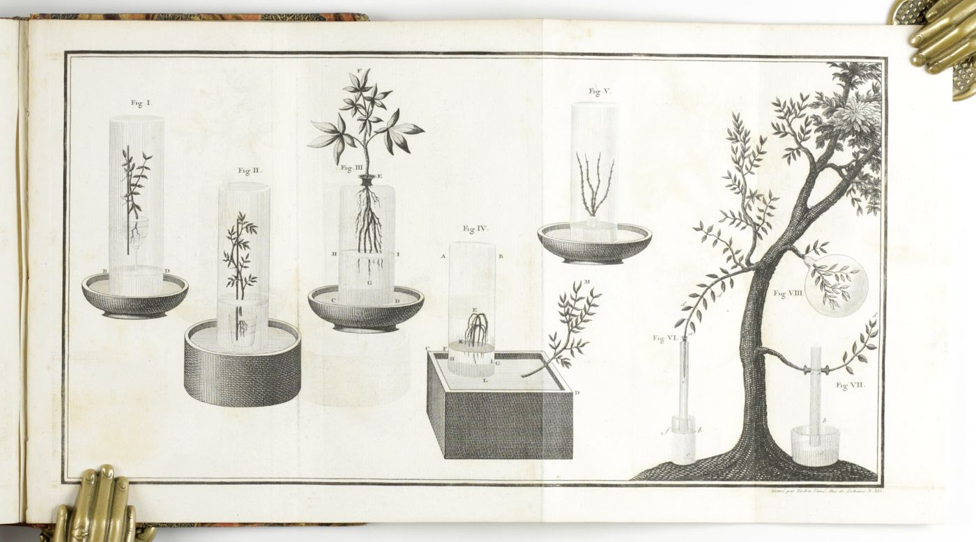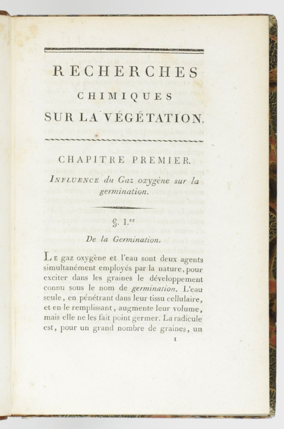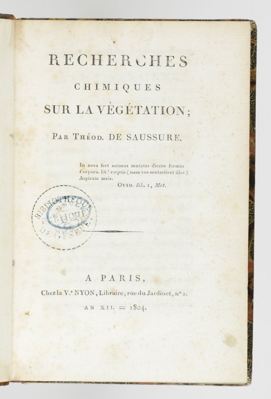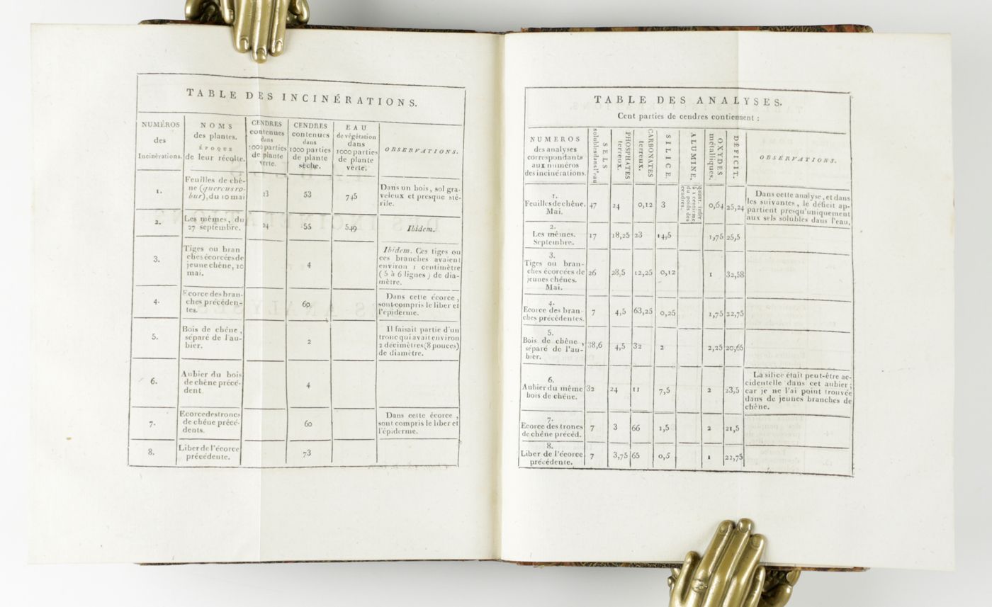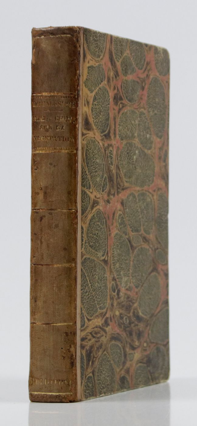 Rare first edition of an important early work on phytochemistry by the Swiss chemist and botanist Nicolas-Théodore de Saussure (1767-1845). DSB: "An immediate success, it was translated into German in 1805 ... and went through many editions. This work which took seven years to write, laid the foundation of a new science: phytochemistry. Saussure examined the chief active components of plants, their synthesis and their decomposition. He specified the relationship between vegetation and the environment and here too, did pioneering work in what became the fields of pedology and ecology". Old owner's inscription, dated, on the front free endpaper recto; old library stamp on title; some very light foxing. In all a very good copy in a nice contempirary binding. DSB 12, pp. 123-124; Pritzel 8051.