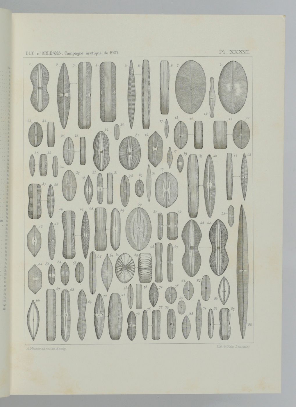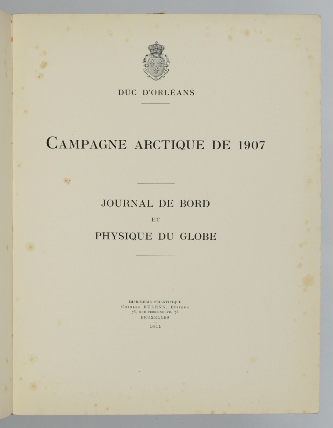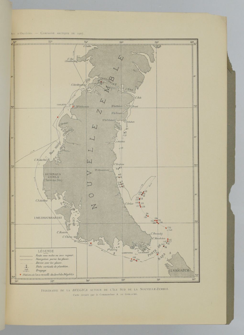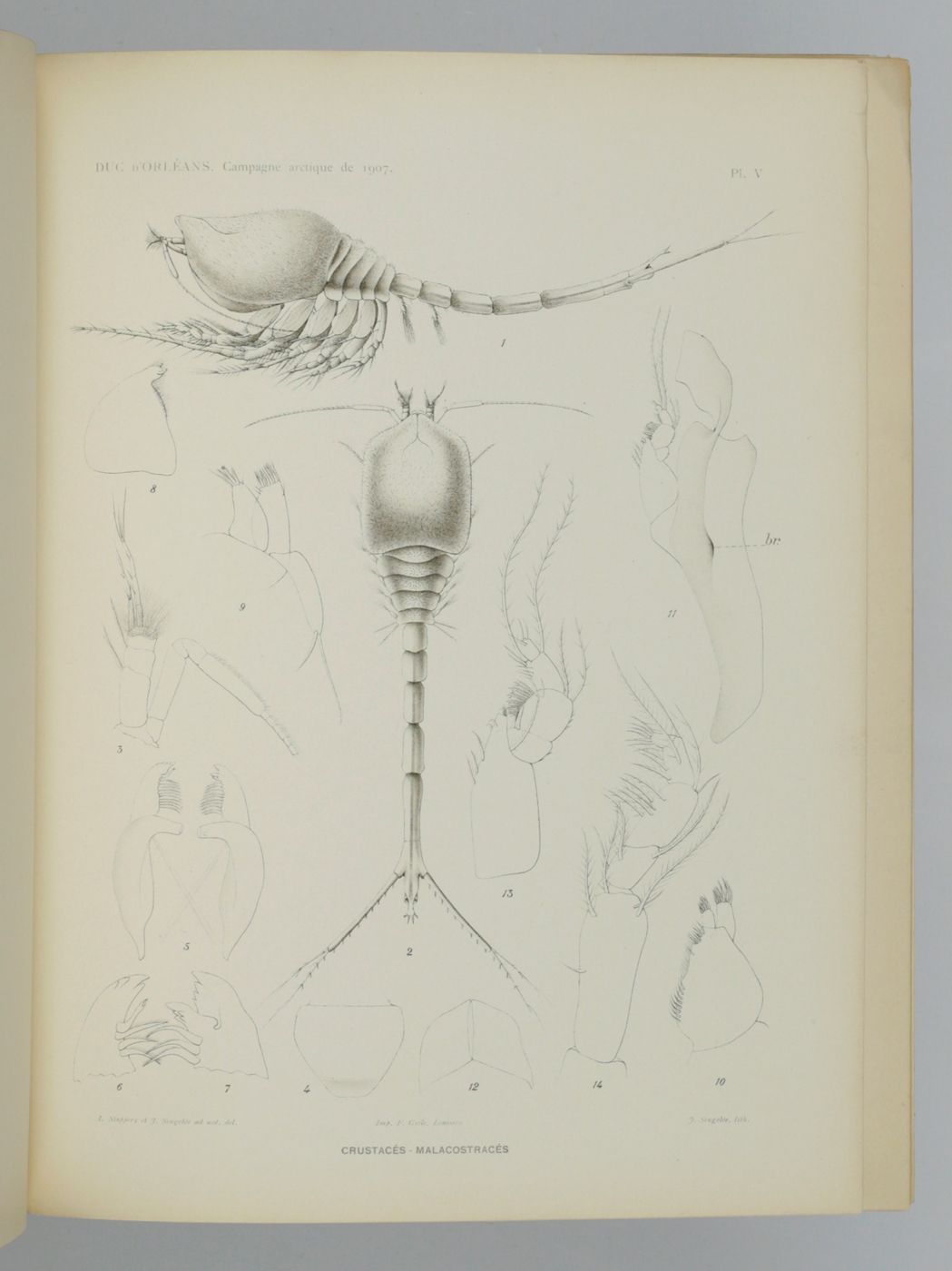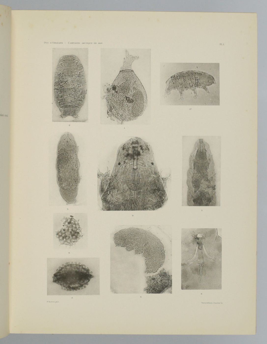 Important contributions to the northern Arctic Seas, especially to the seas around Novaya Zemlya, privately printed at the expense of the Duc d'Orléans. The published works consists of ten parts, as follows: (1). d'Orléans, L. P. R. Duc, Journal de Bord et de Physique du Globe (1911). 99 pp., ten plates, two folded maps; (2) Dautzenberg, P. and H. Fischer. Mollusques et Brachiopodes (1910). 25 pp., map; (3) Fauvel, P. Annélides polychètes (1911). 45, iv pp.; plate, map; (4) Grieg, J. Echinodermes (1910). 40 pp., lithographed plate, two folded maps; (5-6) Meunier, A. Microplankton des Mers de Barents et de Kara (1910). 373 pp., 37 loose plates (I-XXXVI, Ibis) with explanatory text leaves, in two volumes, including a half cloth portfolio with printed boards; (7) Richters, F. Faune des Mousses: Tardigrades (1911). 20 pp., two plates; (8) Stappers, L. Crustacés malacostracés (1911). 164 pp., seven lithographed plates, map; (9) Thoulet, J. Étude lithologique de fonds recueillis dans les Parages de la Nouvelle-Zemble (1910). 28 pp., two tables, map. Finally, a part on bryozoaires was published (written by O. Nordgaard), which is not uncommon, but not included. A few wrappers a bit worn; one with marginal repairs; a few stamps on preliminaries, otherwise an excellent set.