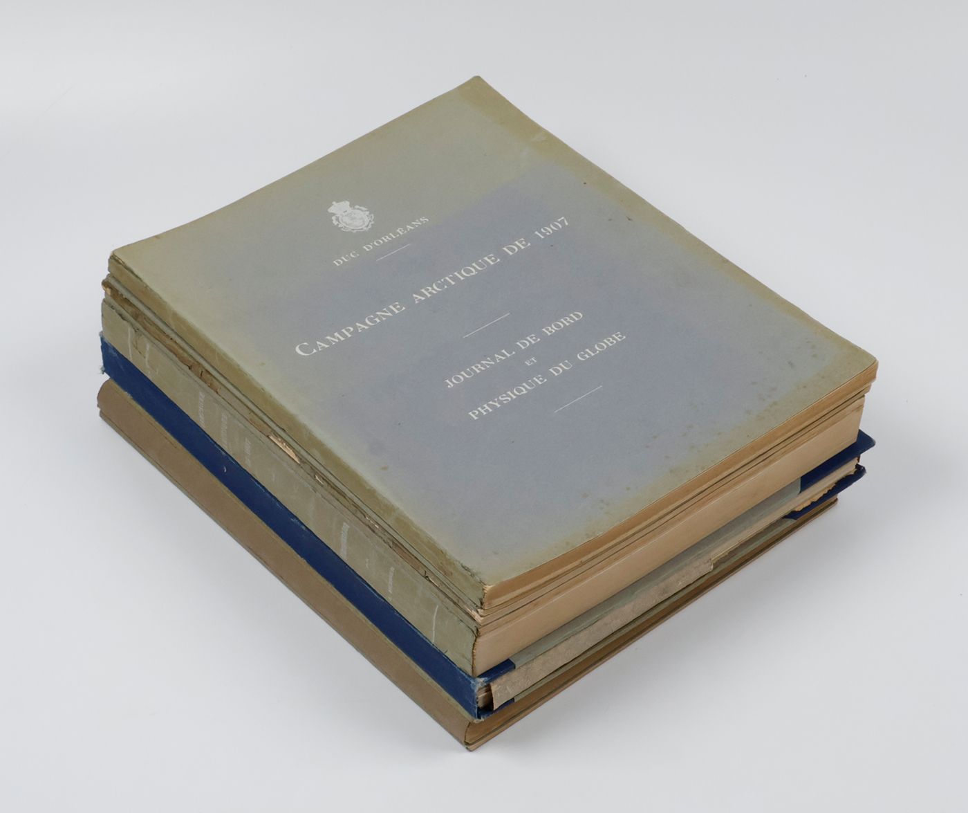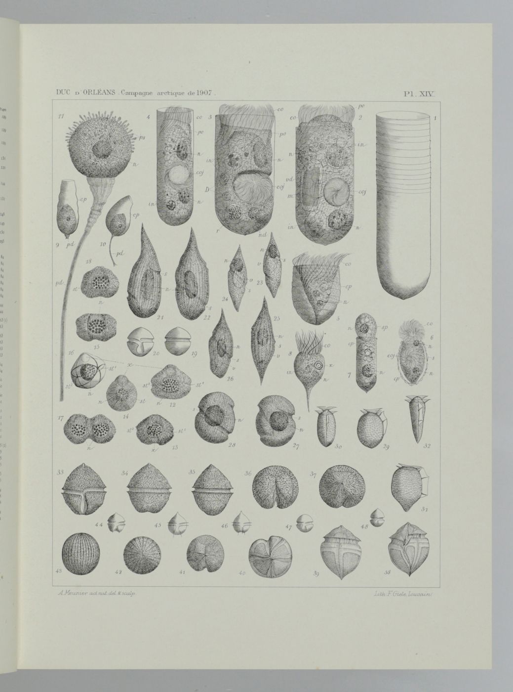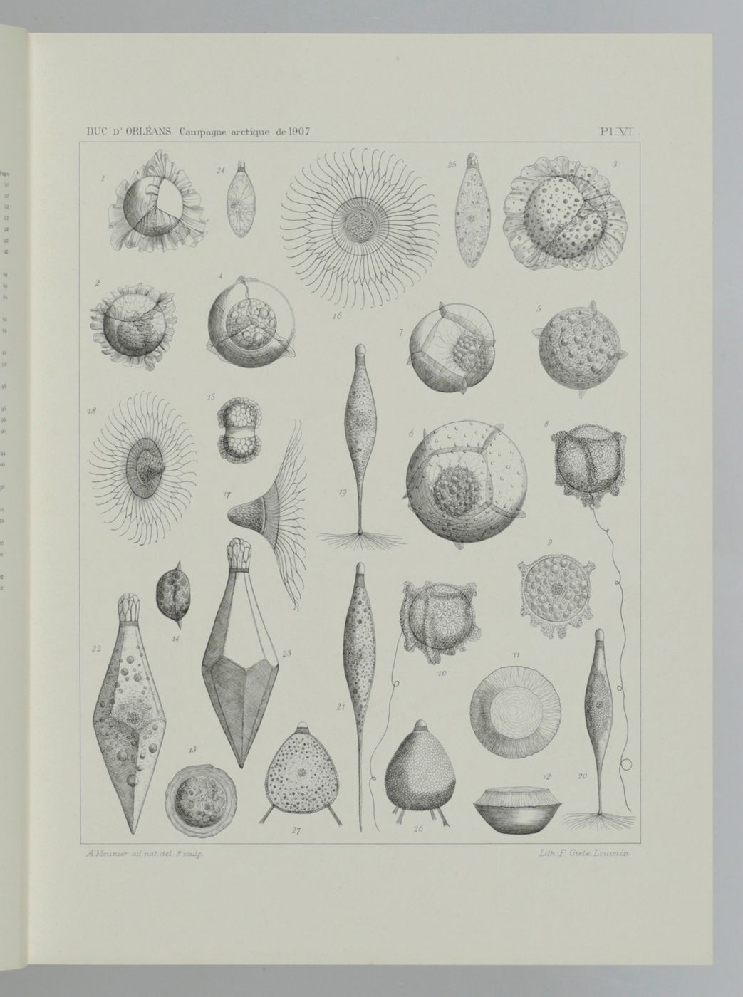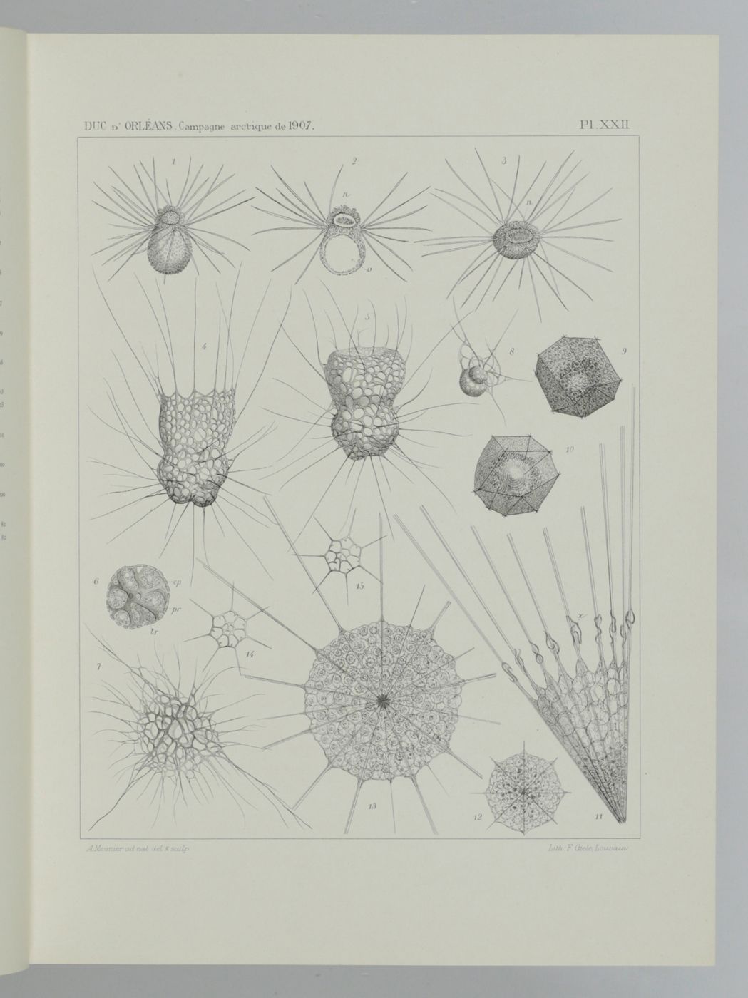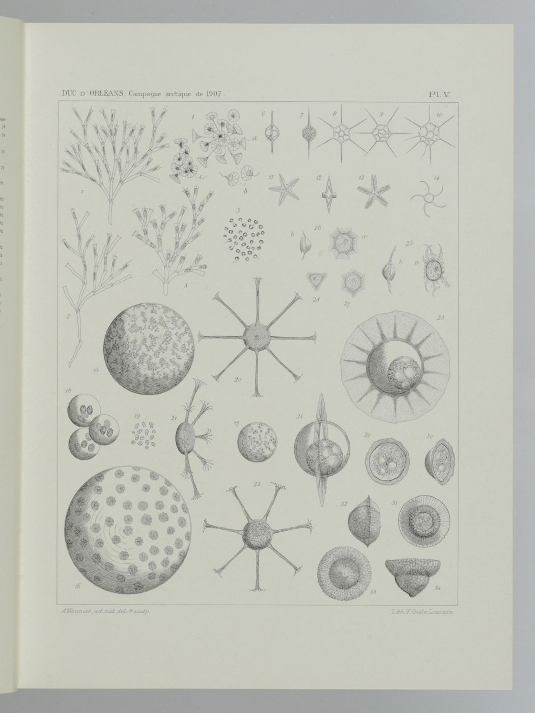 Important contributions to the northern Arctic Seas, especially to the seas around Novaya Zemlya, privately printed at the expense of the Duc d'Orléans. The published works consists of ten parts, as follows: (1). d'Orléans, L. P. R. Duc, Journal de Bord et de Physique du Globe (1911). 99 pp., ten plates, two folded maps; (2) Dautzenberg, P. and H. Fischer. Mollusques et Brachiopodes (1910). 25 pp., map; (3) Fauvel, P. Annélides polychètes (1911). 45, iv pp.; plate, map; (4) Grieg, J. Echinodermes (1910). 40 pp., lithographed plate, two folded maps; (5-6) Meunier, A. Microplankton des Mers de Barents et de Kara (1910). 373 pp., 37 loose plates (I-XXXVI, Ibis) with explanatory text leaves, in two volumes, including a half cloth portfolio with printed boards; (7) Richters, F. Faune des Mousses: Tardigrades (1911). 20 pp., two plates; (8) Stappers, L. Crustacés malacostracés (1911). 164 pp., seven lithographed plates, map; (9) Thoulet, J. Étude lithologique de fonds recueillis dans les Parages de la Nouvelle-Zemble (1910). 28 pp., two tables, map. Finally, a part on bryozoaires was published (written by O. Nordgaard), which is not uncommon, but not included. A few wrappers a bit worn; one with marginal repairs; a few stamps on preliminaries, otherwise an excellent set.