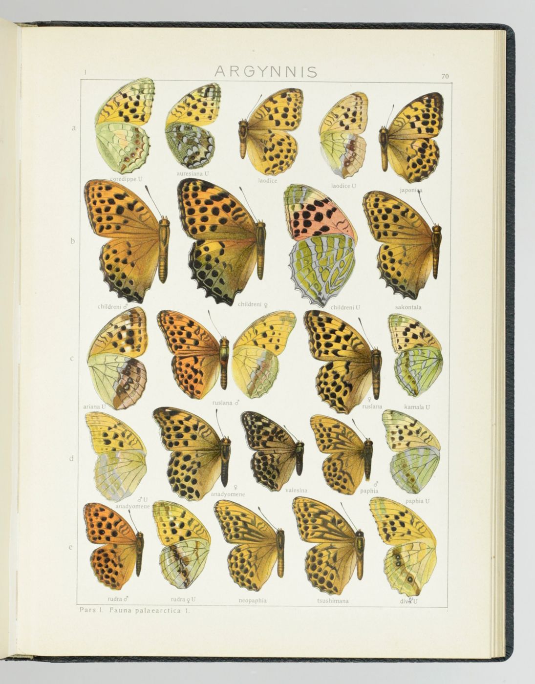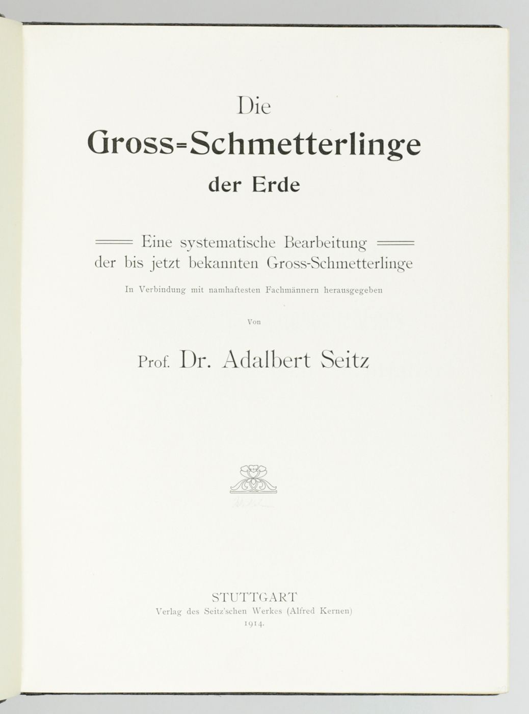 This attractively bound set, with Jugendstil vignettes on the front boards, comprises the complete original section of the Palaearctic butterflies and larger moths; i.e., those of Europe, northern Africa, and all but tropical Asia. Its fine plates were made using the process of 10- to 14-colour lithography, and its excellent quality has remained unsurpassed. The editor, Friedrich Joseph Adalbert Seitz (1860-1938), planned to finish the whole work in 1912. This proved to be quite unrealistic, as publication stopped in 1954 and several volumes remained unfinished. This first set (started in 1906), consists of the following parts: Band [Volume] 1. Die Palaearktischen Tagfalter; Band 2. Die Palaearktischen Spinner & Schwärmer; Band 3. Die eulenartigen Nachtfalter; and Band 4. Die Palaearktischen spannerartigen Nachtfalter. In total there are no fewer than 12,274 individual illustrations. This is all that Seitz intended to publish, but due to new discoveries and developments he later decided to add several supplements. These much later (1932-1954) supplements, however, are not included. The atlases to the third and comparatively small fourth part are bound together. The spelling Groß-Schmetterlinge occurs only in Volume I; in the following volumes it was changed into Gross-Schmetterlinge. Some neat annotations and corrections in a small, old hand. Light wear to a few spine ends; gilt vignette of a few volumes faded, otherwise an excellent set. Cat. BM(NH), p. 1895; Nissen ZBI, 3799N. NOTE: we have more parts of the Gross-Schmetterlinge der Erde. Please inquire.