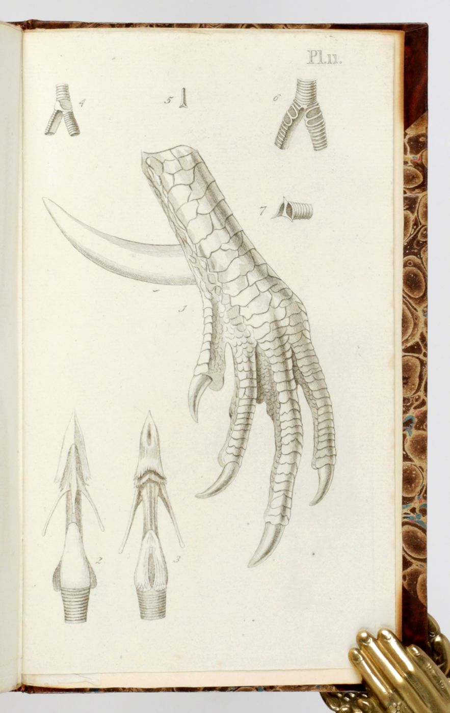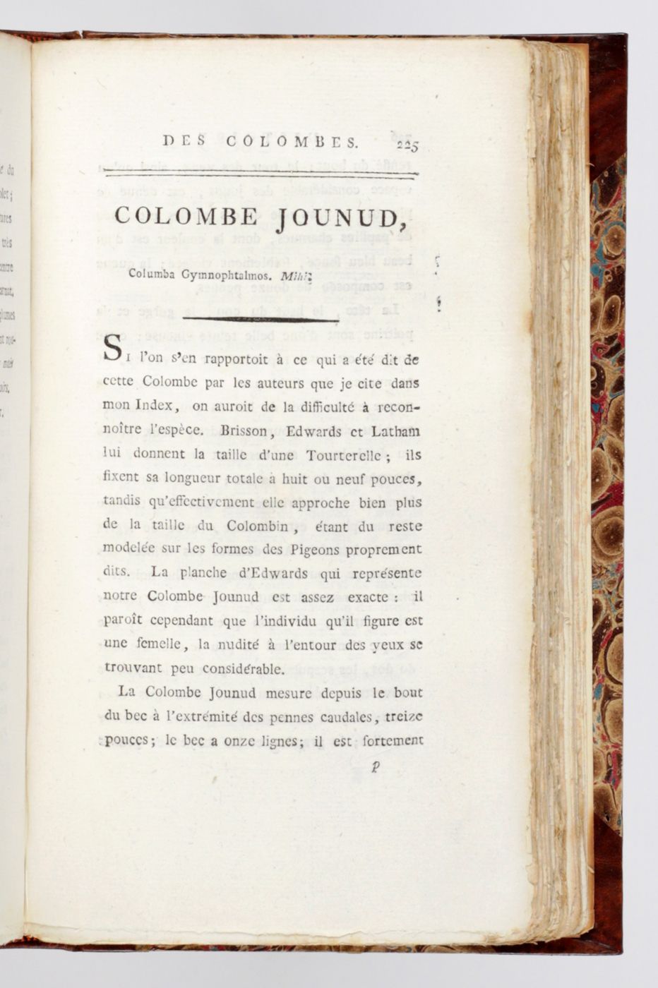 This is the complete text, as intended by the most influential and famous Dutch ornithologist, Coenraad Jacob Temminck (1778-1858), for the Parisian published Histoire naturelle générale des pigeons; par C. J. Temminck, Directeur de l'Académie Royale des Sciences et des Arts de Harlem, et membre de plusieurs Sociétés d'Histoire naturelle. Avec figures en couleurs, peintes par madamoiselle Pauline de Courcelles, gravées, imprimées et retouchées sous sa direction (1808-1811), which was published in 12 copies only, as the illustrator, Pauline Knip, née de Courcelles 'kidnapped' the work, much altered the text, and provided a new title, Les pigeons par Madame Knip née Pauline de Courcelles, premier peintre d'histoire naturelle de S. M. l'Impératrice Reine Marie-Louise [Napoléon]. Le texte par C. J. Temminck. Temminck, living in Leiden, 500 kilometres north of Paris, remained unaware of this for a long time, because he received a few unaltered copies. Co-operation with Madame Knip was terminated, and the plate atlas for the gallinacés was never published, but these volumes do contain all the text. From a taxonomical and nomenclatural point of view, the present work is the most important, as it contains new descriptions and new, valid names. The third volume was published two years after the first, and by that time, after the end of the Napoleonic era, the 'Ordre Impérial de la Réunion' established by Napoleon in 1811, had lost its significance, hence it was omitted in the third title. Tiny label of F. H. Danner, bookbinder in Utrecht, mounted on rear pastedowns. In the rear, the publisher added a leaf with the short title printed thrice, for library reference purposes; in all parts, the lower two have been cut out, as to be expected. Boards a bit rubbed at joints; otherwise, a near mint set. Very rare. Nissen IVB, 931; Zimmer, pp. 625-626.
