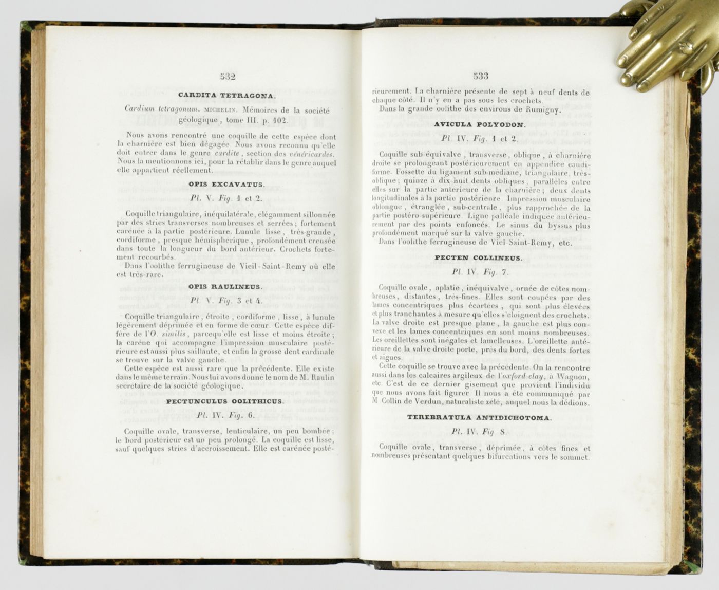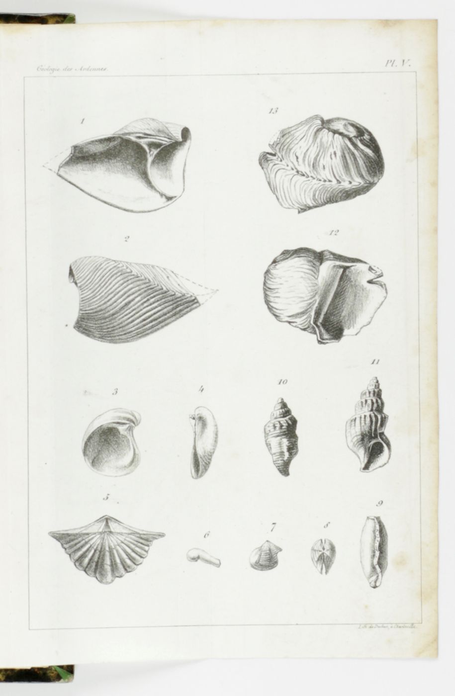 An important contribution to the geology and palaeontology of the Ardennes region in north-eastern France, bordering Belgium, Luxemburg and Germany. The French geologist and metallurgist François-Clément Sauvage (1814-1872) was responsible for the geological part, while the French geologist and palaeontologist Nicolas-Armand Buvignier (1808-1880) dealt with the Mesozoic molluscs, mainly bivalves and gastropods. Several species are described as new. Buvignier wrote several works on fossil molluscs and has the palaeontologically significant snail genus Buvignieria named after him. Inscribed, in an old hand, on the half-title verso; the name Lepellier gilted in the spine foot, and on the first blank recto the stamp of the French mineralogist and professor at the École des Mines, Claude Jean Guy Guillemin (1923-1994), and his mineralogical bookplate on the front pastedown. A very good copy. Cat. BM(NH), p. 1813. Neither in Nissen, ZBI, nor in Ward and Carozzi.