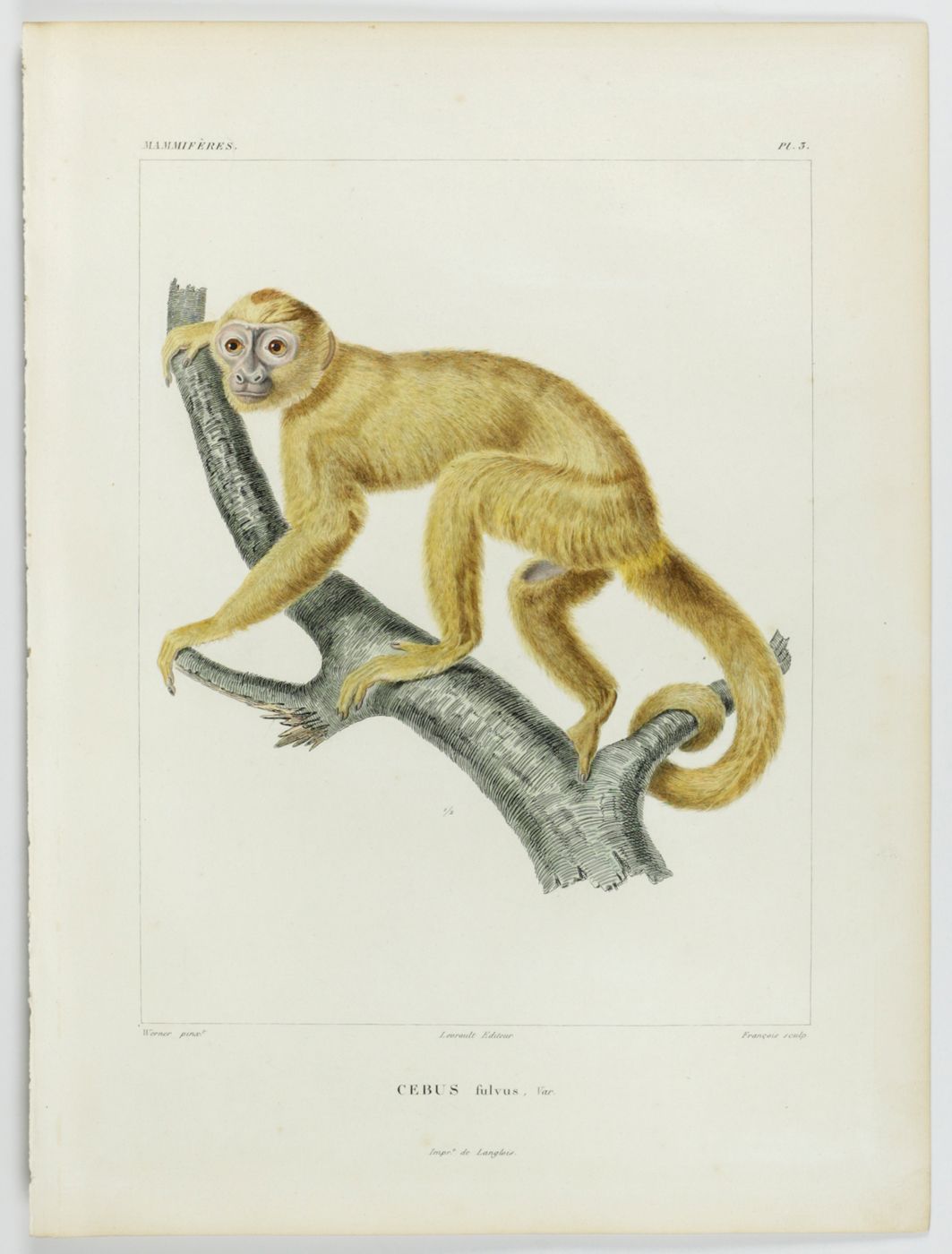 Voyage dans l'Amérique méridionale (le Brésil, la république orientale de l'Uruguay, la république Argentine, la Patagonie, la république du Chili, la république de Bolivia, la république du Perou). Exécuté dans le cours des années 1826, 1827, 1828, 1829, 1830, 1831, 1832 et 1833. Atlas. Zoologique. Mammifères. Plate 3. Cebus fulvus var.