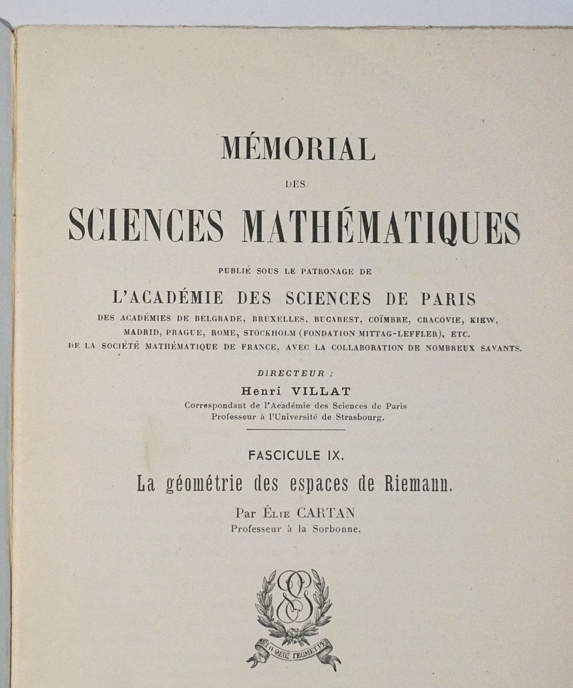 Élie Joseph Cartan (1869-1951) "did fundamental work in the theory of Lie groups, differential systems (coordinate-free geometric formulation of PDEs), and differential geometry. He also made significant contributions to general relativity and indirectly to quantum mechanics. He is widely regarded as one of the greatest mathematicians of the twentieth century ... Cartan showed how to use his concept of connection to obtain a much more elegant and simple presentation of Riemannian geometry. His chief contribution to the latter, however, was the discovery and study of the symmetric Riemann spaces, one of the few instances in which the initiator of a mathematical theory was also the one who brought it to its completion" (Wikipedia). Offprint ( Fascicule IX) from Mémorial des Sciences Mathématiques. Handwritten dedication written and signed by Cartan to "mon collègue" ... Moulins. Uncut. Light creasing to top margin, otherwise very good.