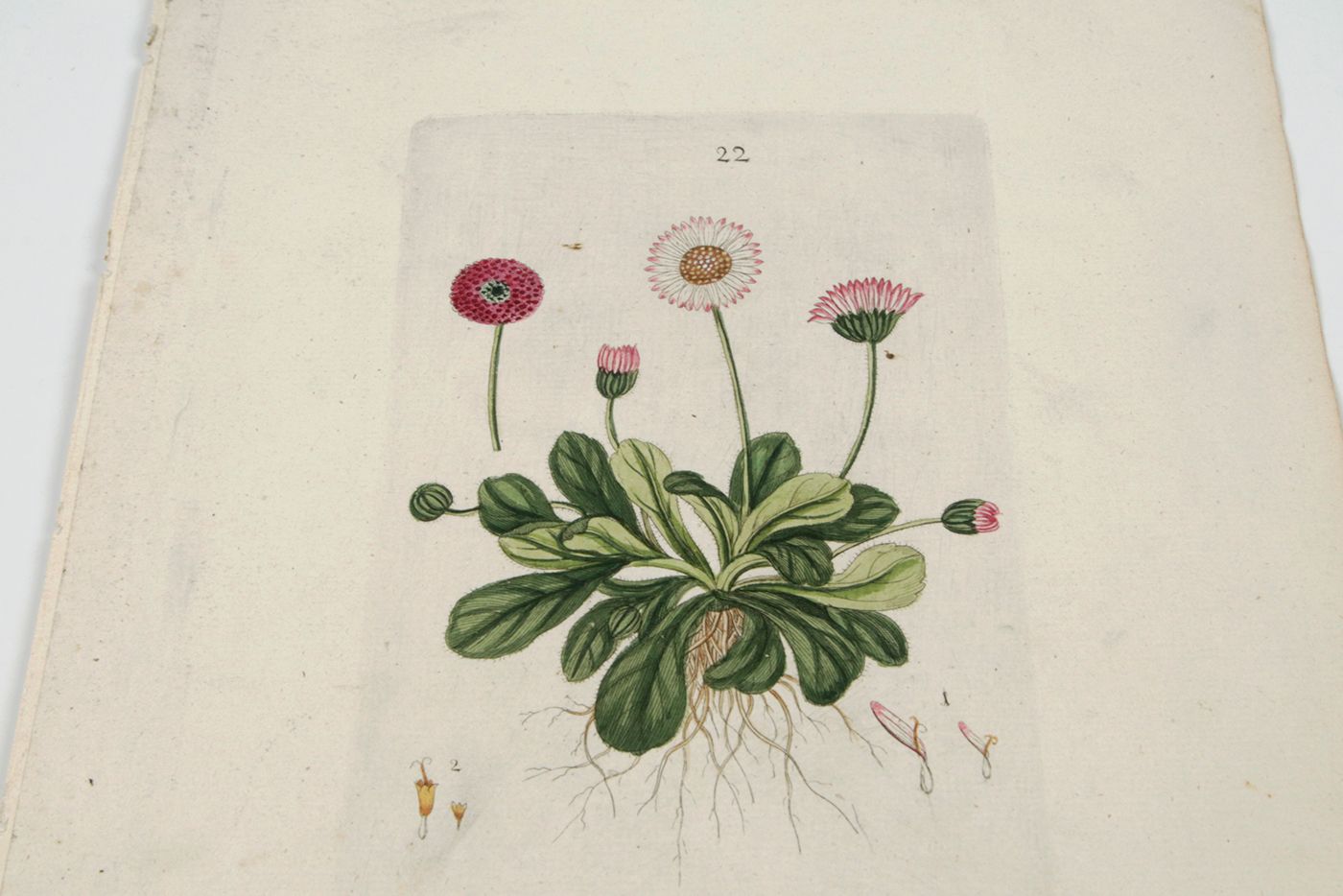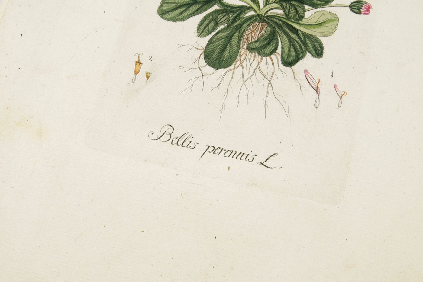 The Pharmaceutica is a very rare work; it is seldom found complete and even individual plates of plants are rare. This "everlasting beauty" (its Latin name), has a very long flowering season and will even adorn lawns with its pretty flowers in the middle of mild winters. Andreas Friedrich Happe (1733-1802) was a well-known artist, engraver, and naturalist as well as a pharmacist. He was born in Aschersleben and died in Berlin in 1802. He published a number of books on pharmaceutical botany of which the most important is his Botanica pharmaceutica… Berlin 1785 (-1806). This print of a daisy is in very good condition, with a few very small spots and some very weak, marginal creasing only. No dents or chips present. The colouring is precise and accurate. Nissen BBI, 784. Stafleu and Cowan (under 2834) "Not seen".