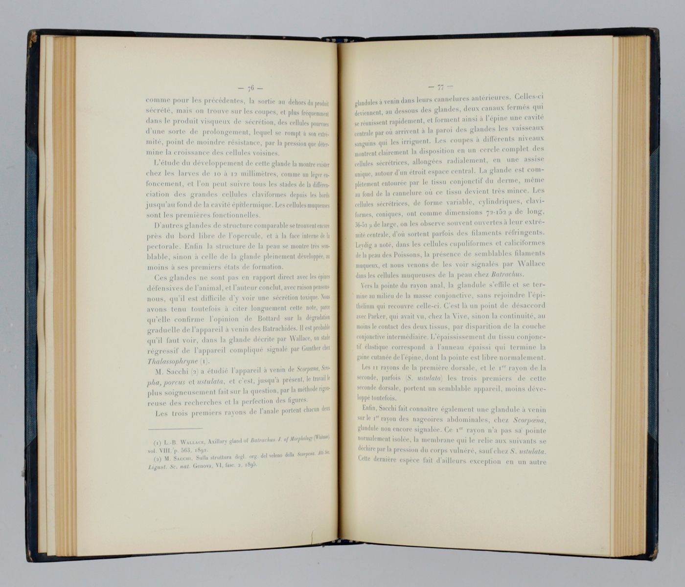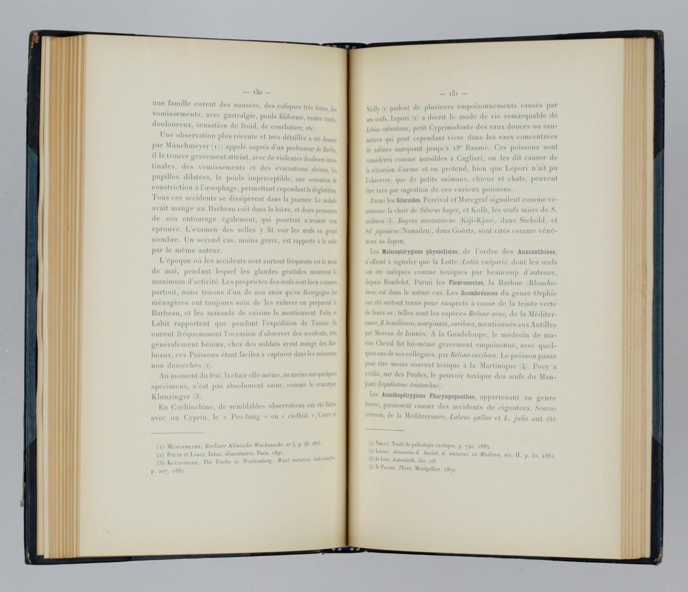 A seldom-seen work by the French zoologist, ichthyologist, and, chiefly, carcinologist François Louis Henri "Henry" Coutière (1869-1952). Although the spine vignettes may suggest that this work is about snake "poison", it actually is about poisons and toxics in fish (poissons). Remnants of glue and paper on the front pastedown; hinges weak, some wear to the edges; otherwise very good. Front hinge starting; otherwise, the binding is very attractive. Definitely rare when complete with the wrappers, such as this copy. Not in Cat. BM(NH).