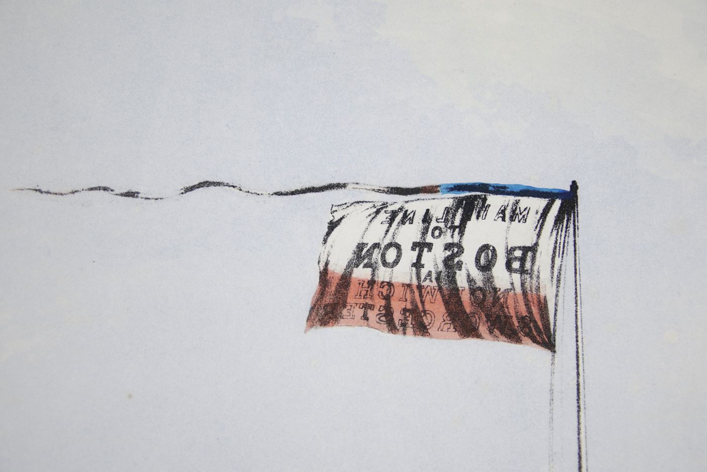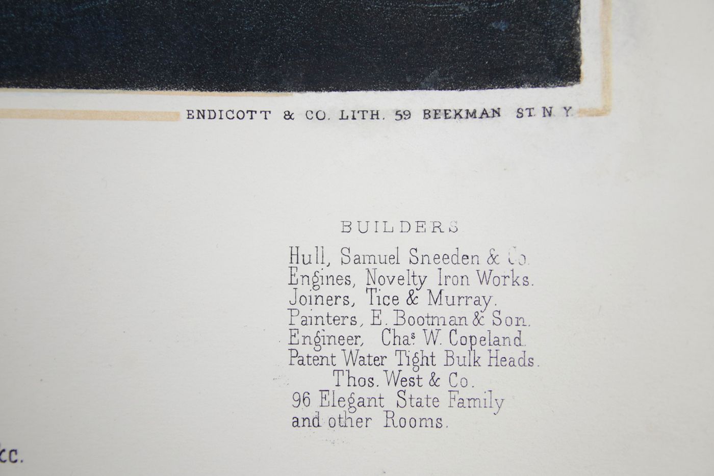 A very large, seldom-seen originally hand-coloured print depicting the City of New York, a paddle steamer built, together with its twin, City of Boston, in 1861, for the Norwich & New York Transportation Company, for the route between these two cities through the Long Island Strait, and inland through New London, Norwich and Worcester. Both ships were just over 100 meters long, weighed 1,500 tonnes and had wooden hulls. More detailed information on the ship's specifications is printed below the image. Skilful repairs to tears in the left and right margin, just into the printed area. Otherwise an attractive, bright and fresh lithograph. Morrison, J. H., History of American Steam Navigation, pp. 331-332; Stanton, S. W. Stanton's American Steam Vessels, pp. 164-165.
