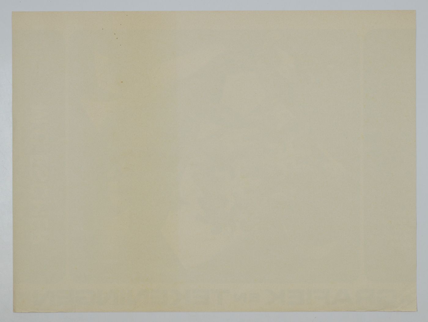 Vintage window poster, announcing a catalogue, Grafiek en Tekeningen, of graphic works by the world-famous Dutch artist Maurits Cornelis Escher (1898-1972). This poster for bookshops states "Met 82 afb. hier verkrijgbaar" (with 82 ill.[ustrations], available here), and contains a quote by Escher "De ideeën die er aan ten grondslag liggen getuigen veelal van mijn verwondering over- en mijn bewondering voor wetmatigheden die de ruimte om ons heen bevat. Wie zich verwondert, geeft zich rekenschap van een wonder" ( The underlying ideas often testify to my amazement and admiration for the laws that the space around us contains. Whoever wonders, realizes a miracle). Apparently, there were two varieties of this poster. This is the 'landscape' (oblong) variety showing part of Escher's Reptiles, a 'classic' Escher, made in 1943 (Bool 327). Published during Escher's life time, this poster design, therefore, most probably personally approved by him. Short tear and some minor creasing in lower margin, outside the printed area, otherwise a very good, clean copy.