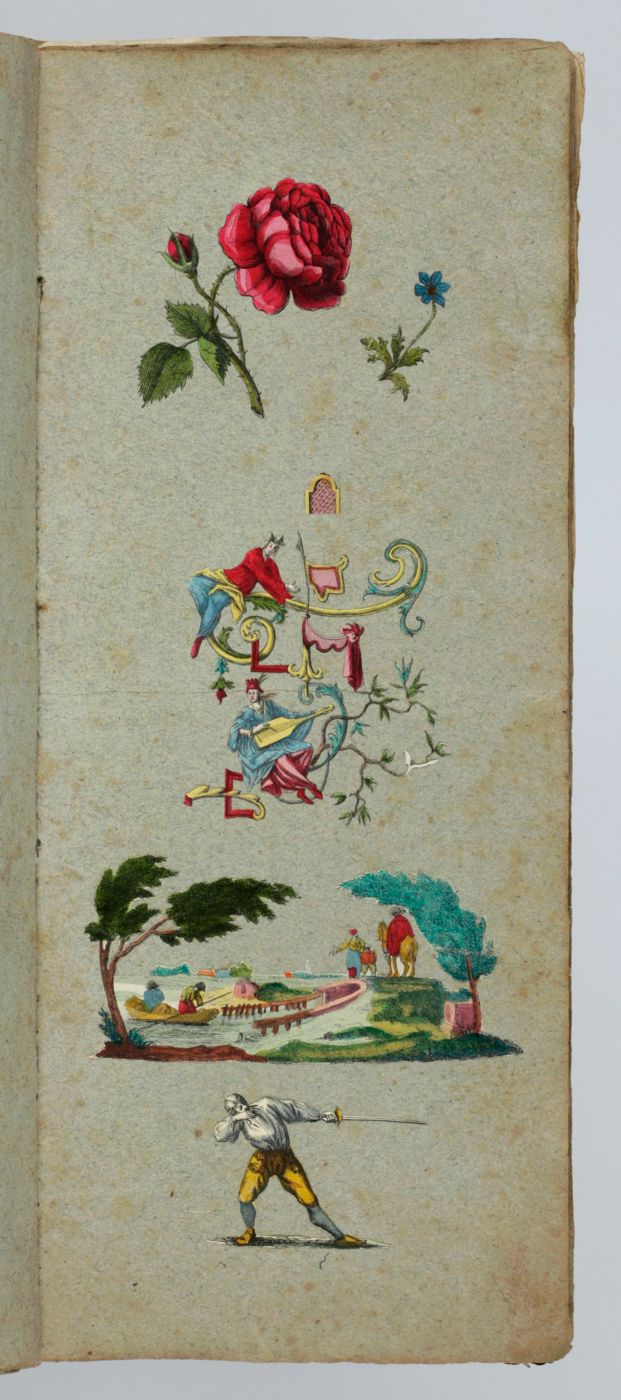 18th-century scrapbook with cut-out illustrations by Engelbrecht and/or other publishers.