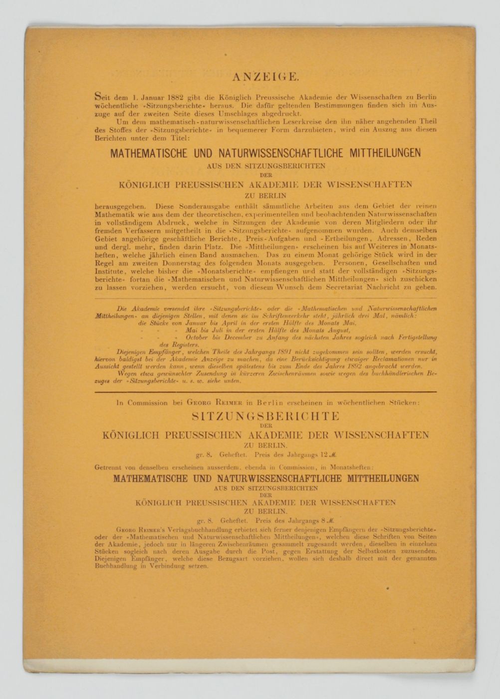 Berlin, Königliche Akademie der Wissenschaften (Georg Reimer), 1893. 8vo (26.5 x 19.0 cm). 5 pp. [numbered 3-7]. Original printed wrappers.