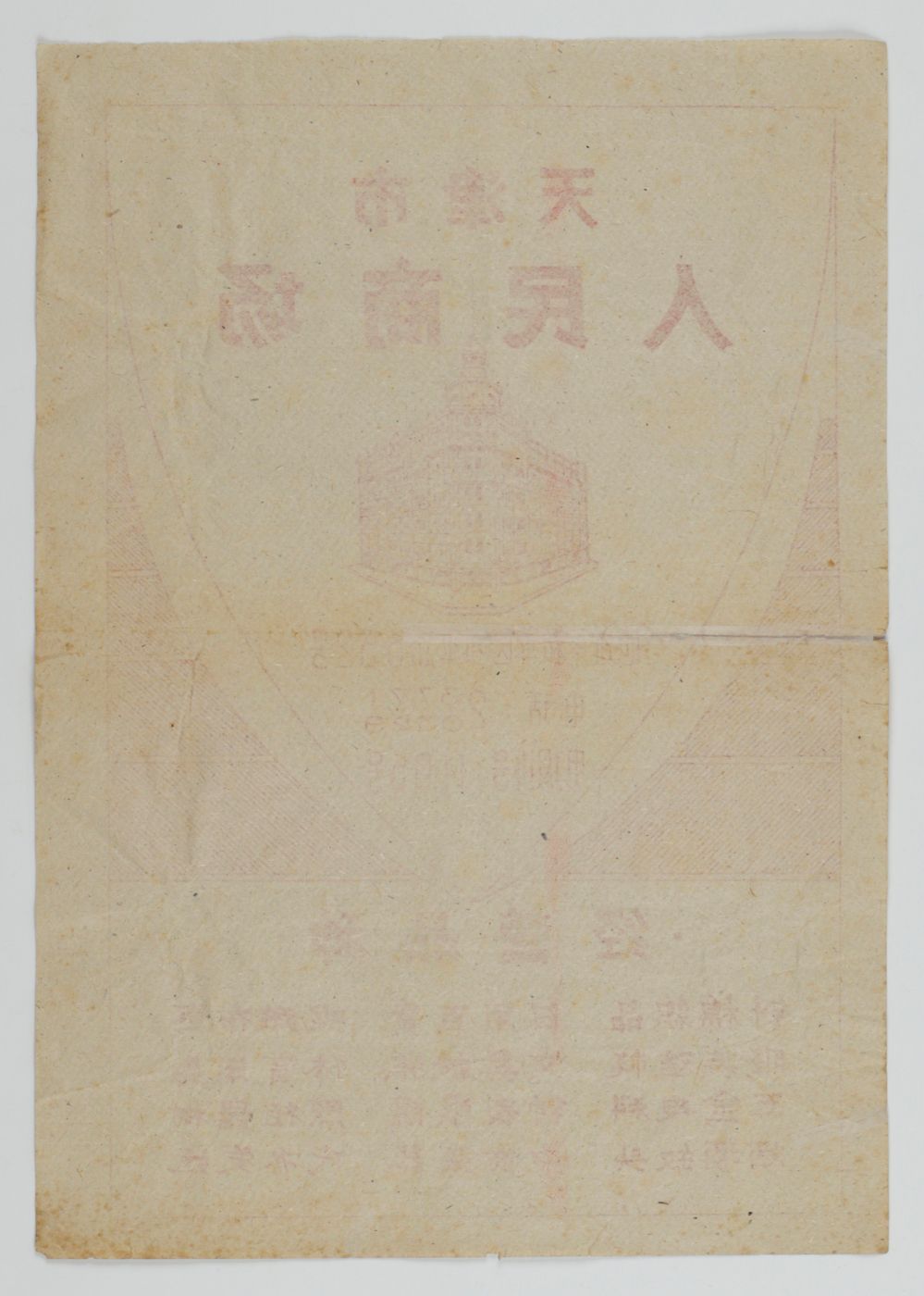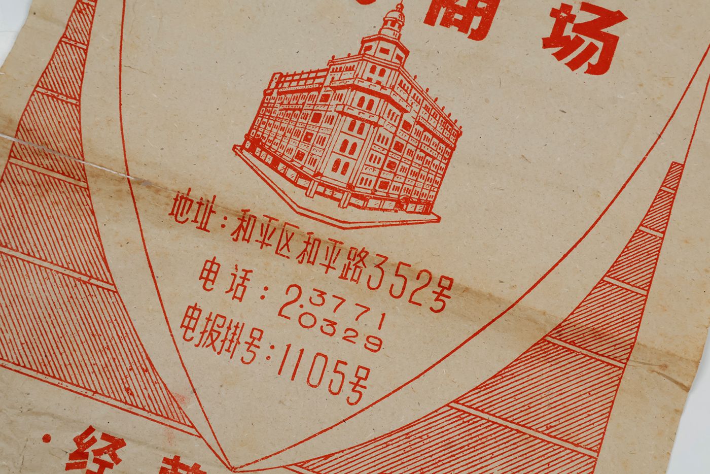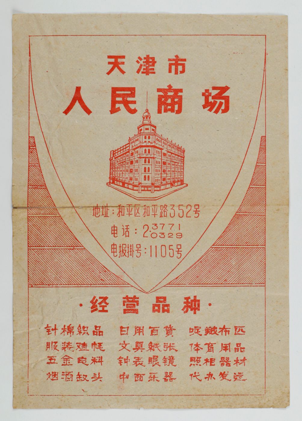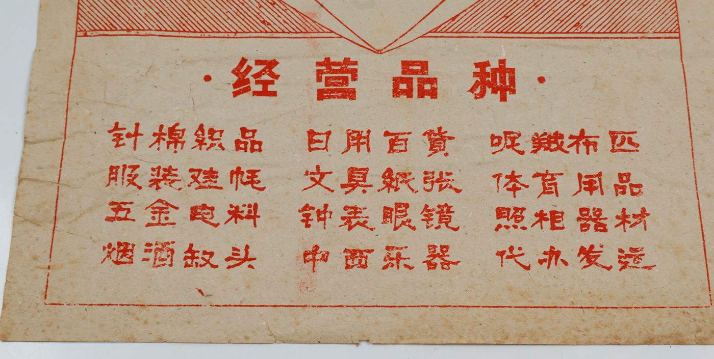 A very rare example of a poster and/or wrapping paper from a shopping mall in northern China, southeast of Beijing. The purpose-made building illustrated is in the so-called International style that was prevalent between ca. 1880 and ca. 1940. Many examples of this style are present in major cities around the world. And in China, long devoid of western influences on architecture and commerce, in particular along the famous Bund in Shanghai. Below the illustration is a list of product categories here on sale. Signs of age and use: creasing, several marginal tears; a few into the printed area, one longer, repaired (visible on verso). otherwise very good. It is rare to see this ephemeral object, nowadays.