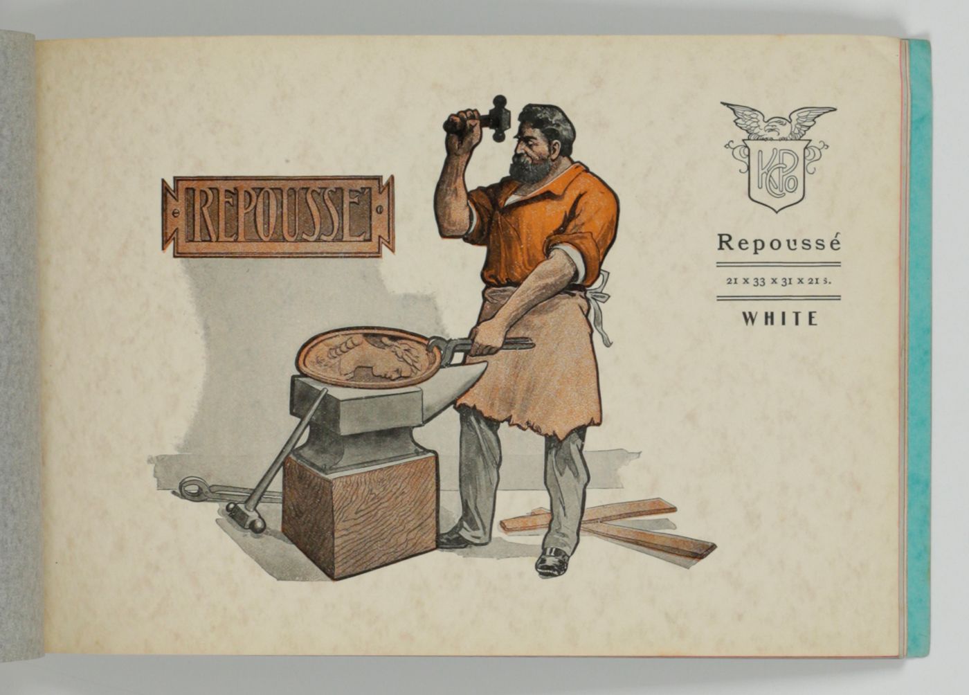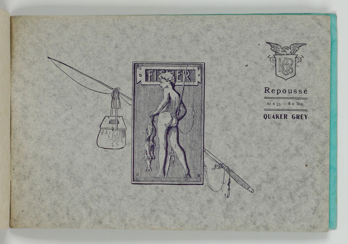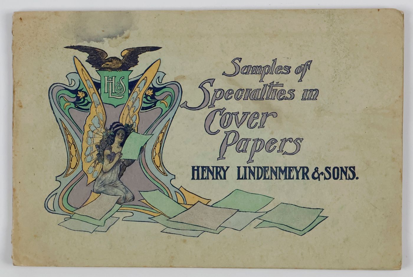Boston, MA, Griffith-Stillings Press [for Henry Lindenmeyr & Sons], ca. 1900. Oblong folio (17.0 x 25.5 cm). 38 paper samples, each named and illustrated with an appropriate vignette, of which several printed in two or more colours. Colour-printed soft cover, with large Art Nouveau vignette.