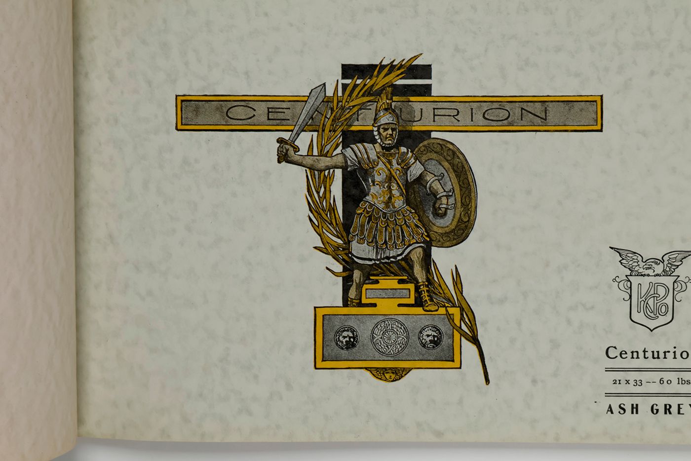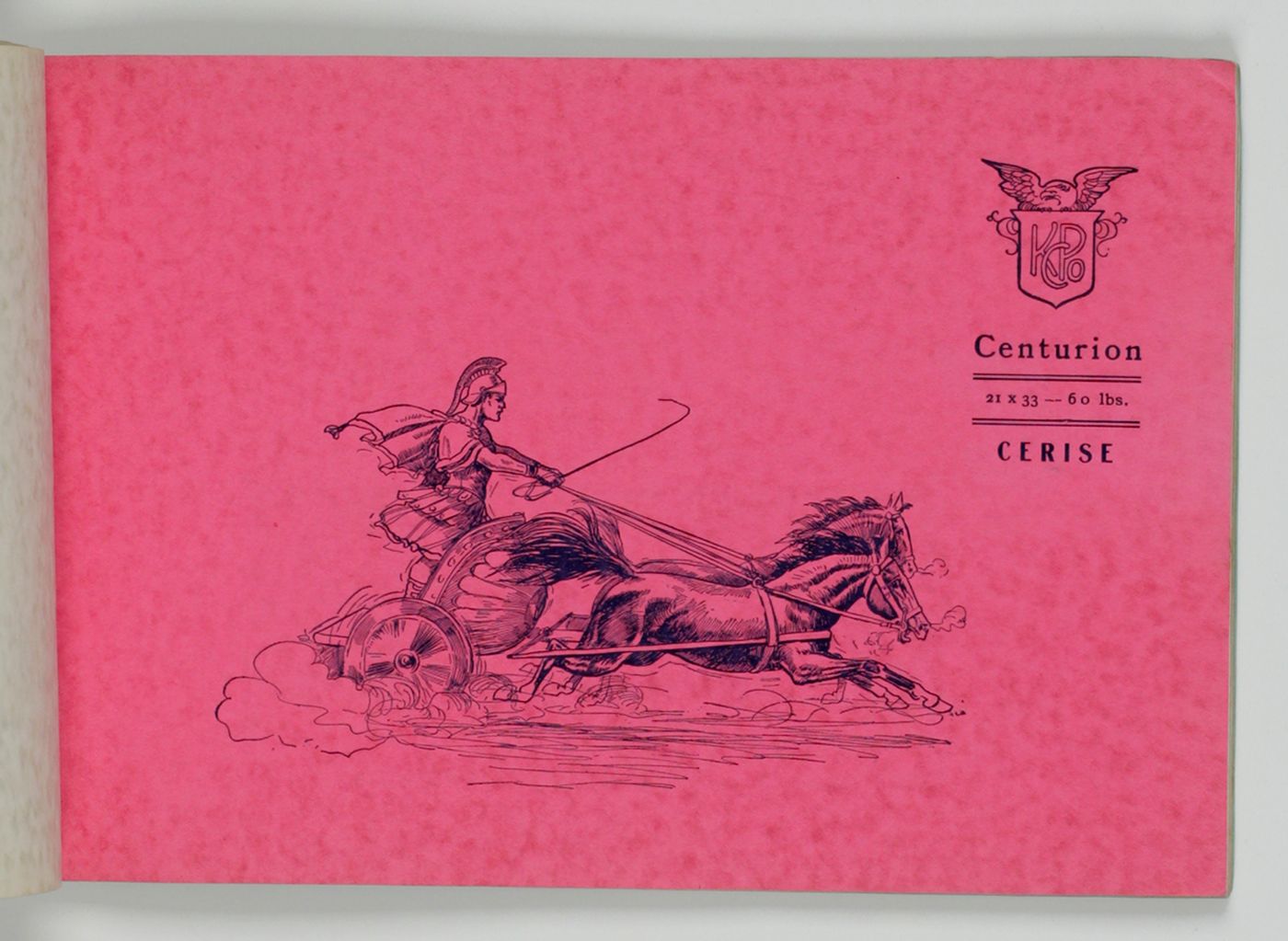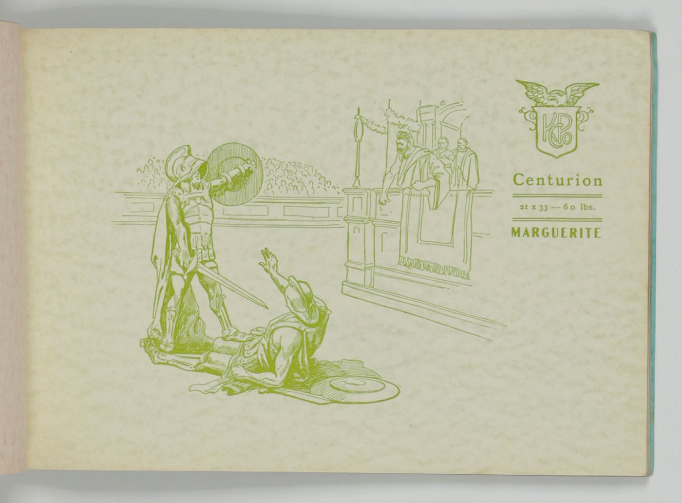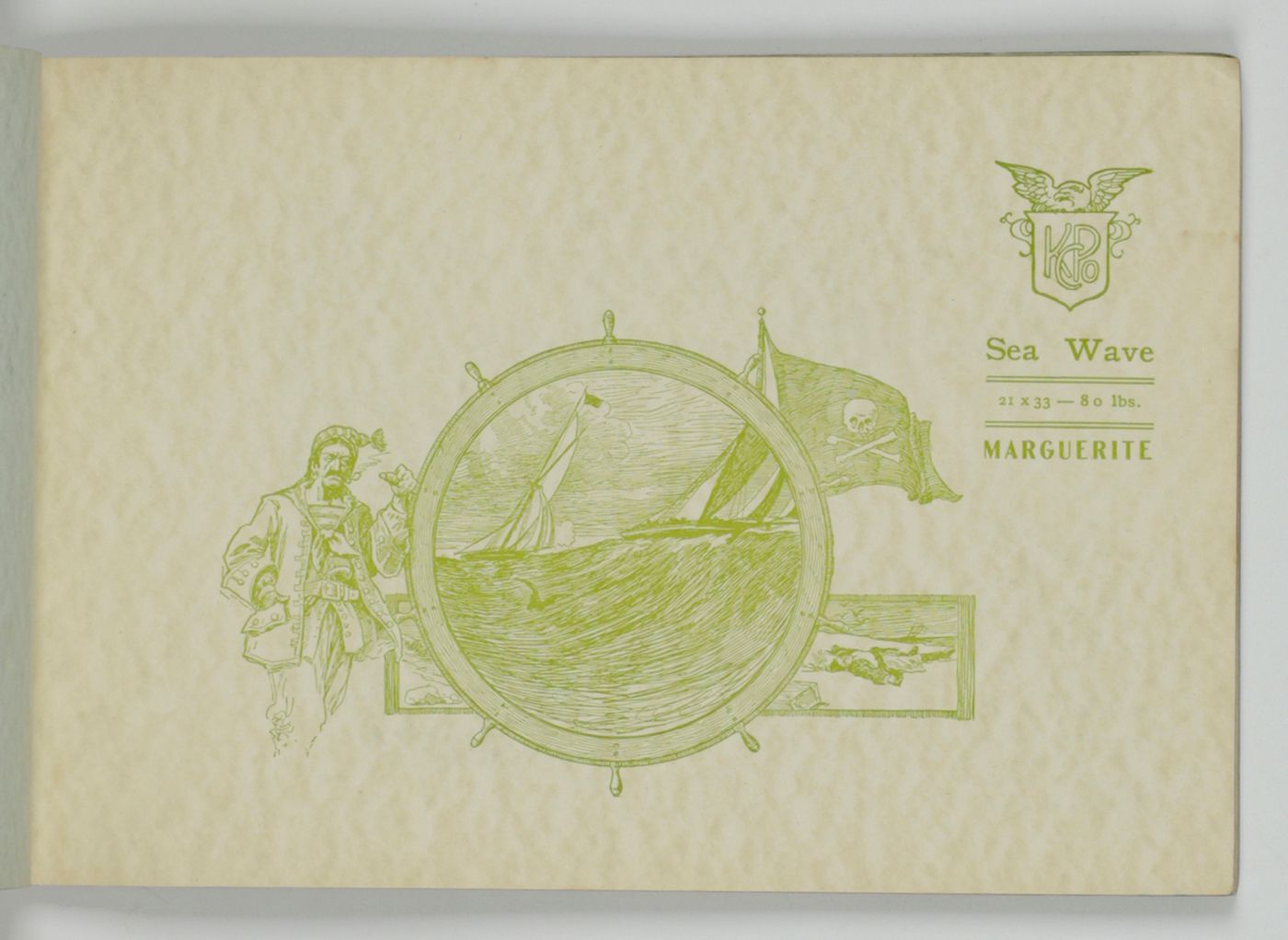A wonderful paper-sample book with highly unusual LARGE and detailed illustrations on each paper sample, each with a connotation to the paper name. For instance: pirates and ships at sea for a paper called "Sea Wave", or two gladiators fighting, for a paper called "Centurion". The two red paper samples bleeding, leaving small stains to the adjacent leaves. Small damp-stain to the front cover; some staining to the rear cover; spine ends abraded; top outer corner slightly bumped. Otherwise, a very good copy. Very rare, we found no other copy, anywhere.