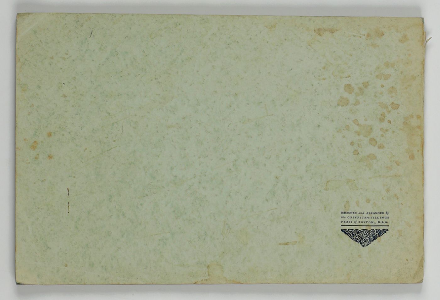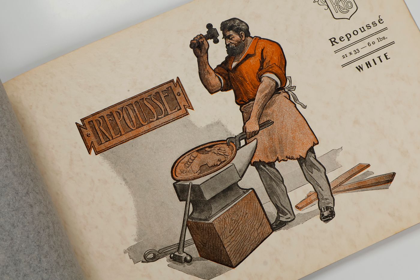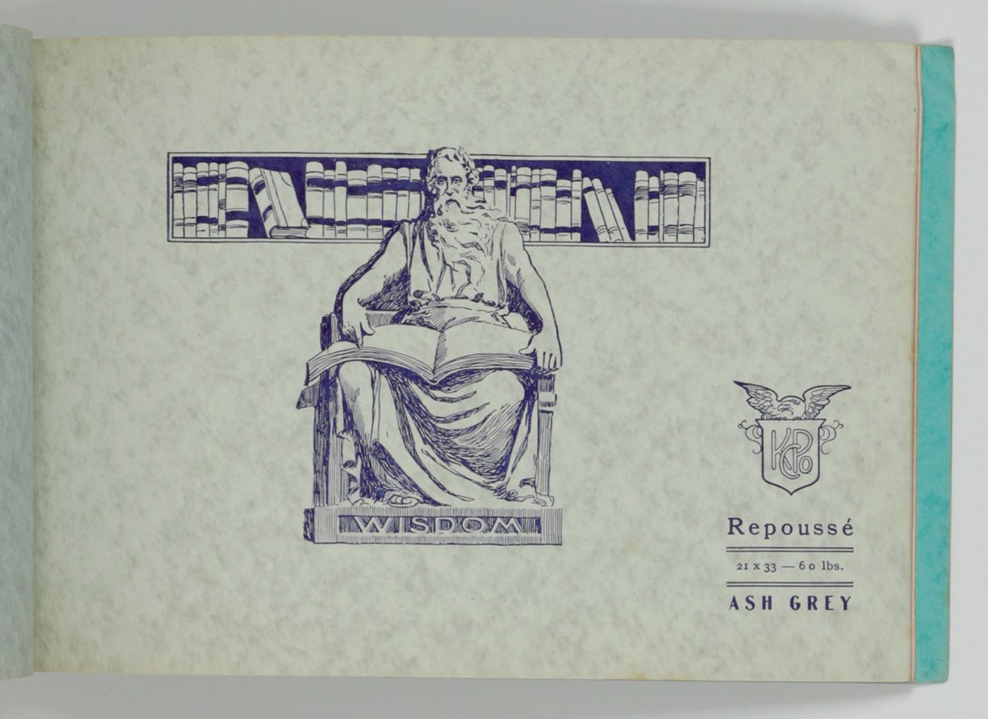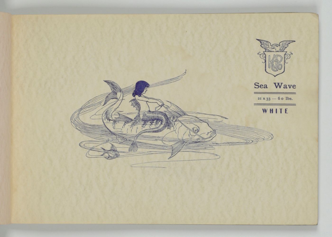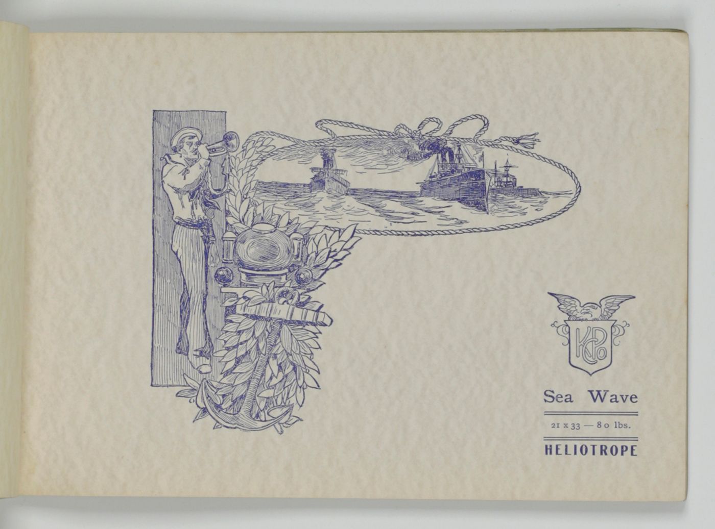 A wonderful paper-sample book with highly unusual LARGE and detailed illustrations on each paper sample, each with a connotation to the paper name. For instance: pirates and ships at sea for a paper called "Sea Wave", or two gladiators fighting, for a paper called "Centurion". The two red paper samples bleeding, leaving small stains to the adjacent leaves. Small damp-stain to the front cover; some staining to the rear cover; spine ends abraded; top outer corner slightly bumped. Otherwise, a very good copy. Very rare, we found no other copy, anywhere.