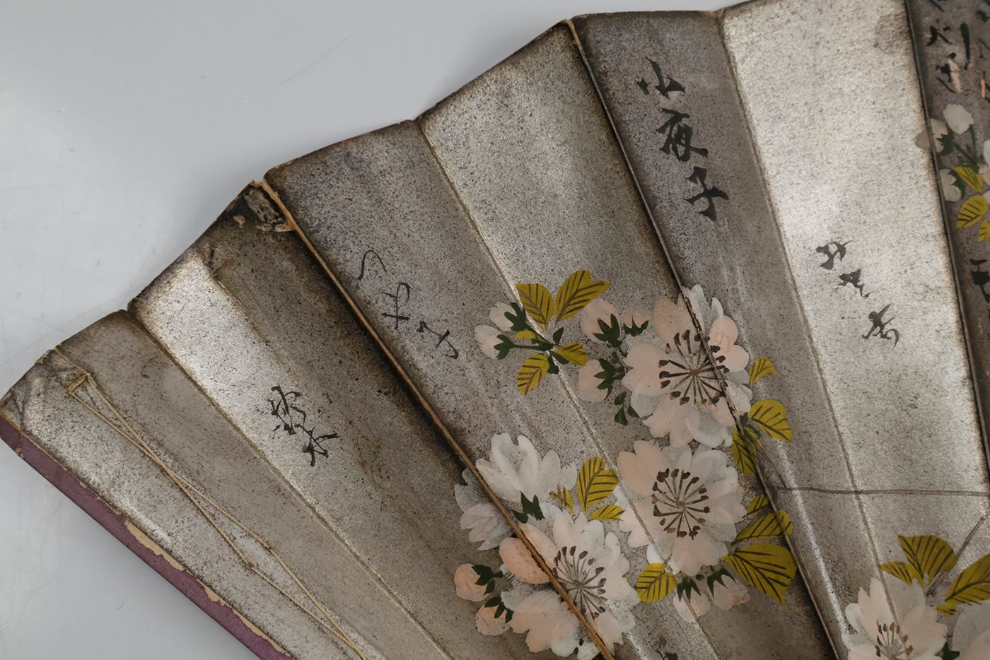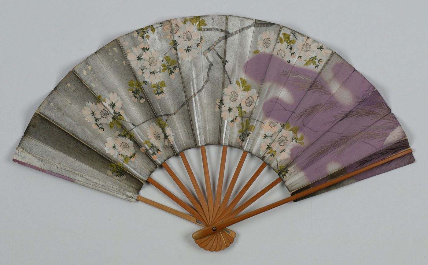 Indonesia, U.S.A, and France, various manufacturers, ca. 1900-1950. All made of wood. 1. Indonesia, Soerabaya, Wassimal Brothers, Toko Bombay Moerah. Pasar Toendjoengan 36 (21.3 x 2.8 x 1.1 cm, 28 ribs), floral pattern on outer ribs back side; 2. Idem, however, with a 26 instead of 28 ribs, a metal shackle, and a different floral design. 3. Washington, DC, Hotel Powhatan (21.3 x 2.4 x 1.1 cm; 23 ribs); outer ribs silver-printed, translucent rice paper, with floral pattern, heightened with silver and gold. 4. Clermont-Ferrand, Taillerie de Royat, 35 Rue Neuve près la Place Jaude. (21.1 x 1.9 x 2.0 (widest); 16 ribs. With a photoprint titled Taille des agates, showing factory workers processing agate gemstones. 5. (28.8 x 2.0 x 3.9 [widest point] cm); ten ribs. Floral patters over a silver background. Pochoir on both sides. With calligraphed Chinese texts referring to tea.