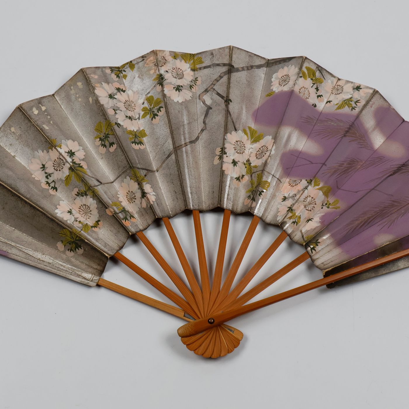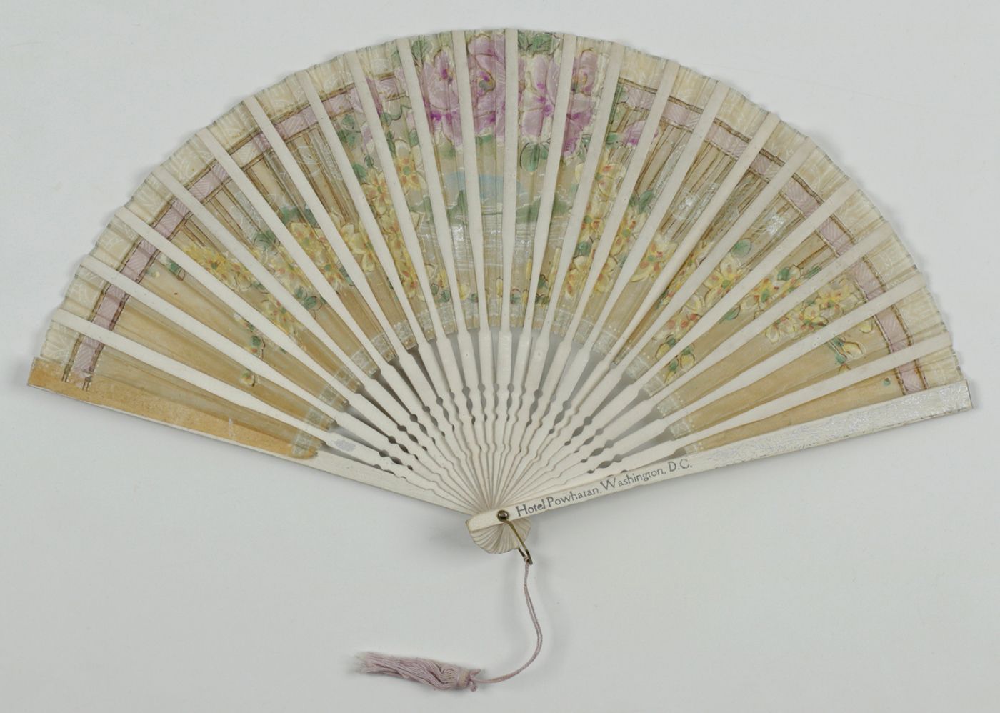 A wonderful collection of fans from America, Europe, and Asia. The first and second from the former Dutch East Indies, now Indonesia. Both with Dutch spelling (with oe instead of u), hence from before 1950. The third is from before 1977, but probably much older: "Designed by architect Frank Pierce Milburn, the Powhatan Hotel was built in 1911. It was located two blocks west of the White House on Pennsylvania Avenue, located on 18th Street between Pennsylvania Avenue and H Street. It, along with other hotels no longer in existence, was one of the better hotels in the city. It had an excellent view of the city from its roof deck which appears to have been popular. By the time buildings grew up around it obscuring its views, the Powhatan was dated. Ultimately, it was razed in 1977." (dckaleidoscope.wordpress website). The fourth was made in France for the upscale gem cutting firm Royat in Clermont-Ferrand, in the Auvergne region of central France. "The Royat gem-cutting workshop was founded in 1899 by Joseph Demarty, an engineer and mineralogist. In 1900, it became an industrial company: the Société Anonyme des Pierres Précieuses d’Auvergne (Auvergne Precious Stones Company). Demarty chose Royat, where wealthy individuals flocked from around the world to benefit from the spa treatments. The workshop prospered and opened branches in Cannes, Biarritz, and Paris. The Royat gem-cutting workshop offered jewellery and everyday objects in its stores, using precious stones such as amethyst and fluorite from Auvergne, opal, jade, and agate. The workshop was established on the site of two mills on the Tiretaine River and used waterwheels to power the red sandstone grinding wheels used to rough-cut the stones. The architect Jean Guillot (1889-1961), who designed several villas and apartment buildings in the city, constructed the new buildings in a rationalist style combining concrete, limestone, metal, and brick. They housed the workshops, offices, store, and the director's apartment. Since its closure in 2004, the stonecutting workshop has remained frozen in time: the machines and tools are preserved in the workshops and on the workbenches. The entire site was inventoried by the Henri-Lecoq Museum as part of the PASTEC (Scientific and Technical Heritage) mission launched by the Ministry of Culture." (Clermont-Ferrand website). The fifth fan, from China, or, possibly, Indonesia, with large Chinese populations, especially in large towns such as Jakarta, and Surabaya. The first with slight wear (narrow gap in one fold; otherwise, excellent; the second excellent. The third with short tears, and slight paper loss, here and there, otherwise very good. The fourth with the first rib partly split, ends of paper a bit frayed and chipped, otherwise very good. The fifth is arguably the best, both in terms of quality of the material and craftmanship, and in the state of preservation, with only some minor wear to the fold's edges. In all a remarkable, diverse collection.