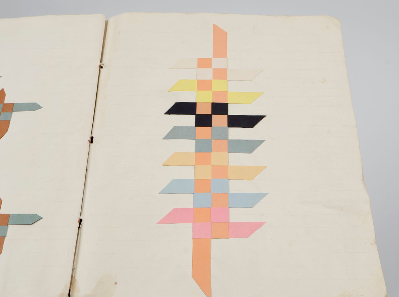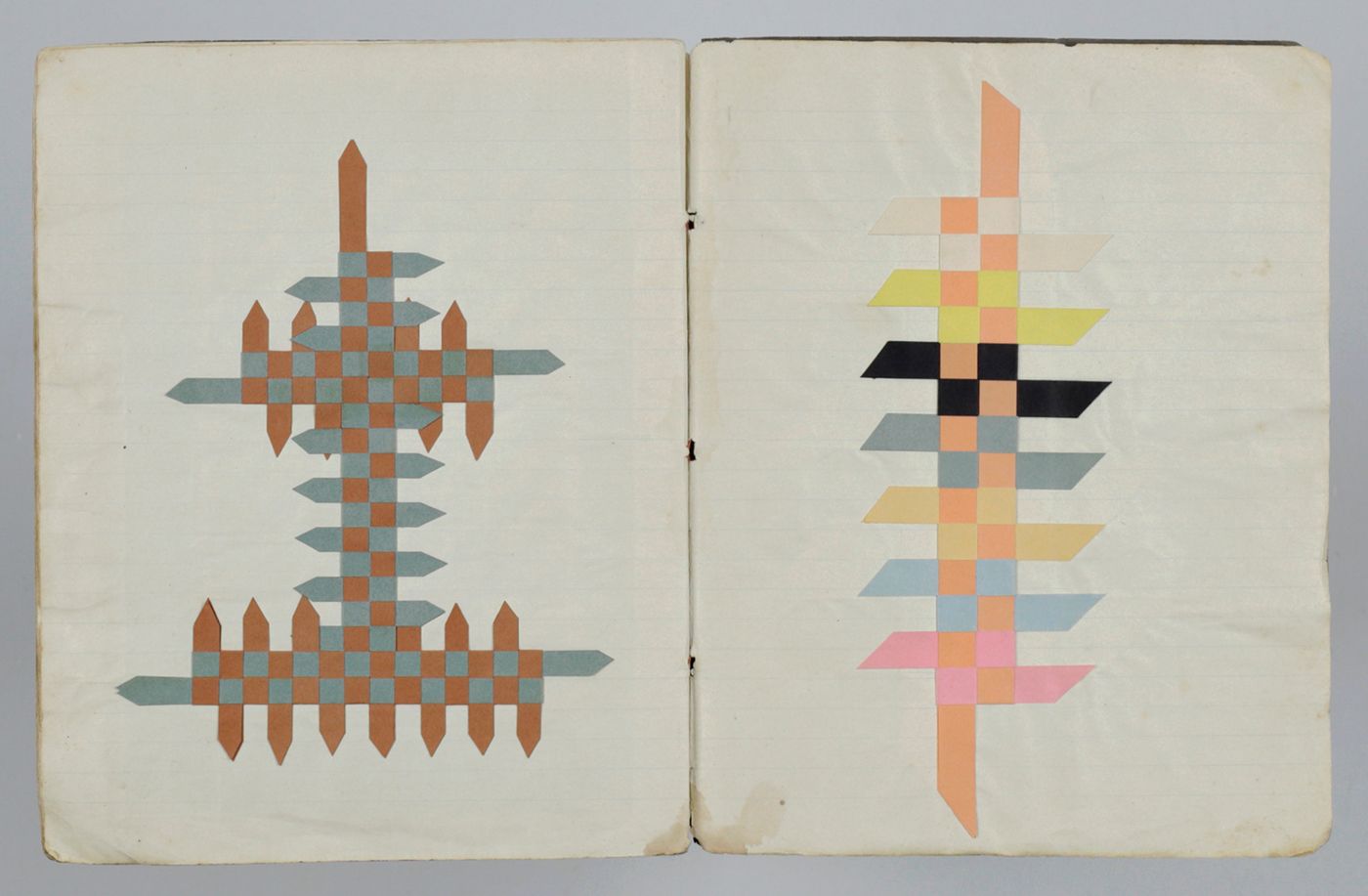St. Jacobi Parochie [The Netherlands], W. Dijkstra, ca. 1915-1920. School notebook (21.0 x 16.5 cm). 18 pp., each with colourful samples of paper weavings on recto and verso (36 in total). Plain wrappers with blue and white octagonal label pasted on the front wrapper, and name and place hand-written in ink.